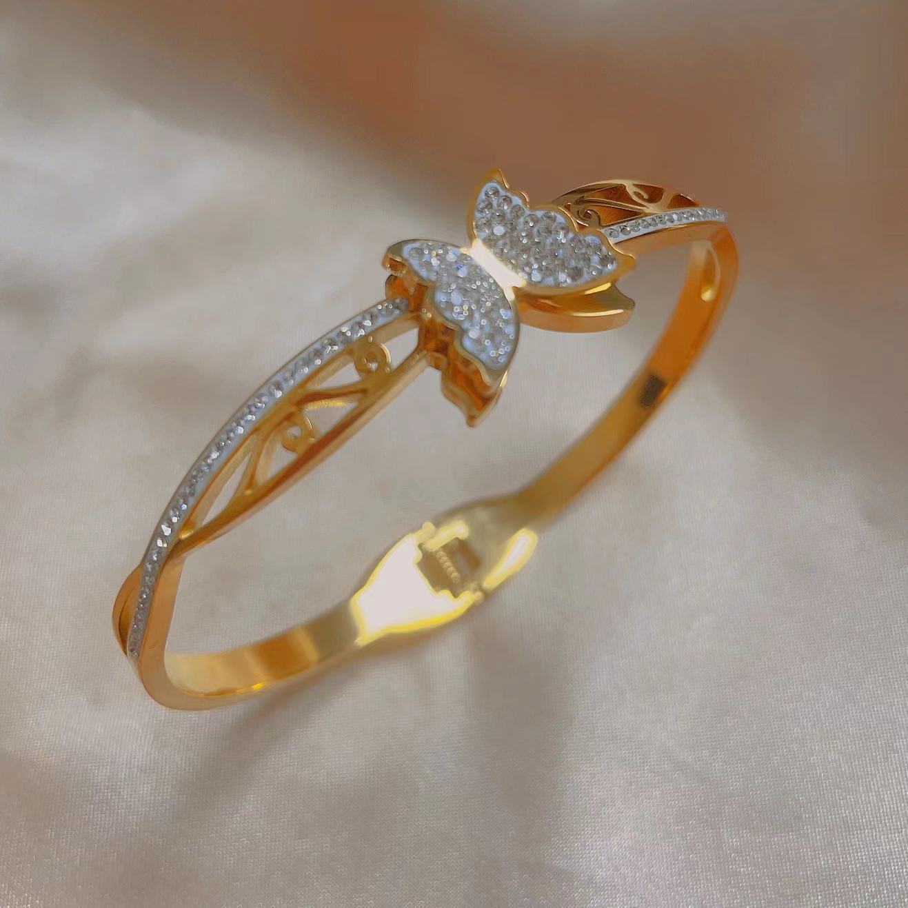 Moda coreana acero inoxidable resorte mano joyería diamante mariposa acero titanio pulsera mujer simple nuevo pulsera de oro