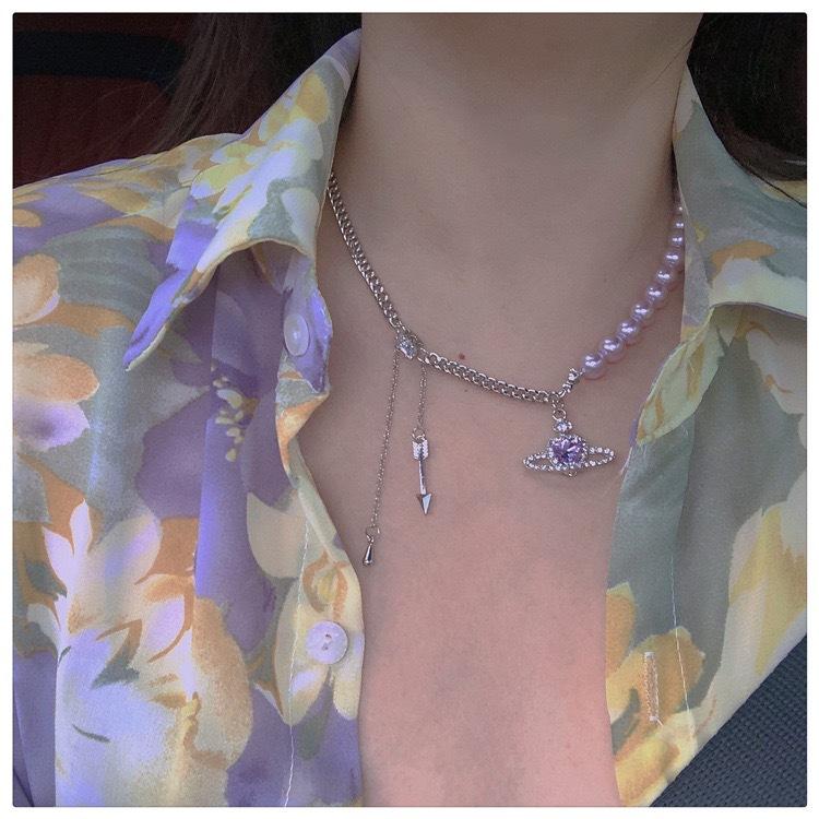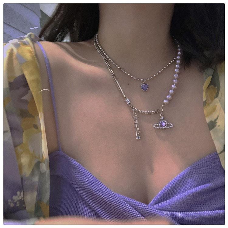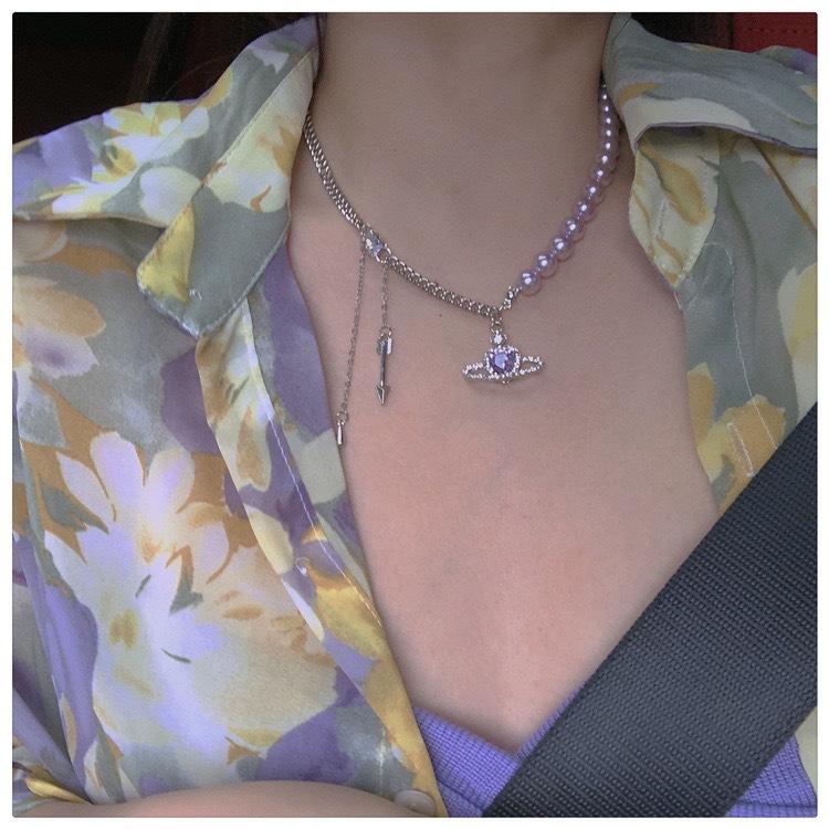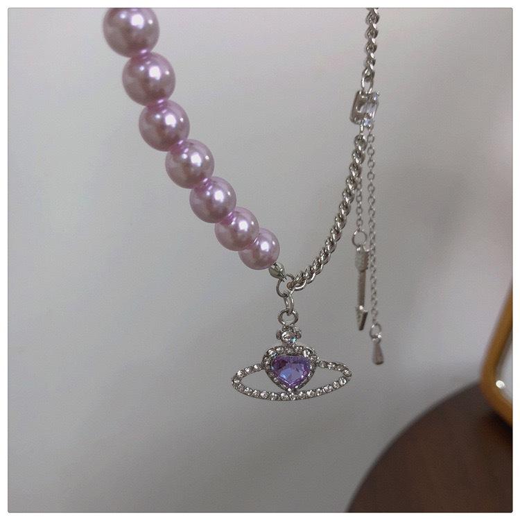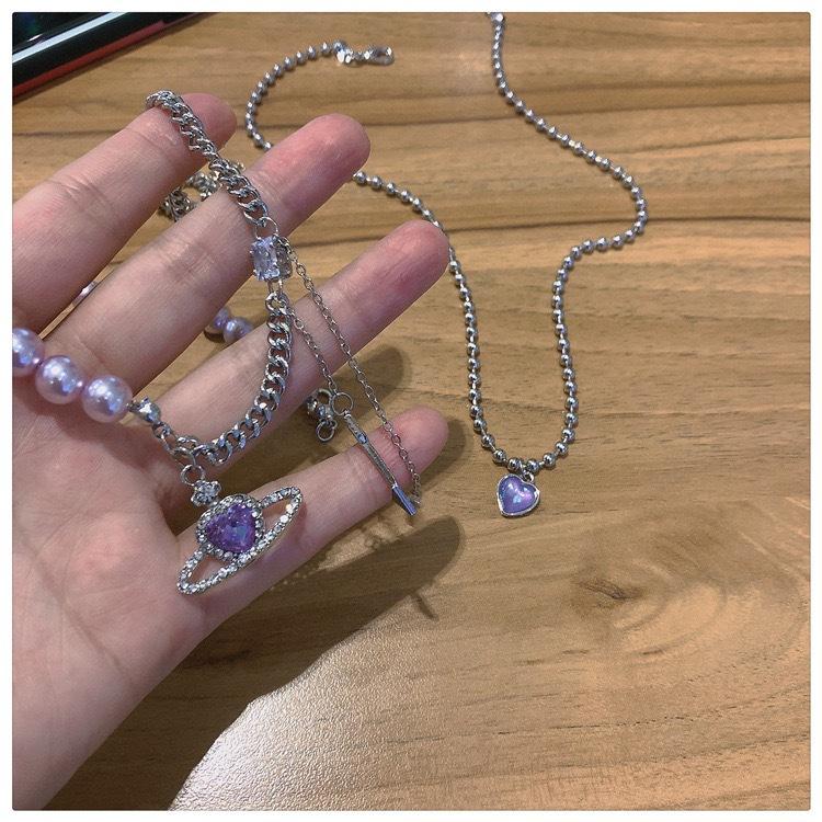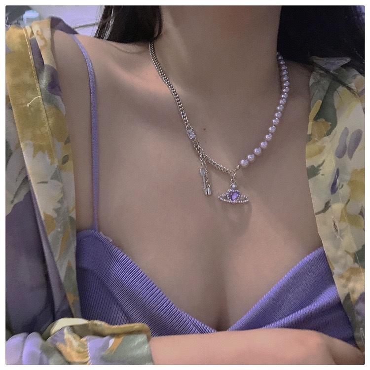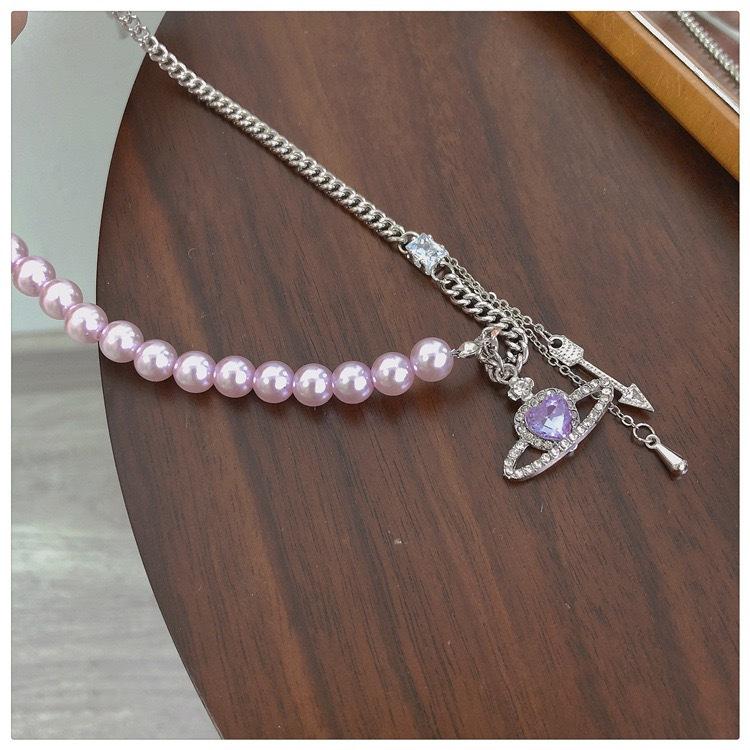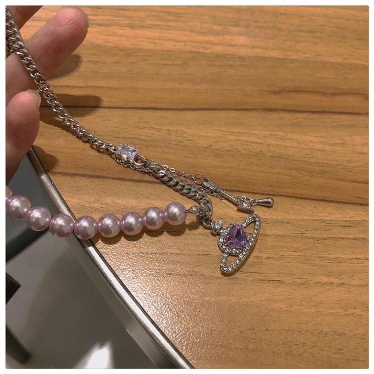 Collar con costuras de perla púrpura, diseño pequeño, romántico, con circonitas, amor y universo, con temperamento dulce y fresco de ensueño.