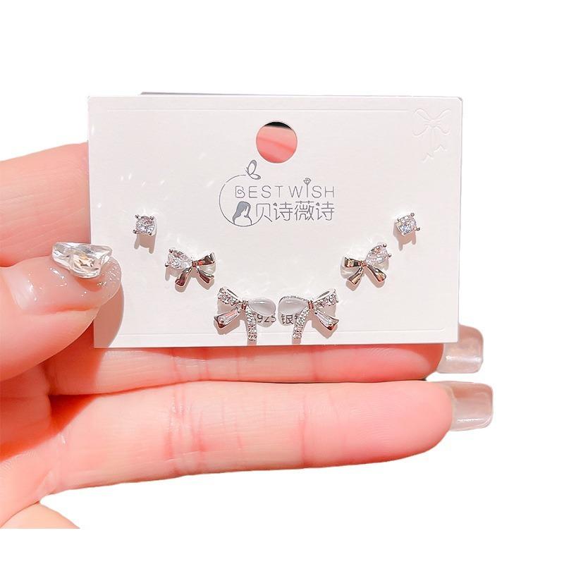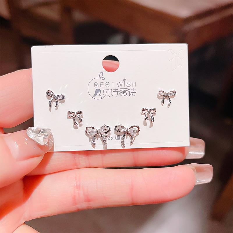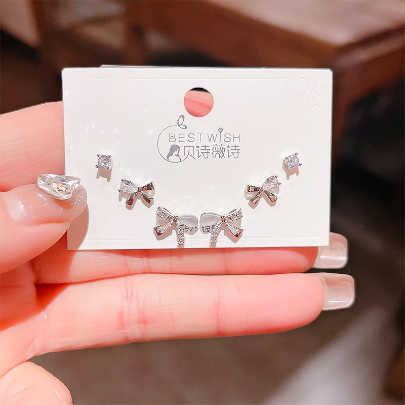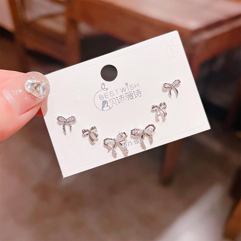 Exquisitos y lindos pendientes de botón de circonita con lazo, tres pares de pendientes de botón pequeños para mujer, estilo coreano, ligeros, de lujo, súper llamativos, juego de 6 piezas