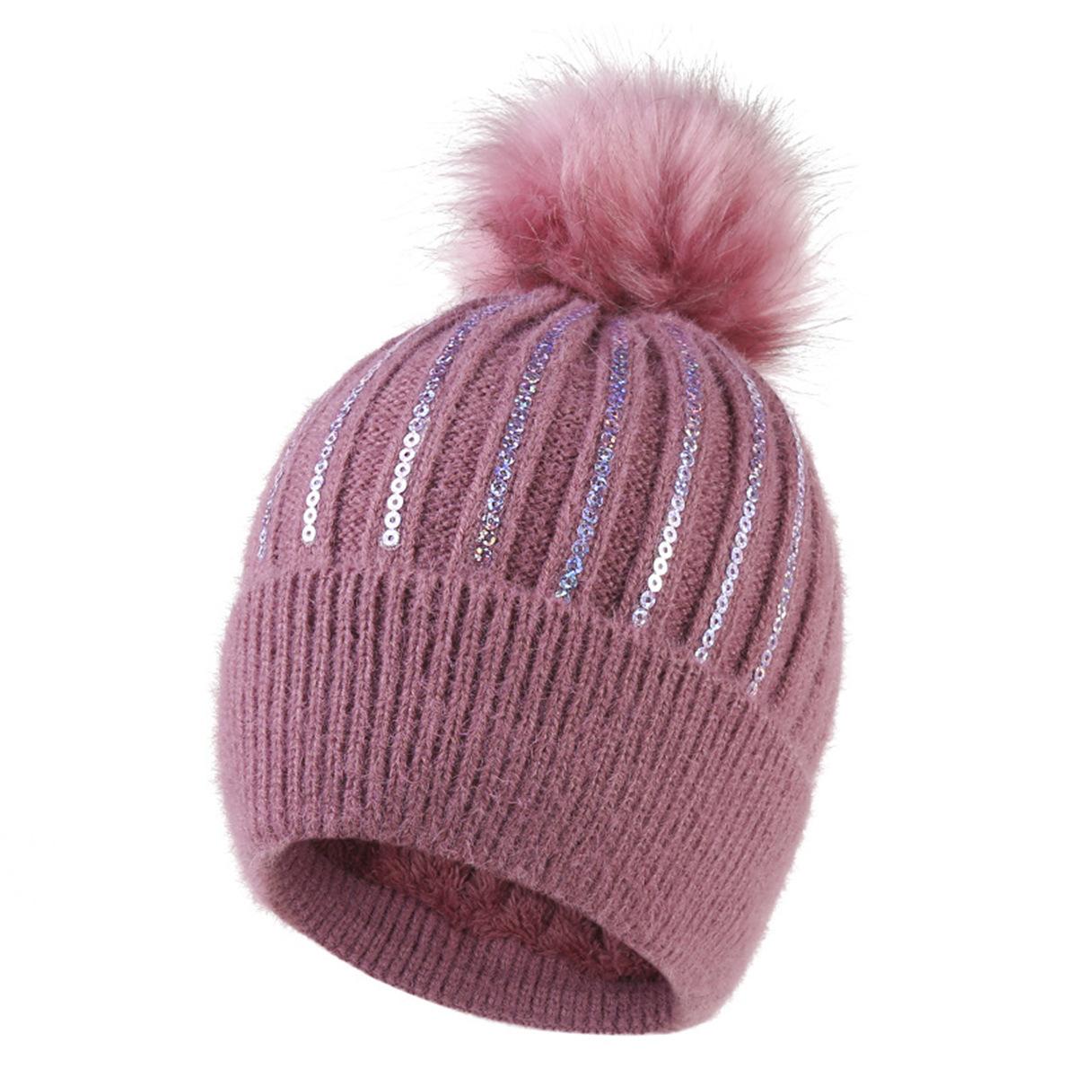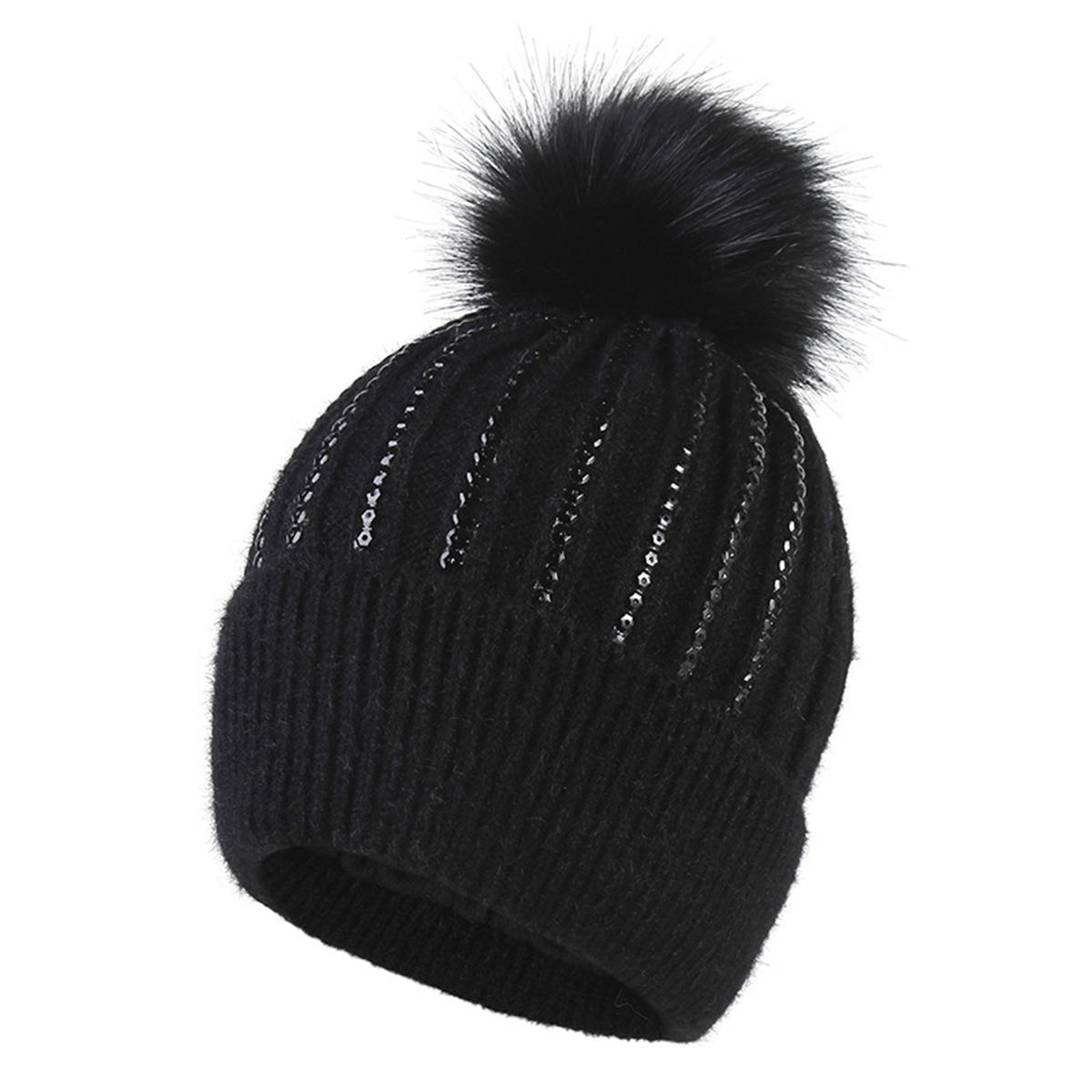Compra Gorro de lana para mujer, de otoño e invierno, con forro polar, grueso y cálido, con bola de pelo y lentejuelas, tejido, para ciclismo, con protección para los oídos, resistente al viento y suave. al por mayor en Joom.pro