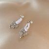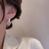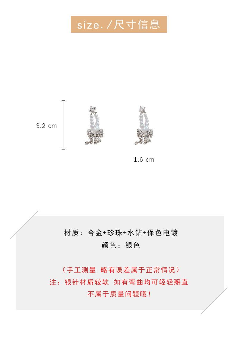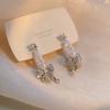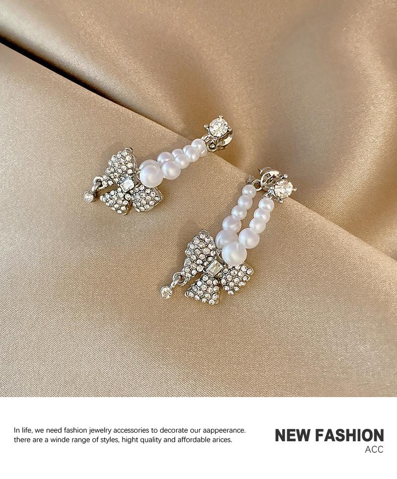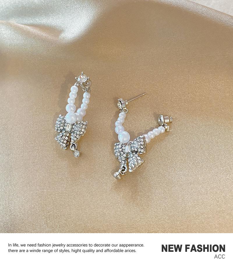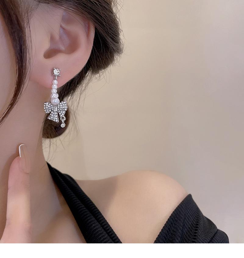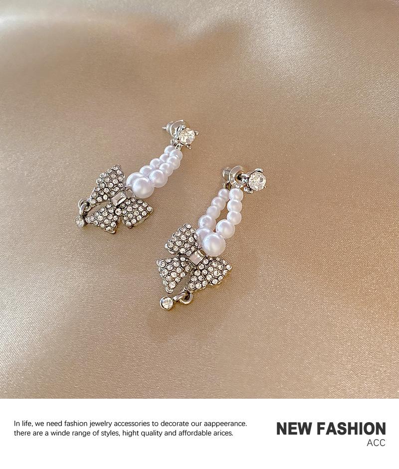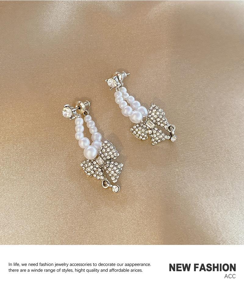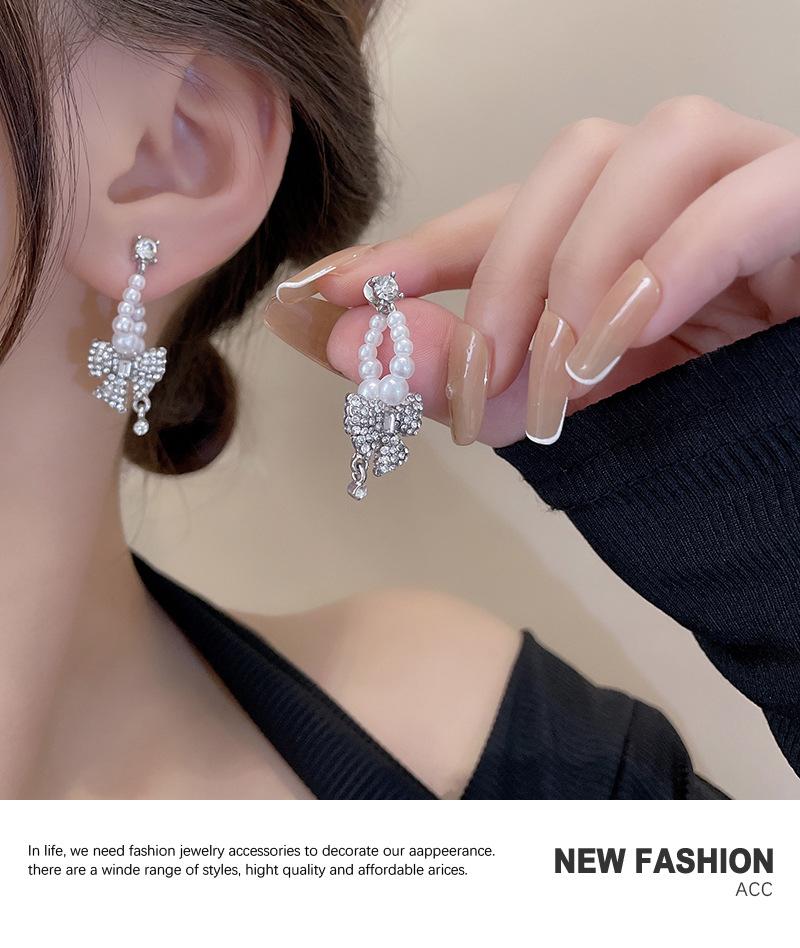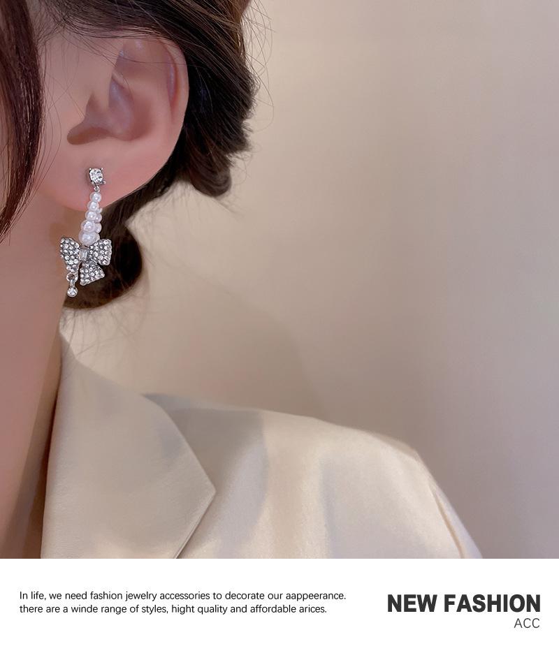 Pendientes de plata con forma de aguja, perla y lazo de diamantes, diseño de moda francesa, pendientes de nicho, pendientes de viento frío, venta al por mayor