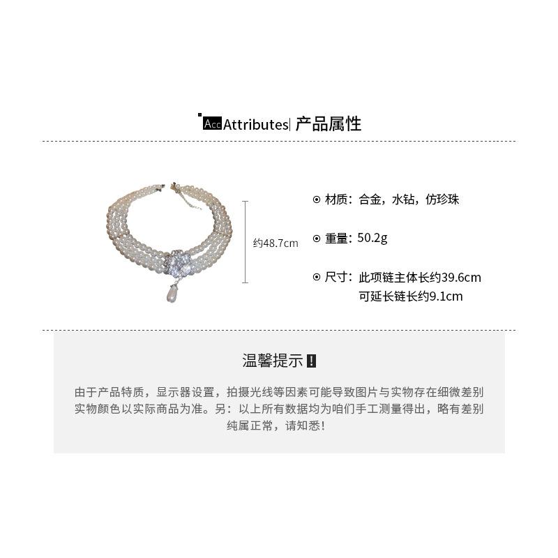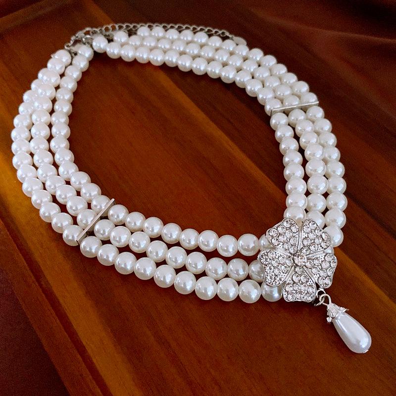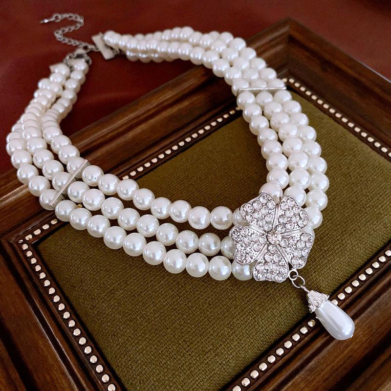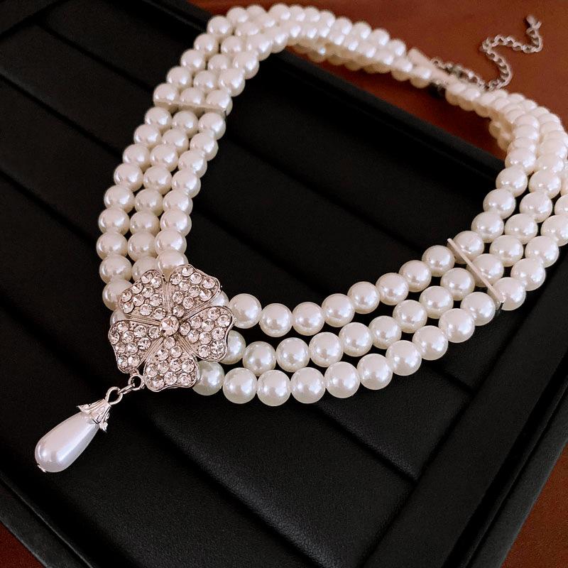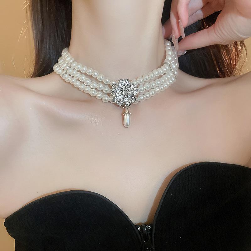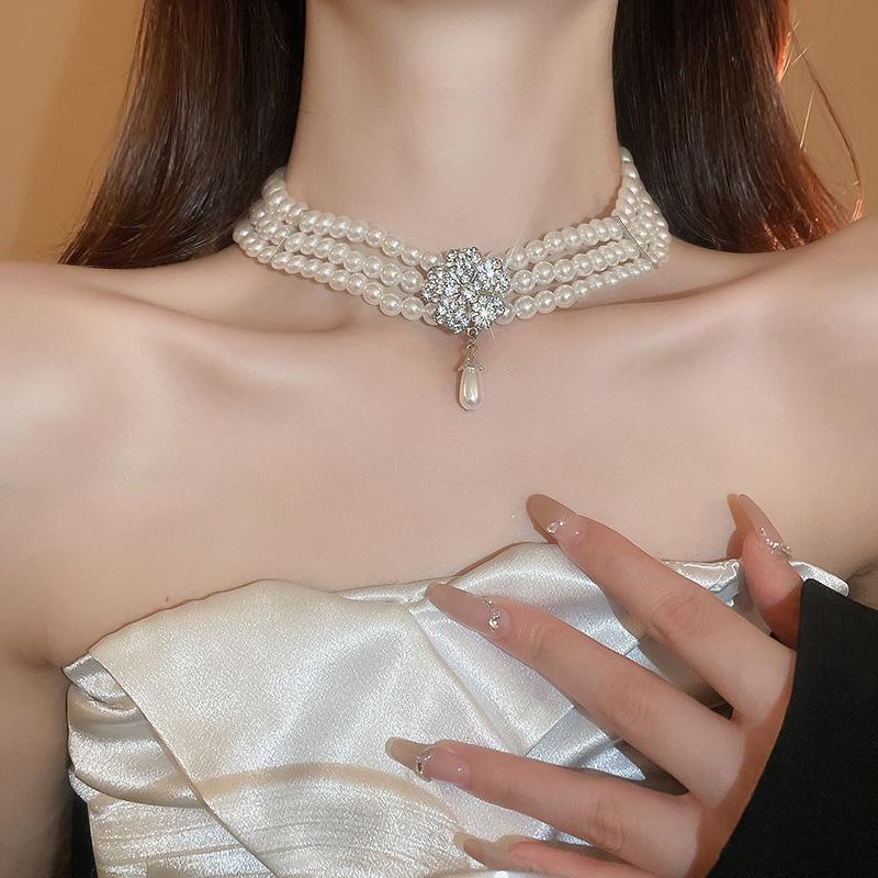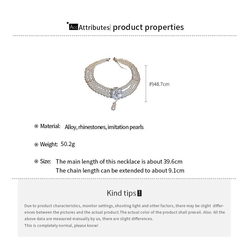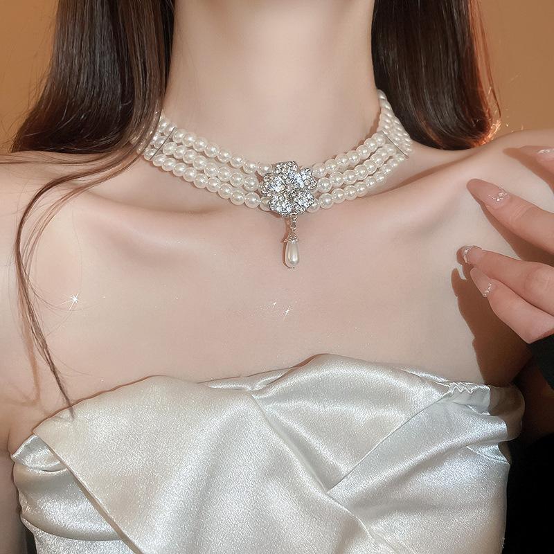 Collar de Clavícula Multicapa de Estilo Lujo Ligero con Flor Incrustada de Diamantes y Gota de Agua de Perla Imitación, Collar de Alta Gama Estilo Palacio Francés para Mujer