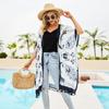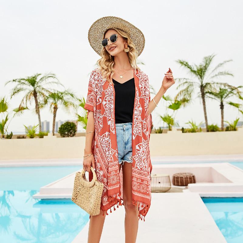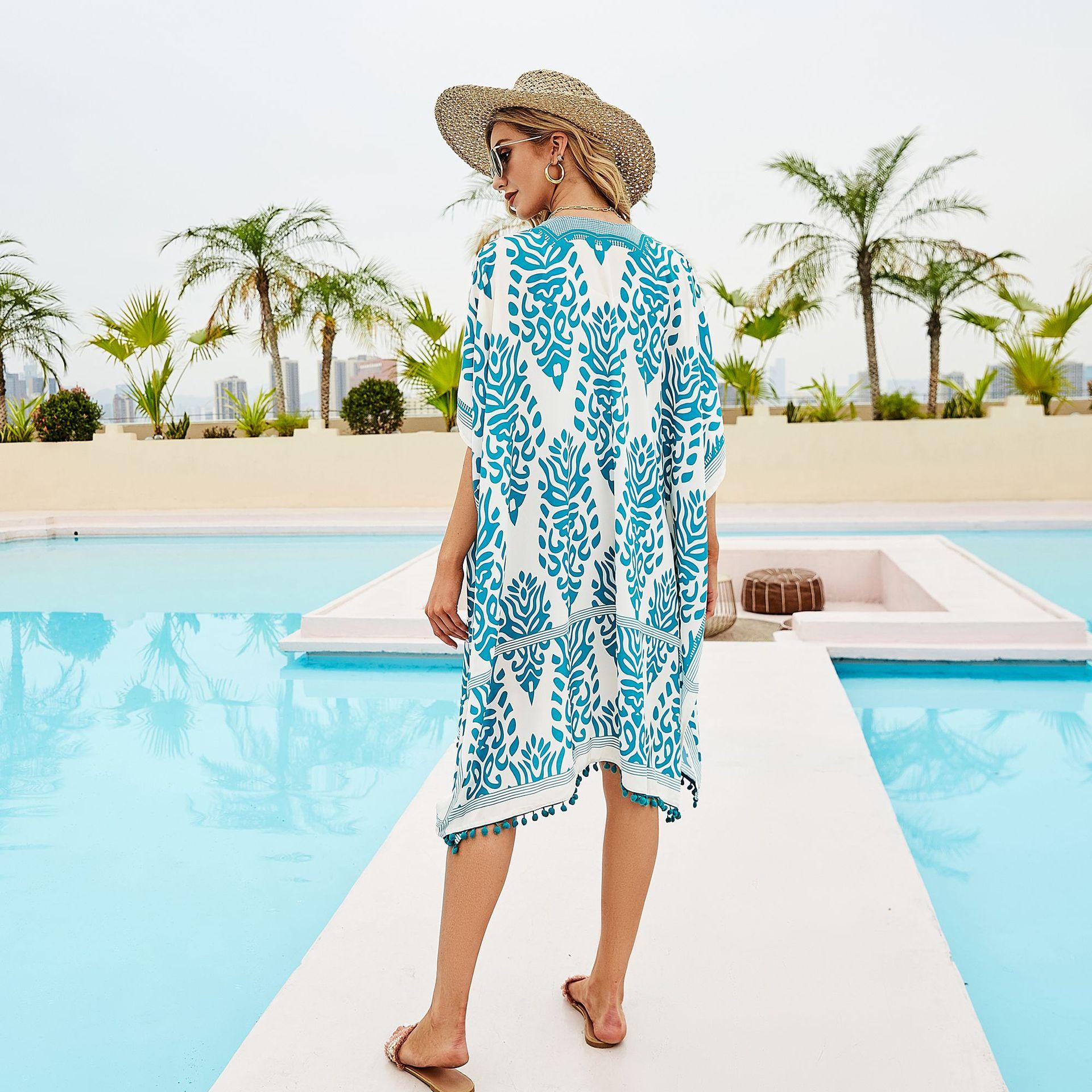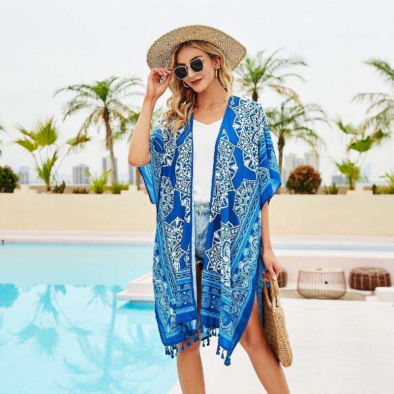 Cárdigan playero nuevo para mujer, camisa de gasa estampada para vacaciones en la playa, traje de baño europeo y americano, ropa de protección solar, pareo con borlas
