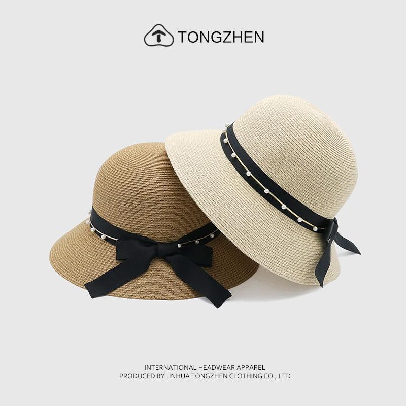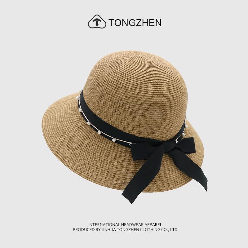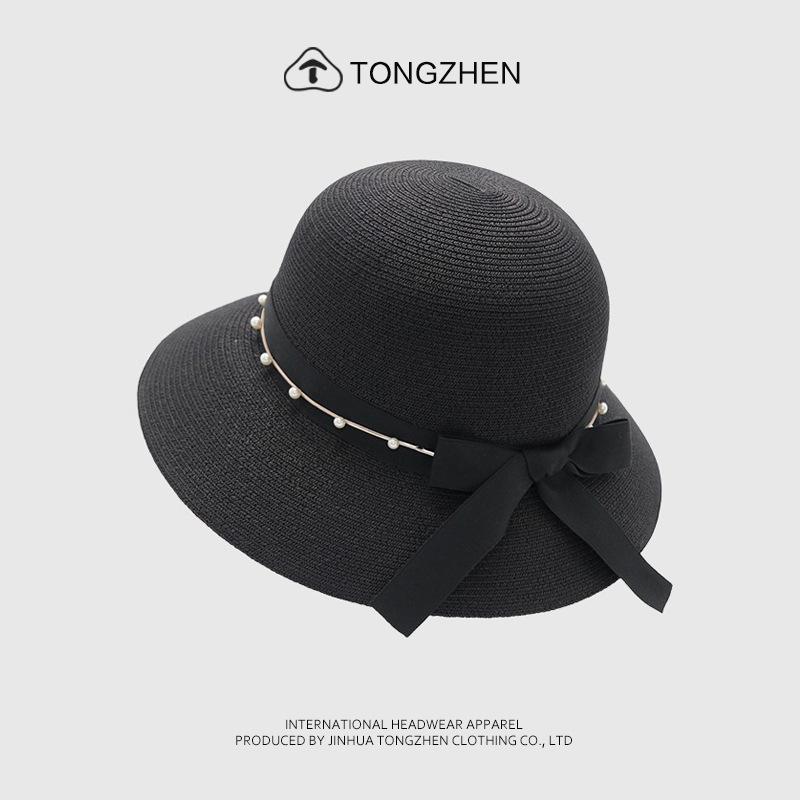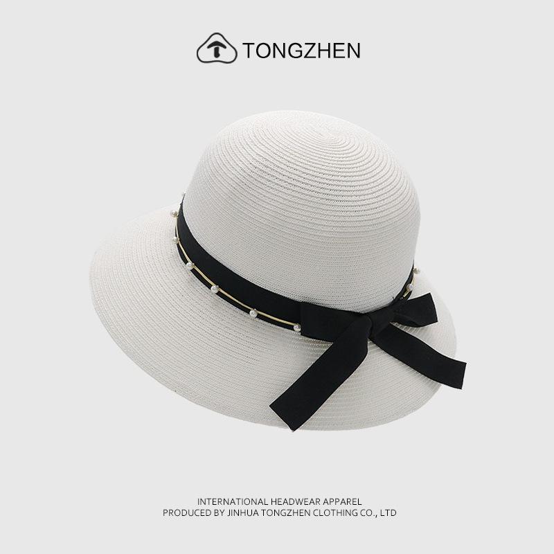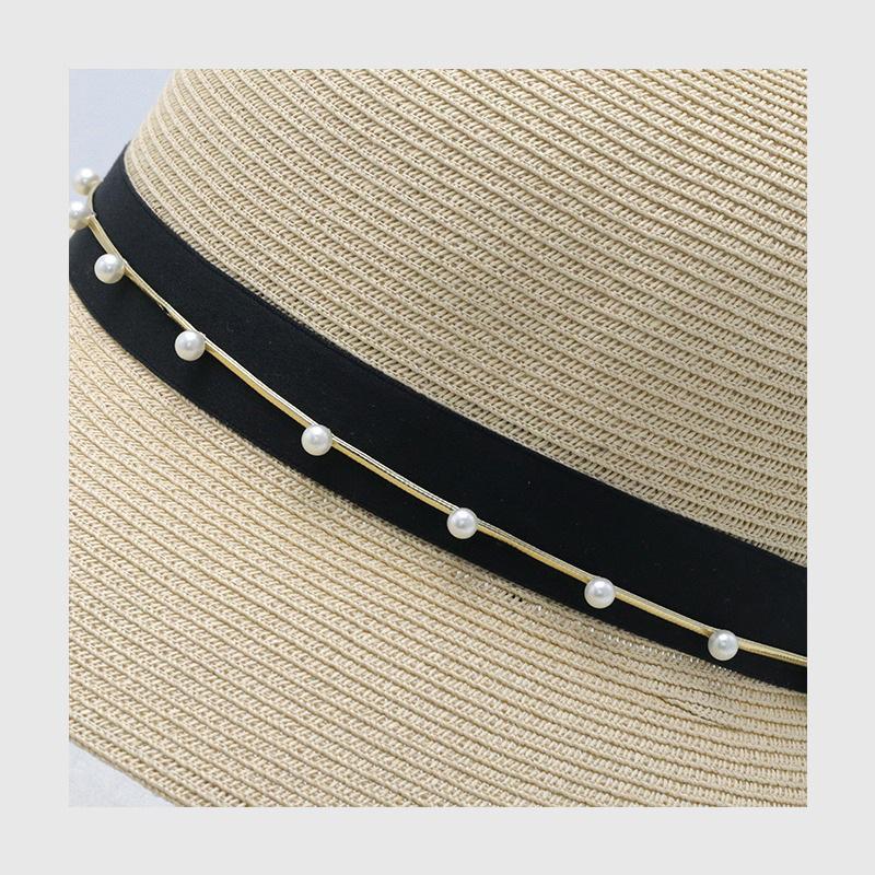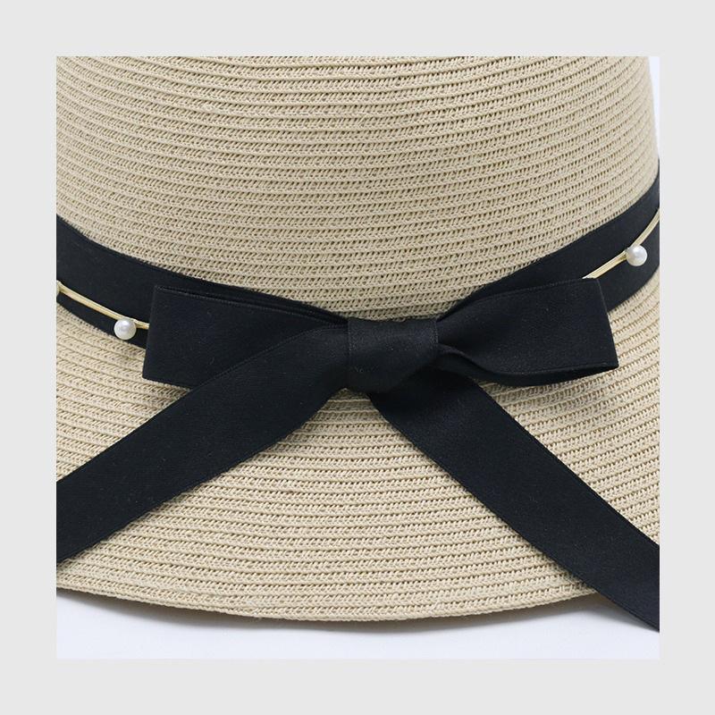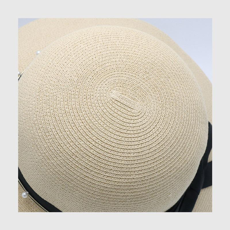 Sombrero de paja elegante de verano estilo Hepburn para mujer, con lazo de perla, para fotografía de playa francesa, sombrero de protección solar