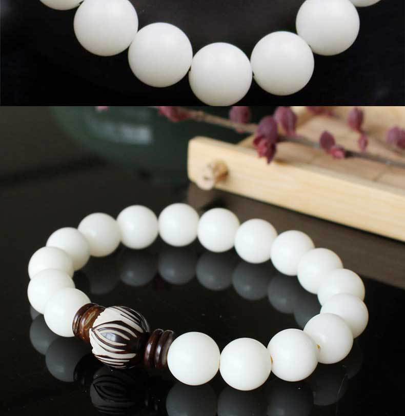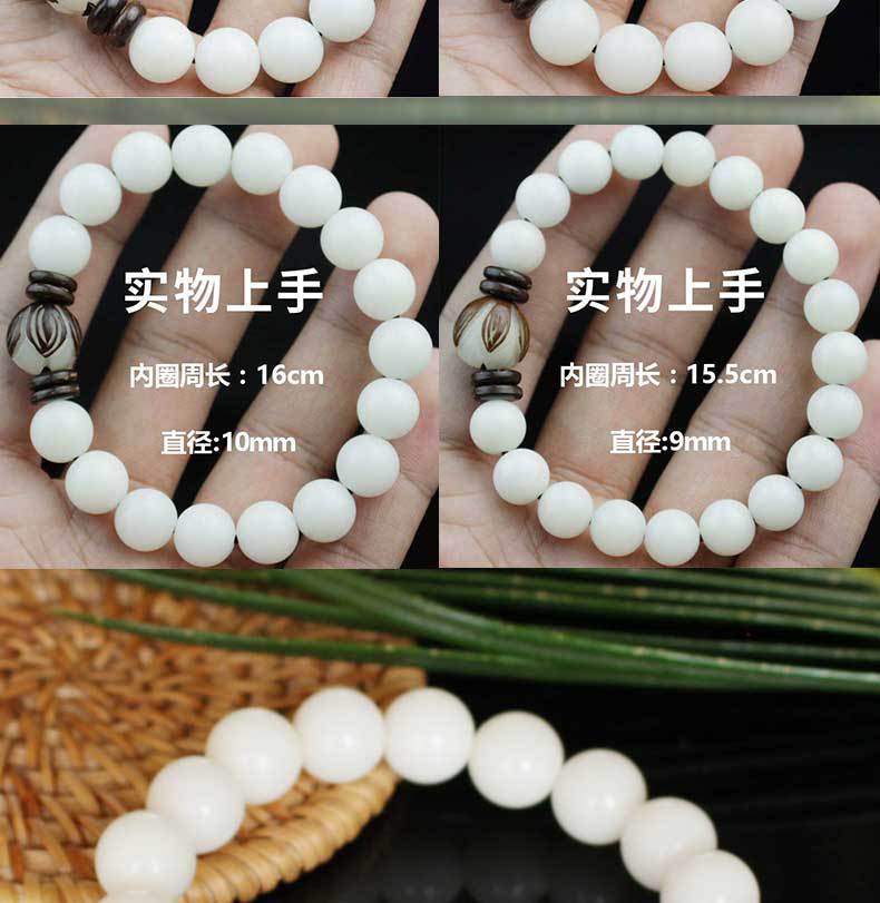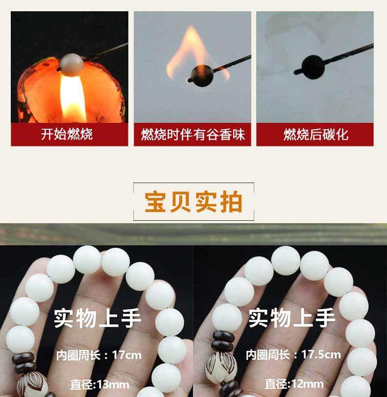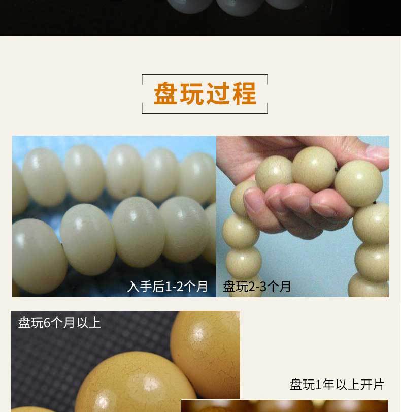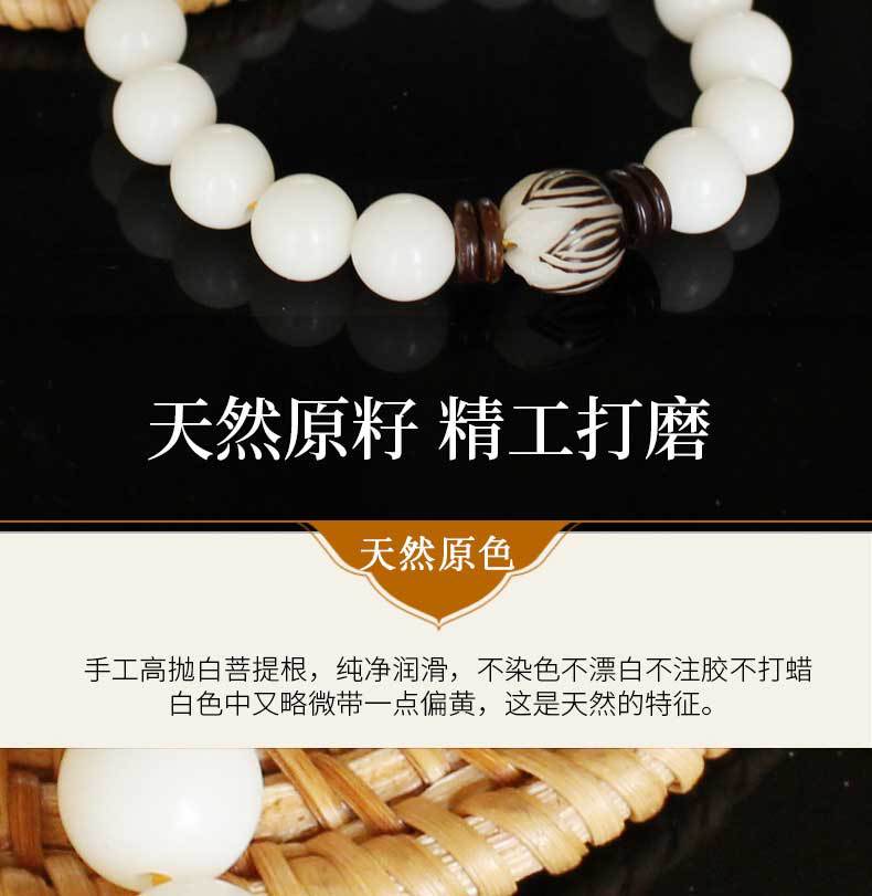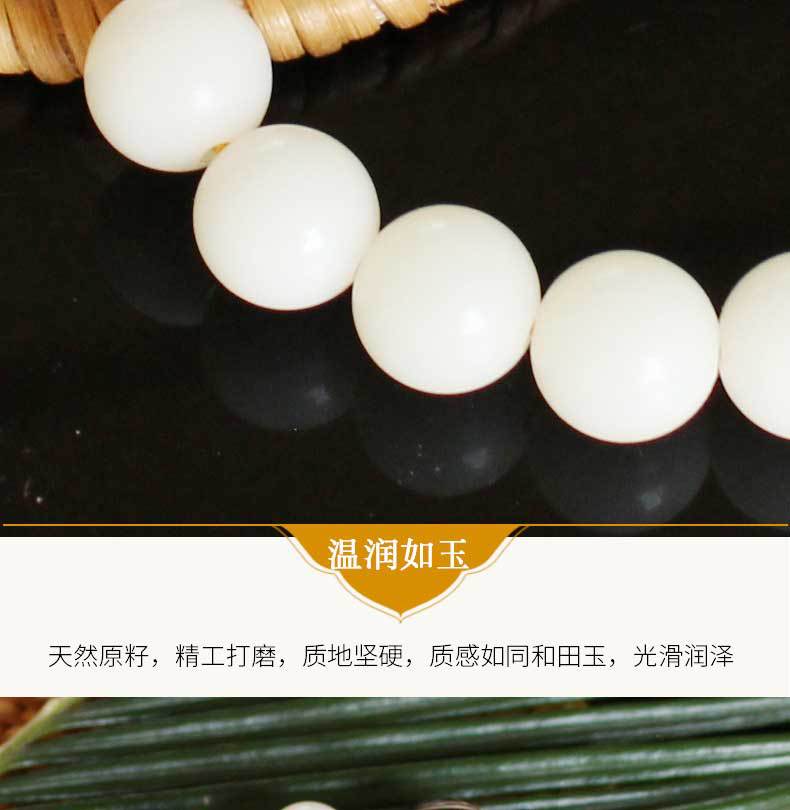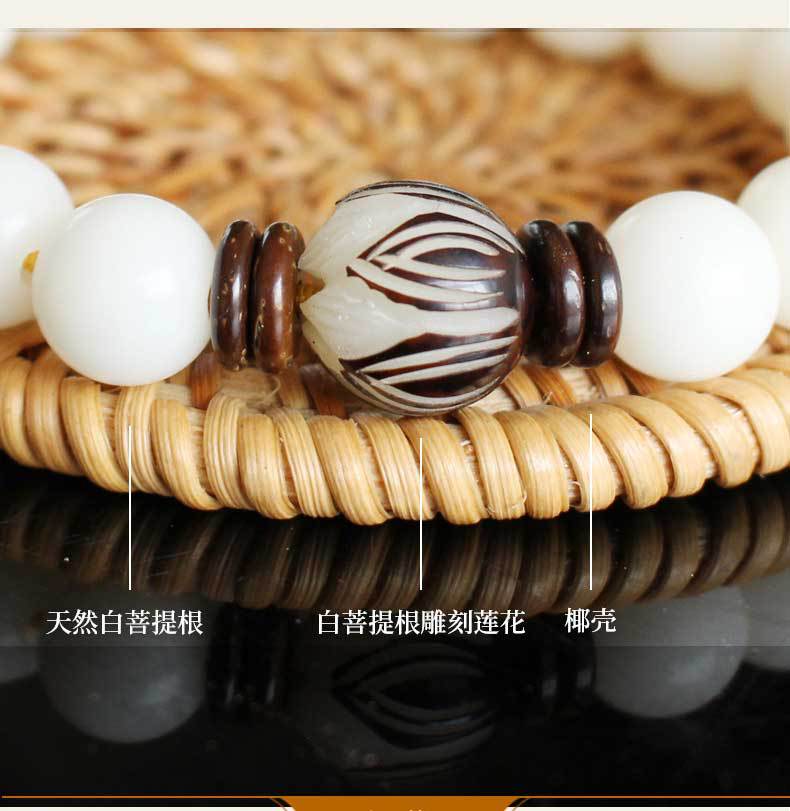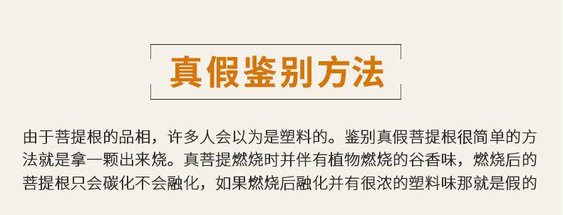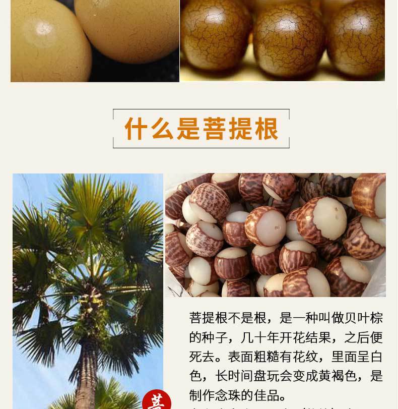 La raíz de Bodhi no es una raíz de árbol, sino la semilla de una planta llamada hoja de palma. Esa planta florece y da fruto una vez cada pocas décadas y luego muere. Sus hojas son el material para hacer escrituras de hoja de palma. La raíz de Bodhi es la semilla de la hoja de palma. En la superficie, es solo una semilla, discreta y rugosa. Cuando se corta, tiene una piel estampada de color chocolate. El interior es blanco, que se volverá marrón amarillento después de un largo período de manipulación.