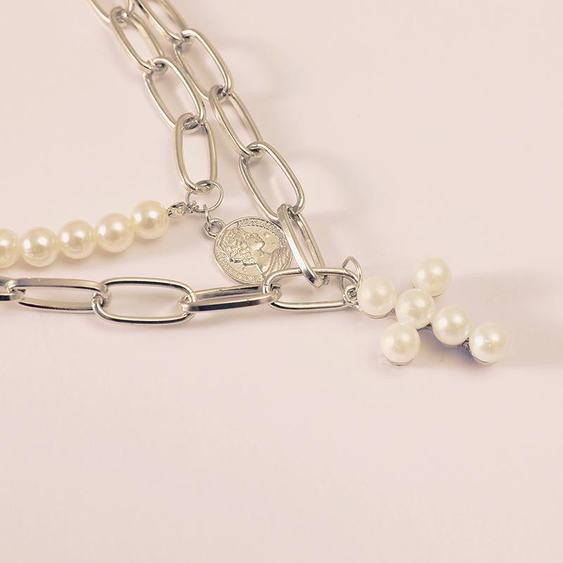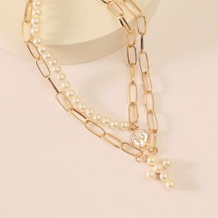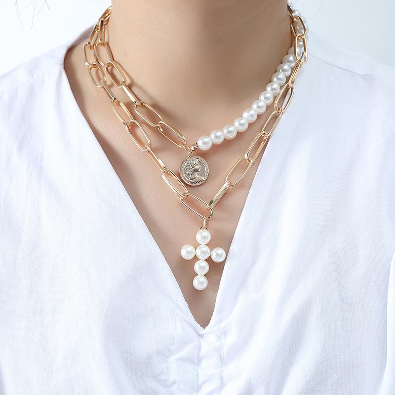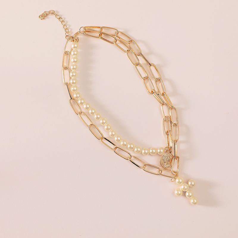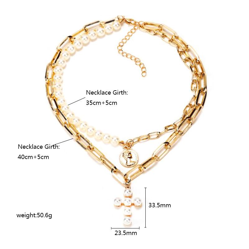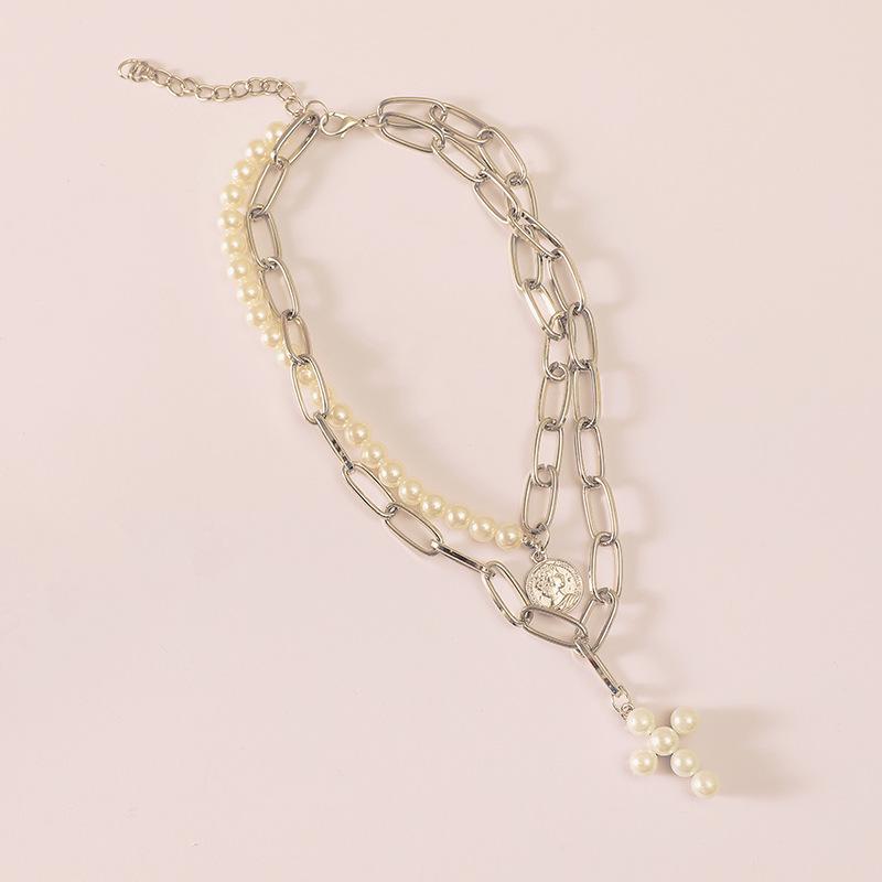 Collar de moda europea y americana retro simple irregular placa redonda cabeza humana cruz perla collar doble cadena clavícula