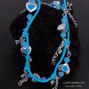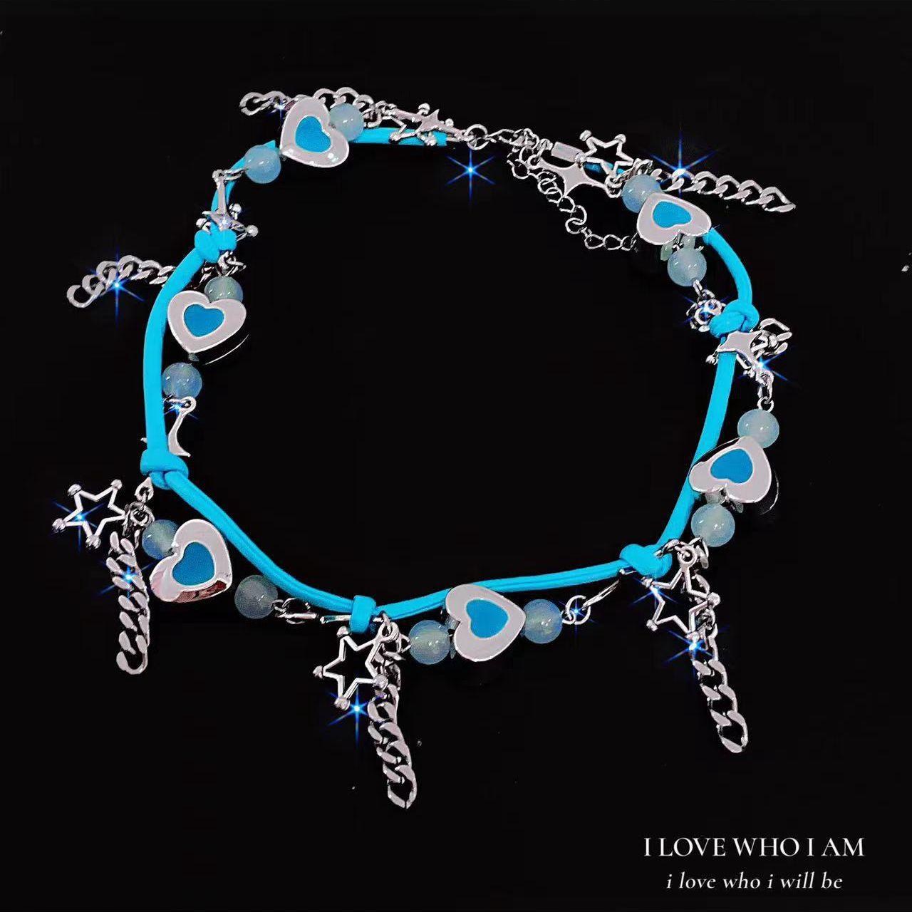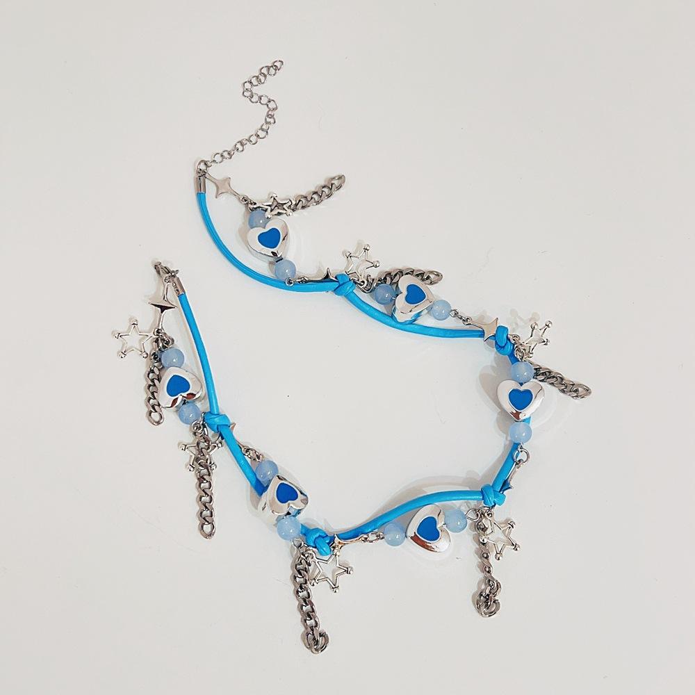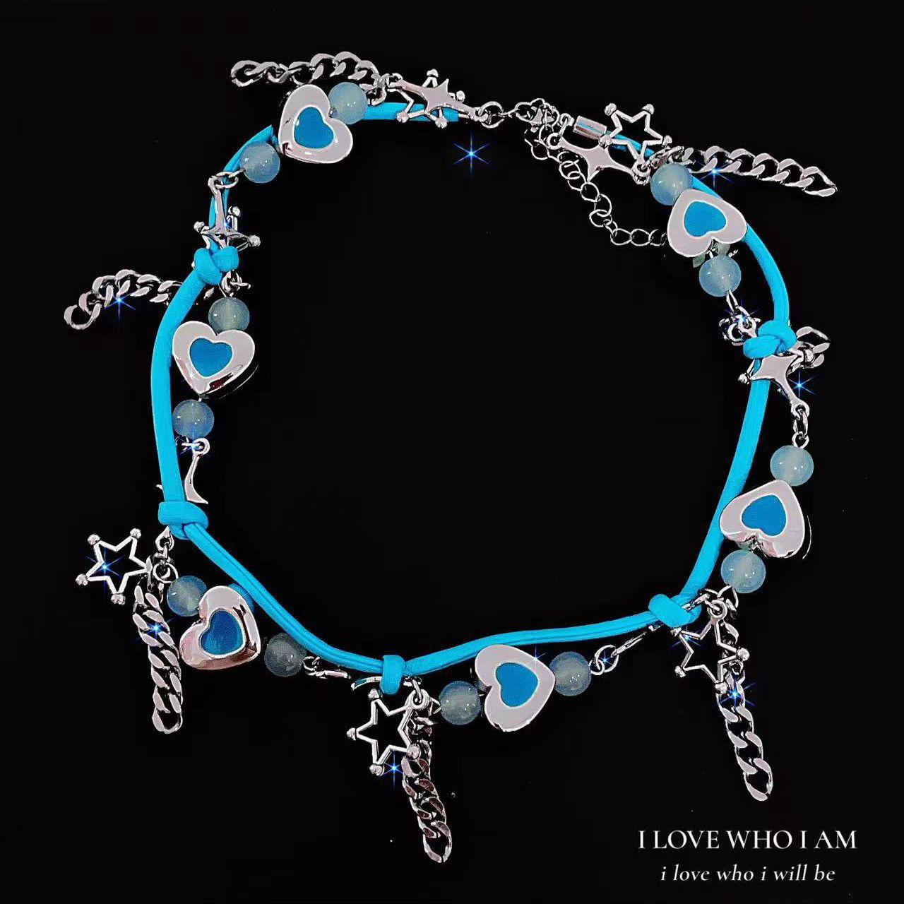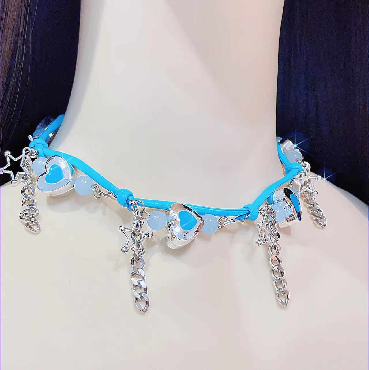 Collar Choker de Cuero Azul con Colgante de Corazón y Estrella de Cinco Puntas, Cadena Metálica de Corazón, Doble Capa, para Clavícula, Mujer