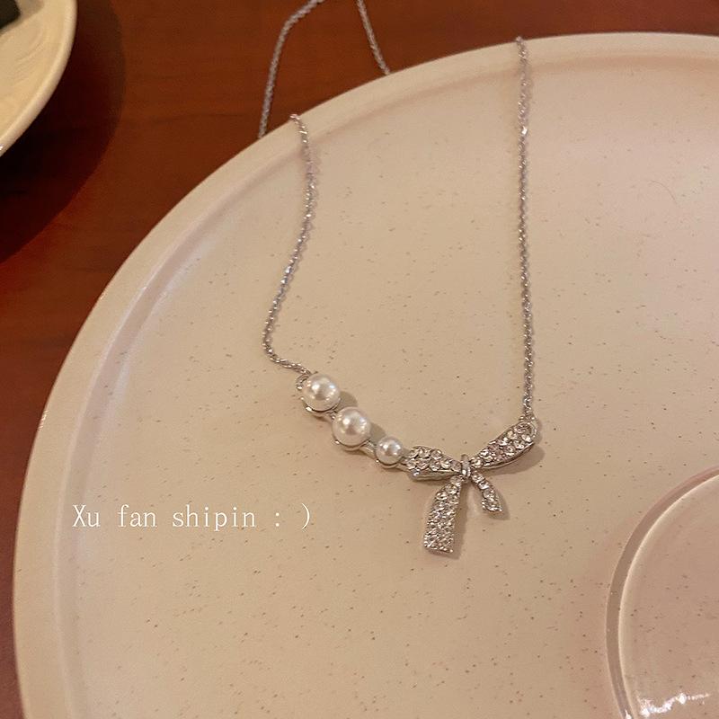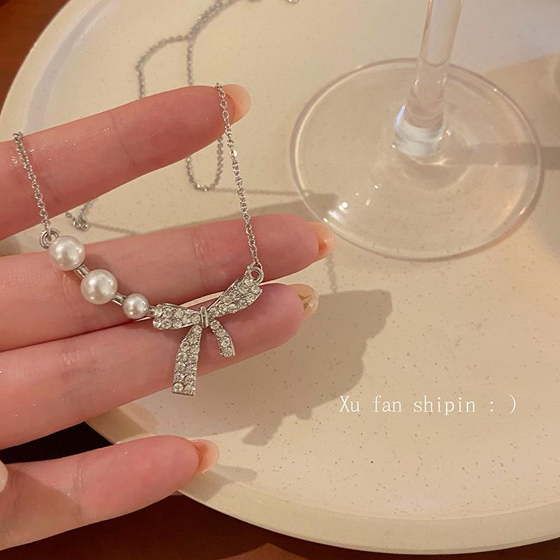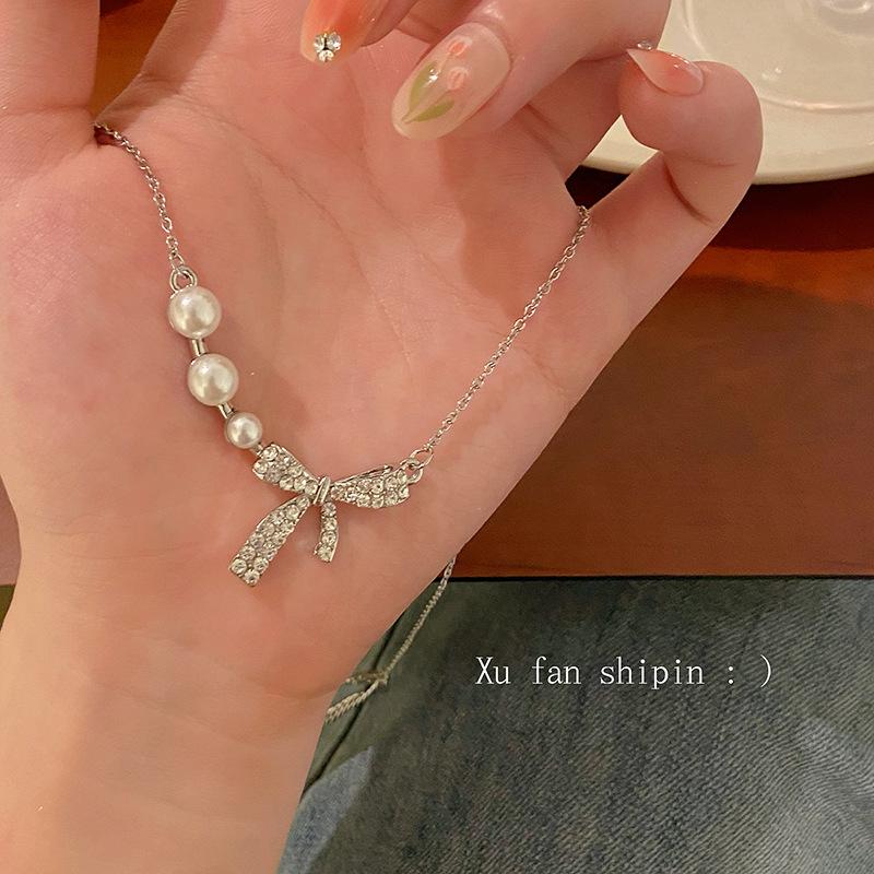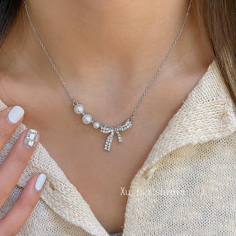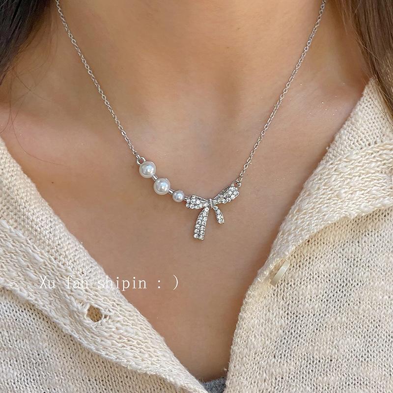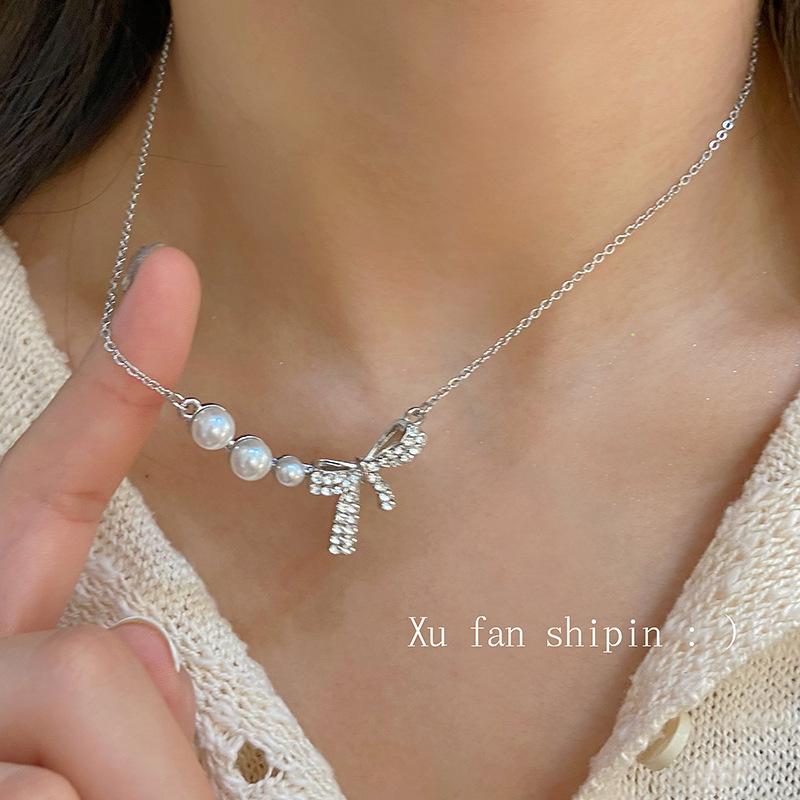 Collar de perlas con lazo de diamantes de Super Fairy, delicado y dulce collar de clavícula 2023, nuevo collar de alta gama que combina con todo.