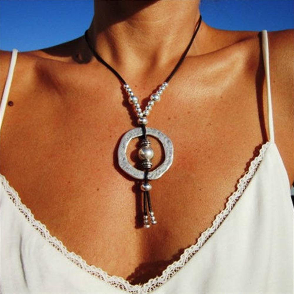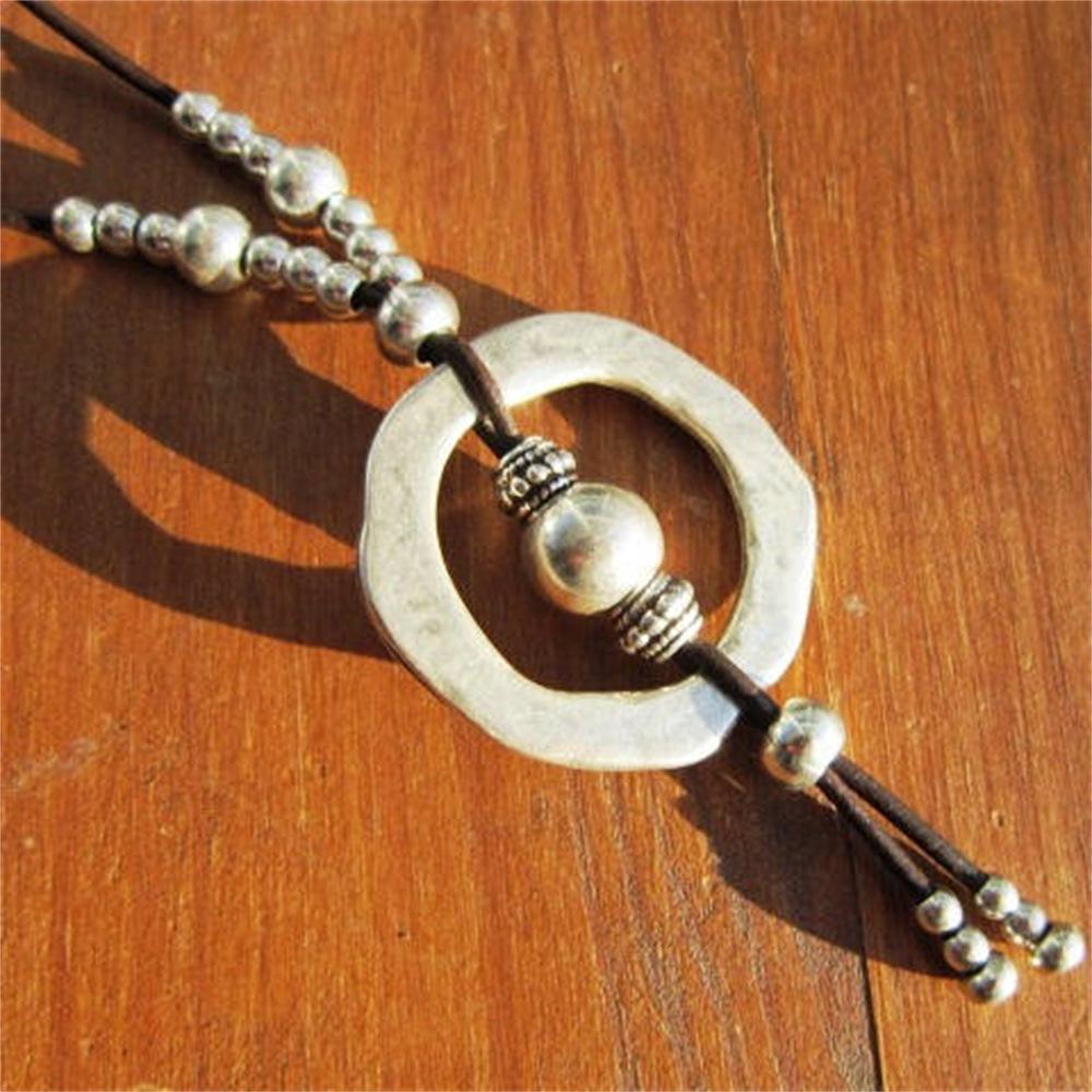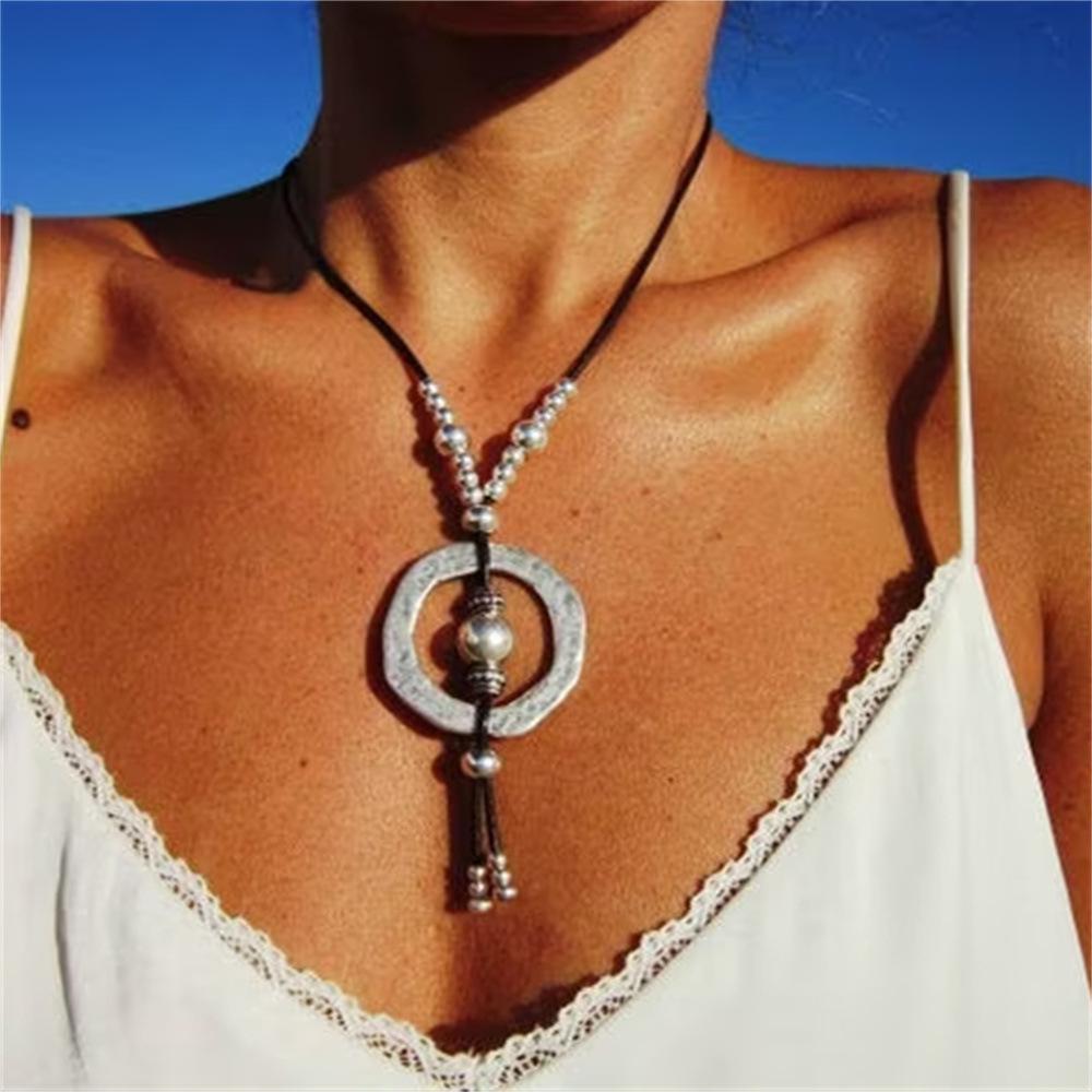 [Nombre del producto] Collar con colgante de aleación de anillo de cuentas de cuerda de piel de vaca de gran venta transfronteriza, cadena de clavícula, collar de estilo bohemio europeo y americano para mujer