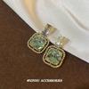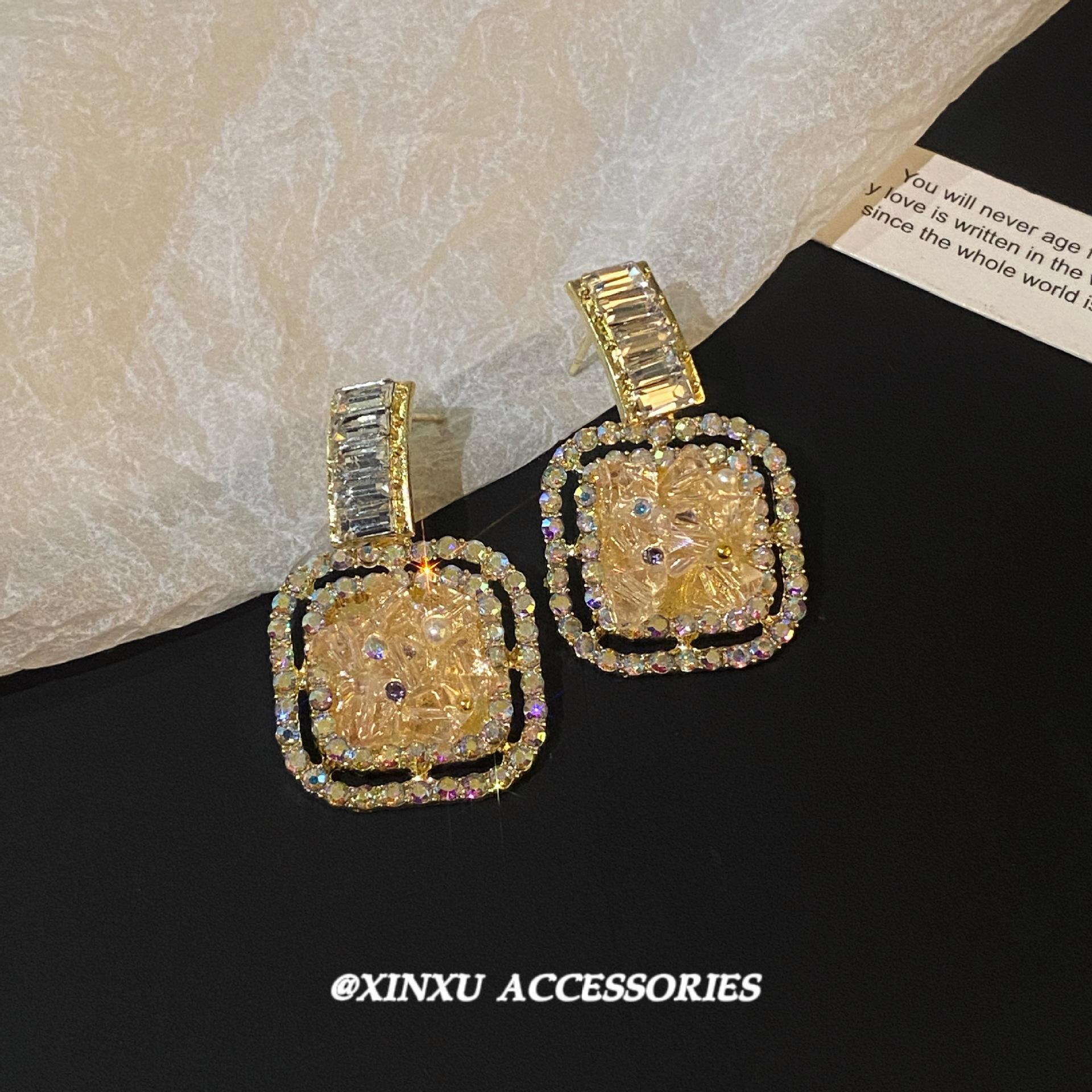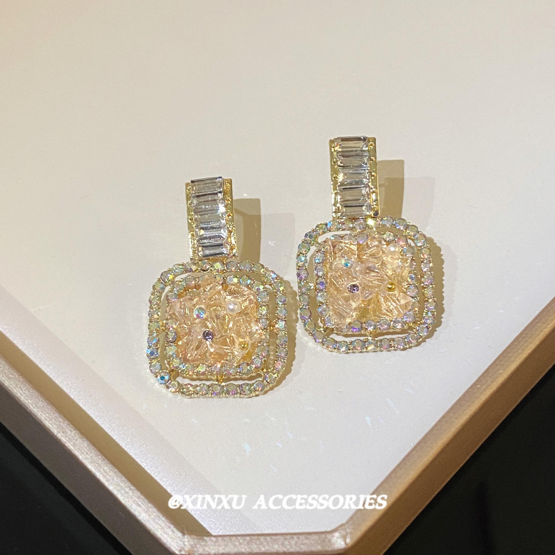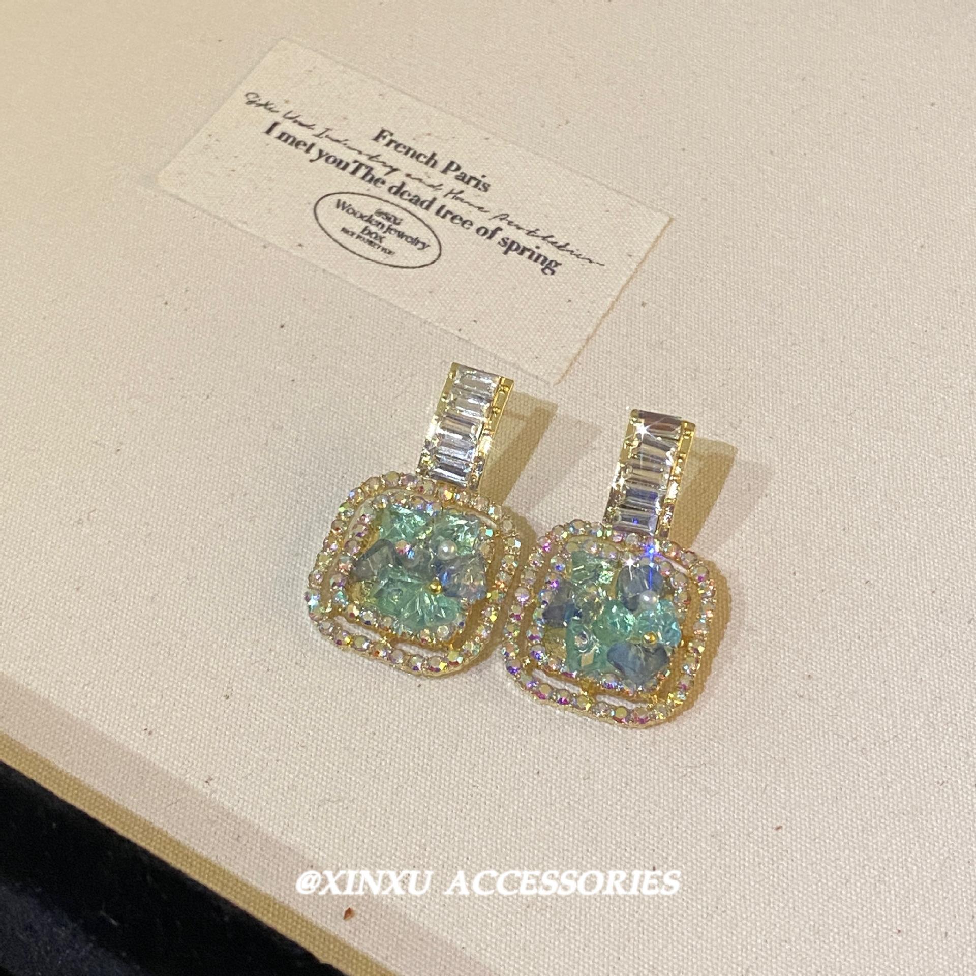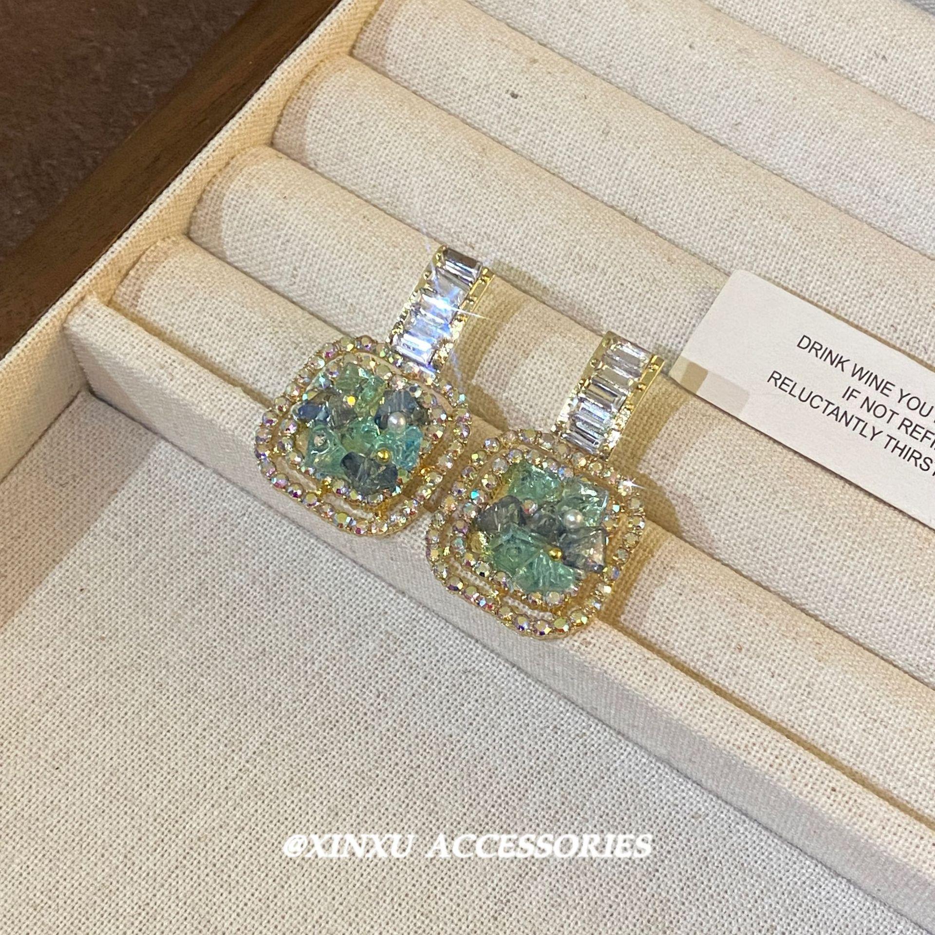 Nuevos pendientes de cristal cuadrado con incrustaciones de diamantes, pendientes de diseño retro de nicho, elegantes pendientes de lujo ligeros de alta calidad.