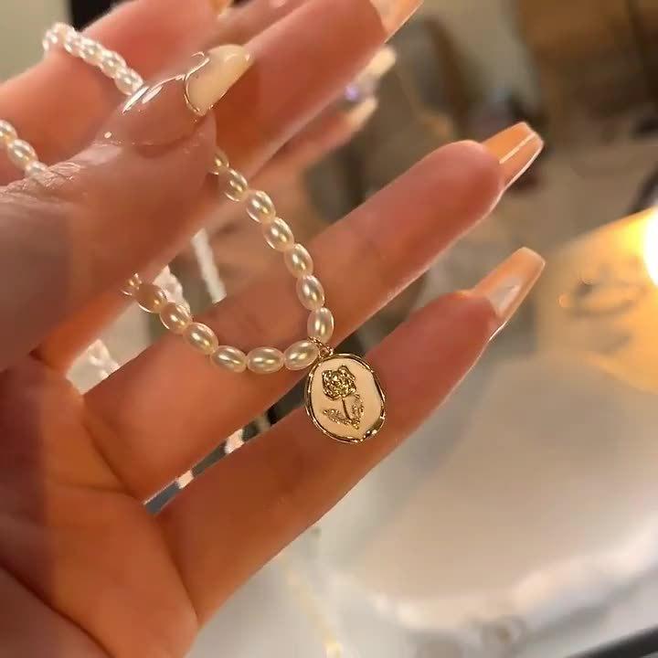 Collar de perlas con colgante de rosa vintage francés para mujer, diseño de nicho de lujo ligero, cadena de clavícula de alta calidad, cadena de lana de moda