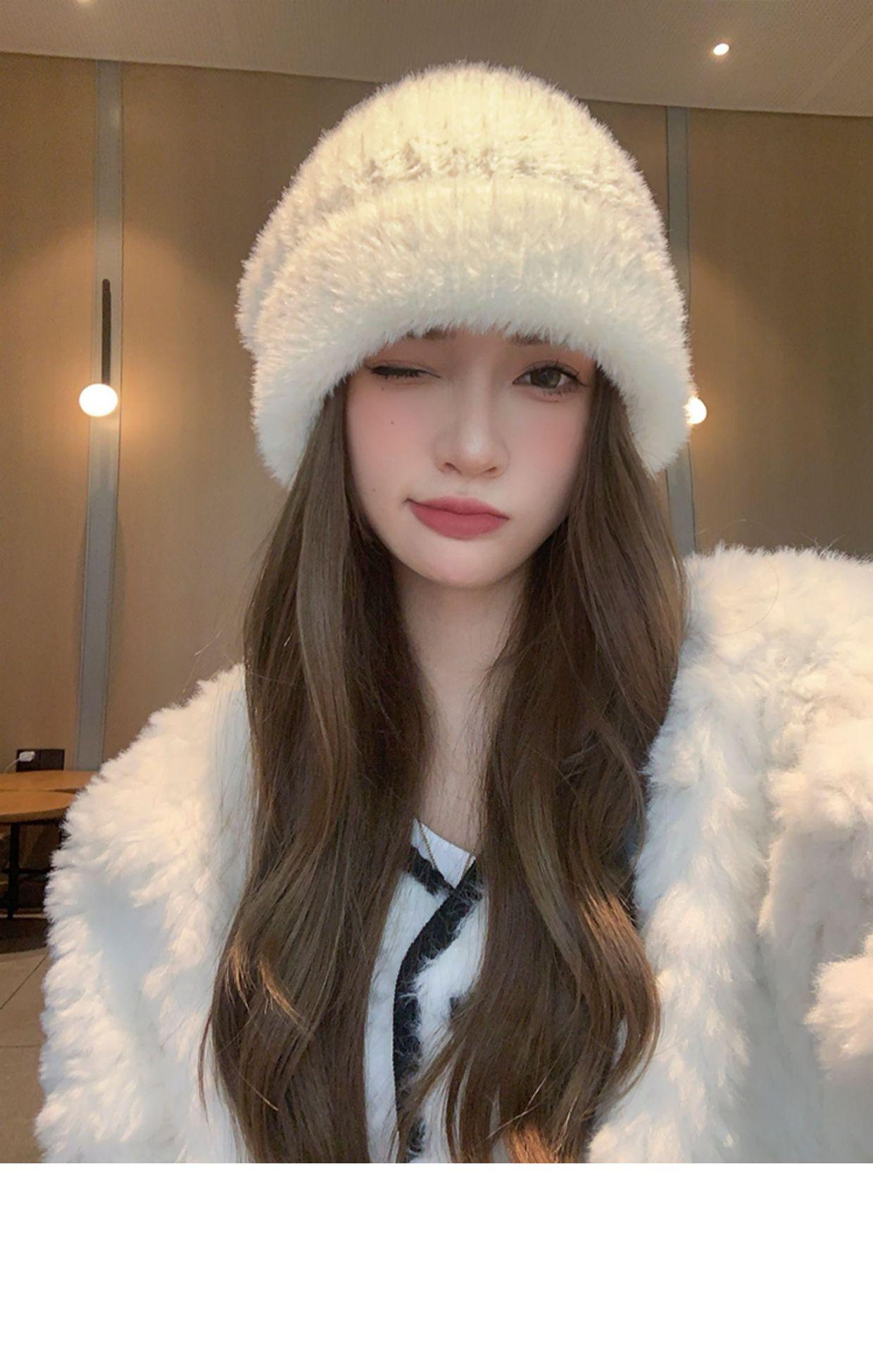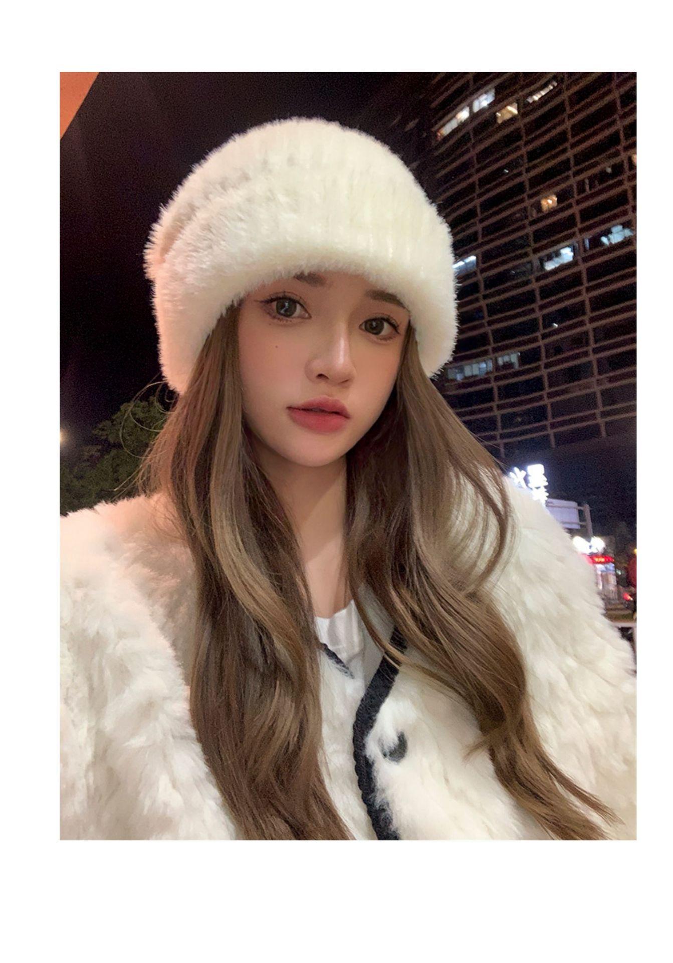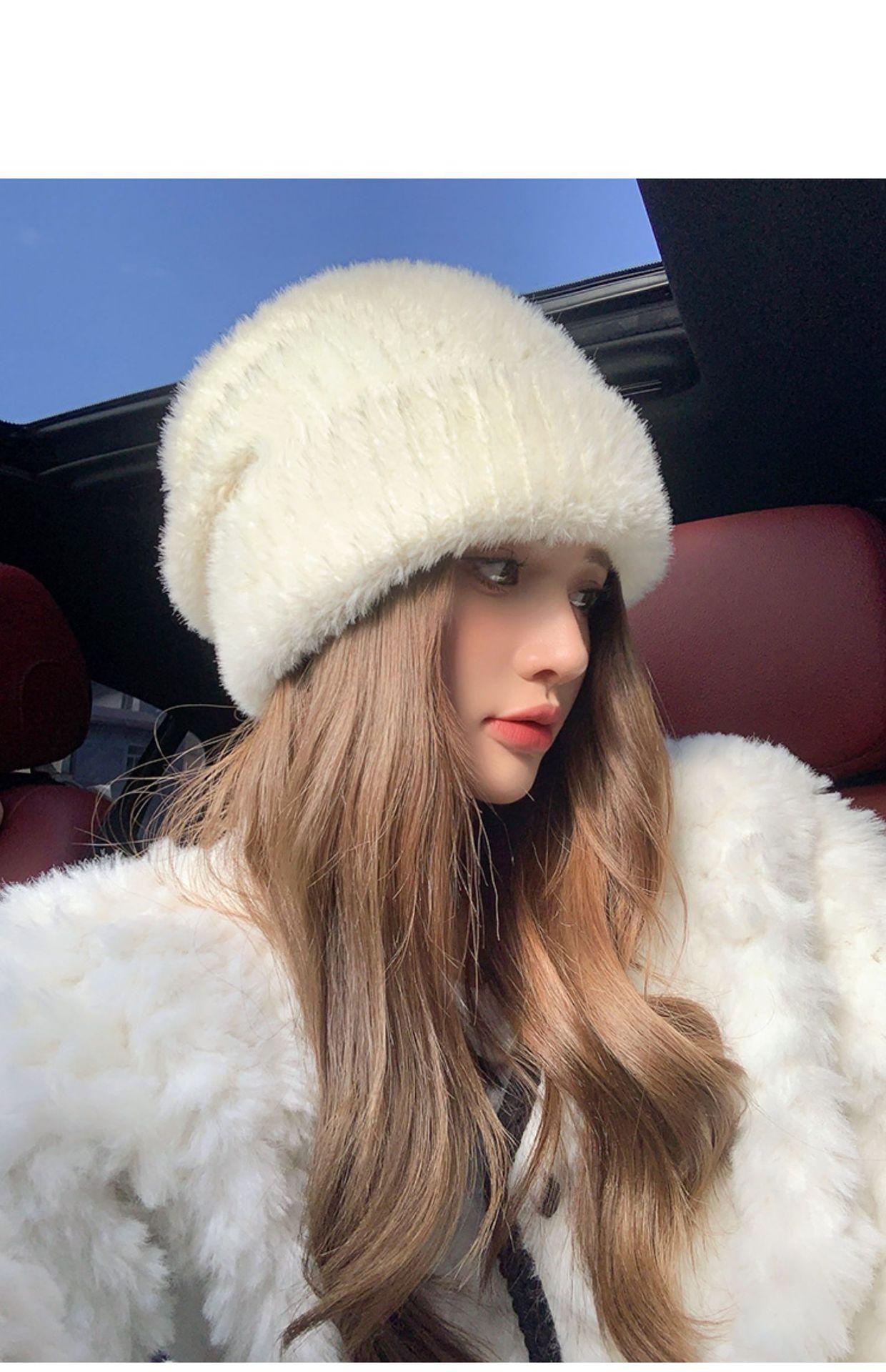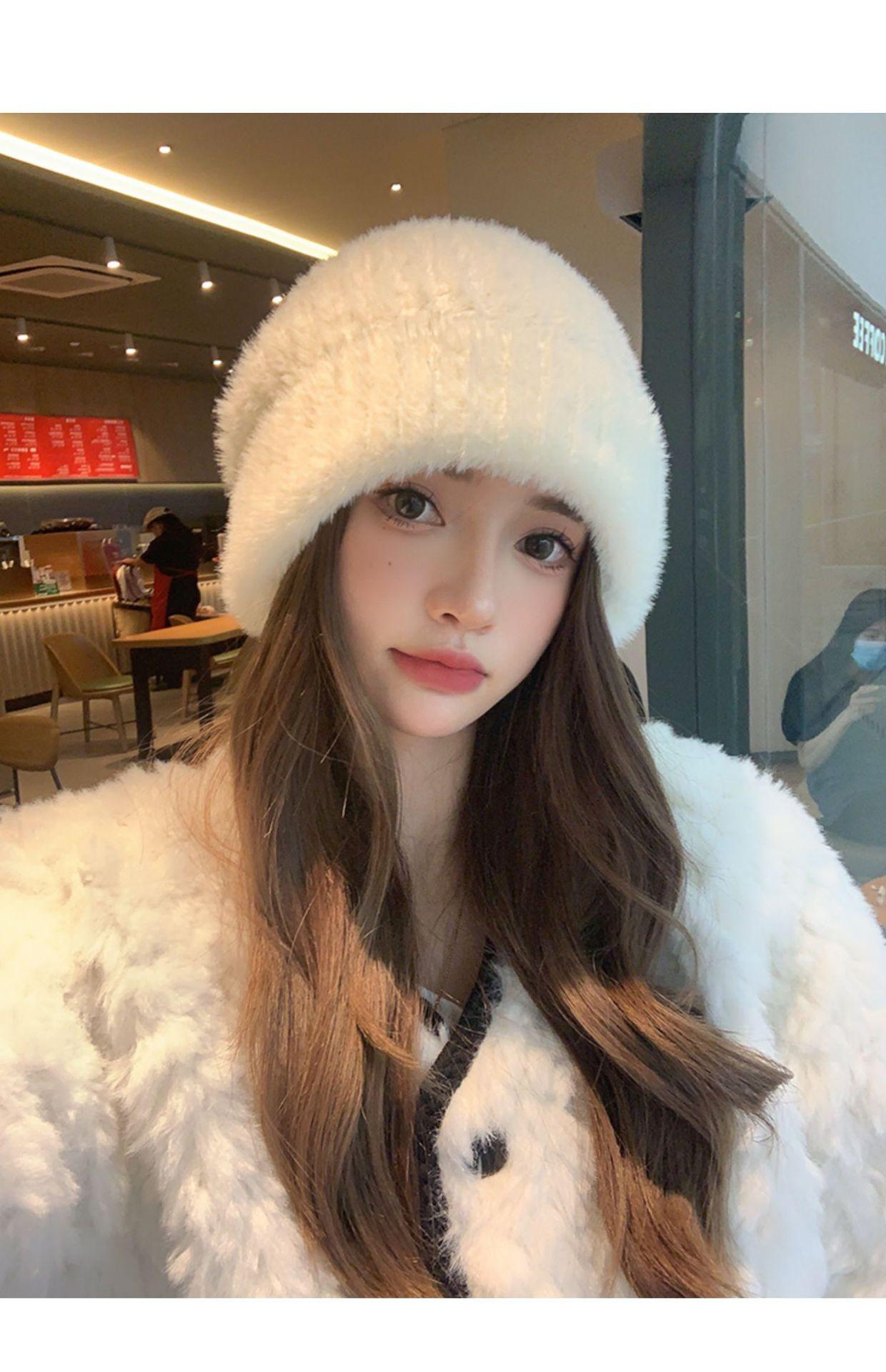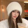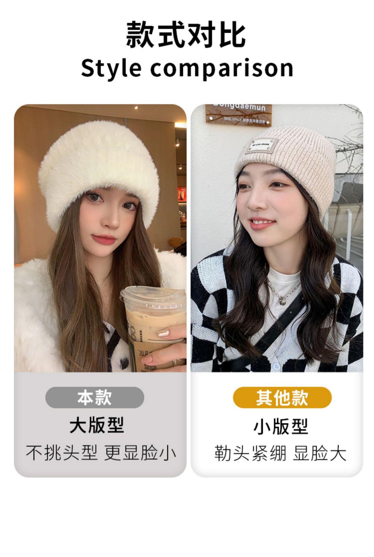 Gorro de punto con pelo de conejo pequeño y cara grande para mujer, nuevo gorro de lana japonés cálido y holgado para invierno, con protección para las orejas y para la cabeza grande.
