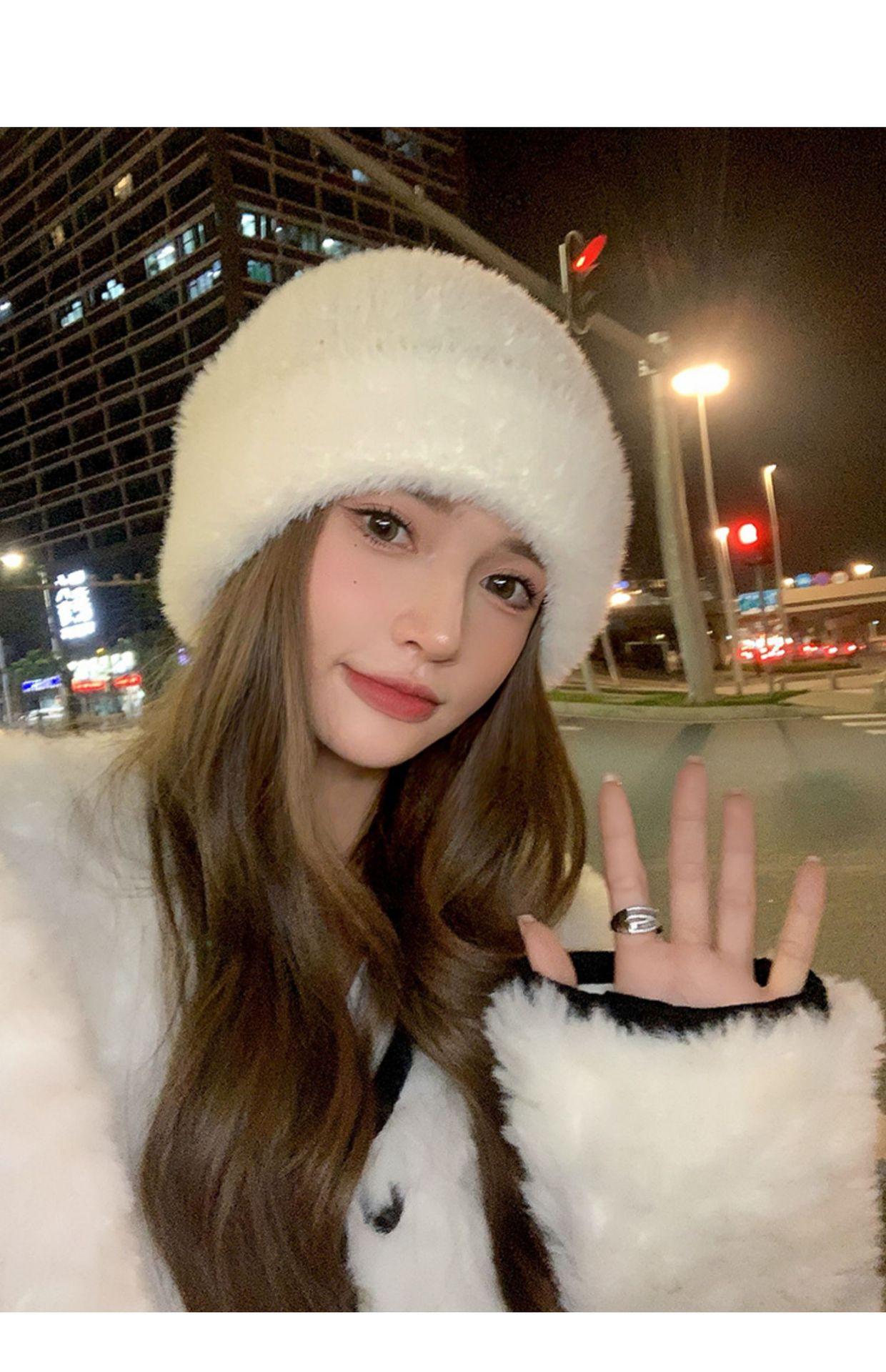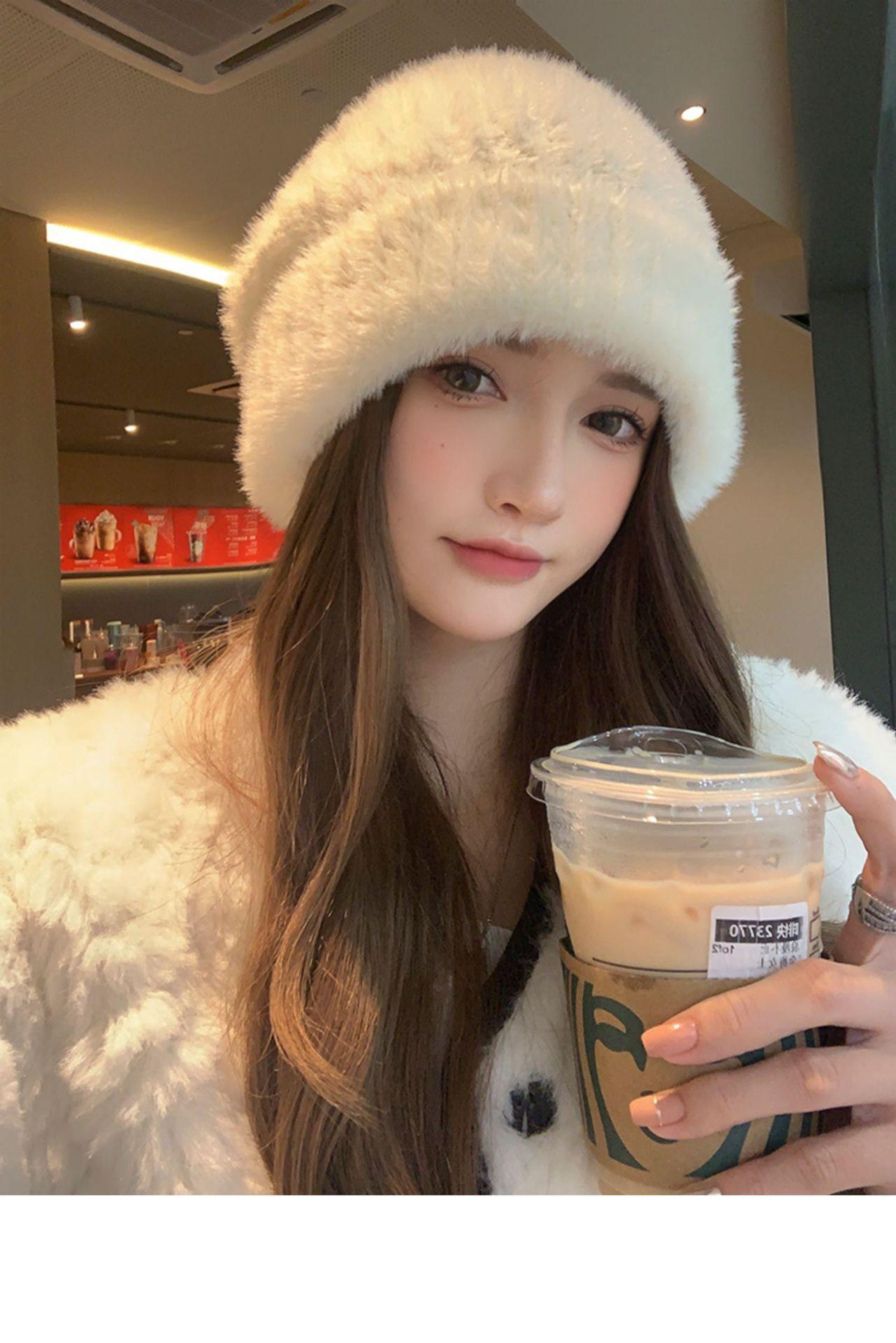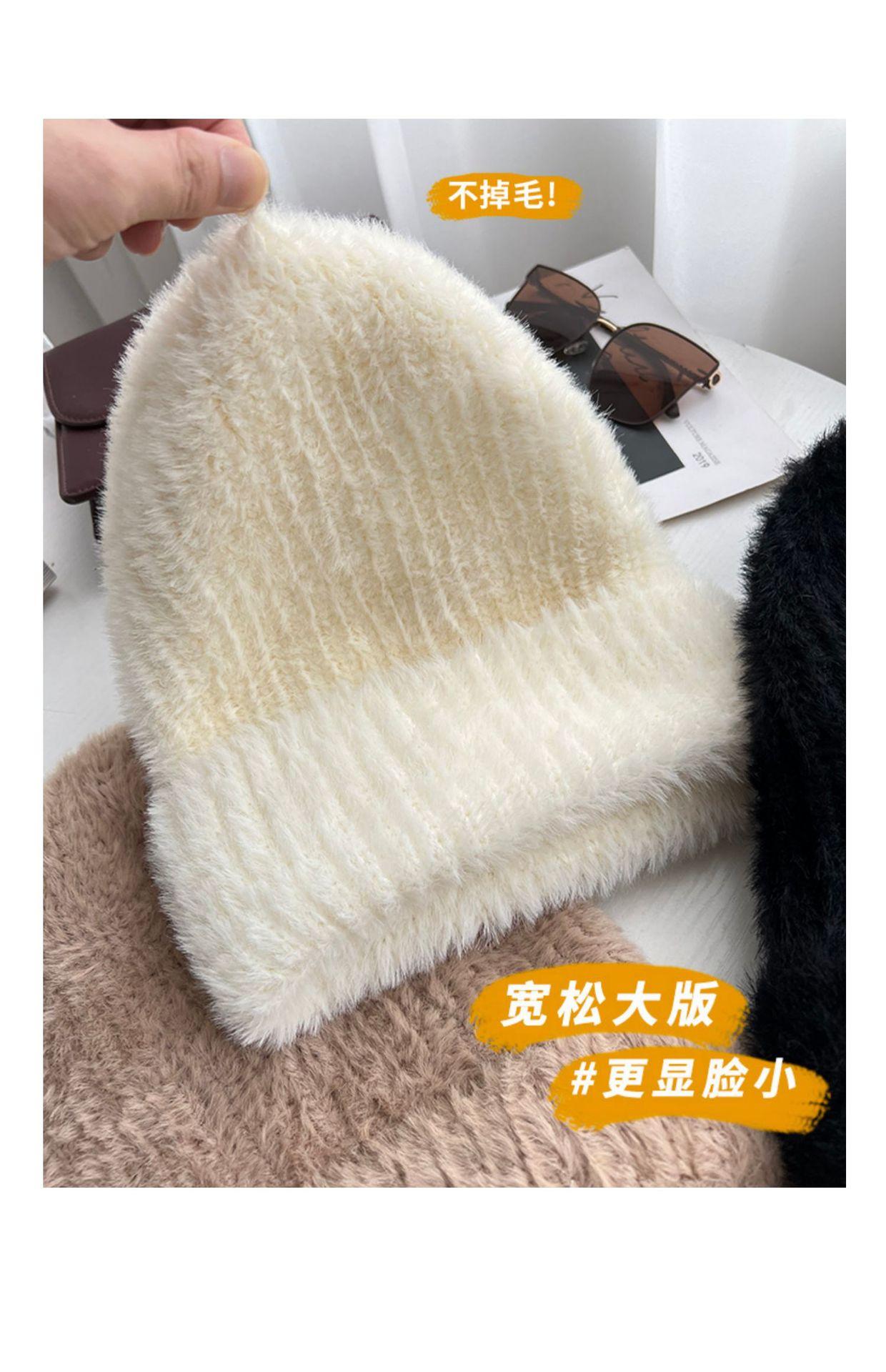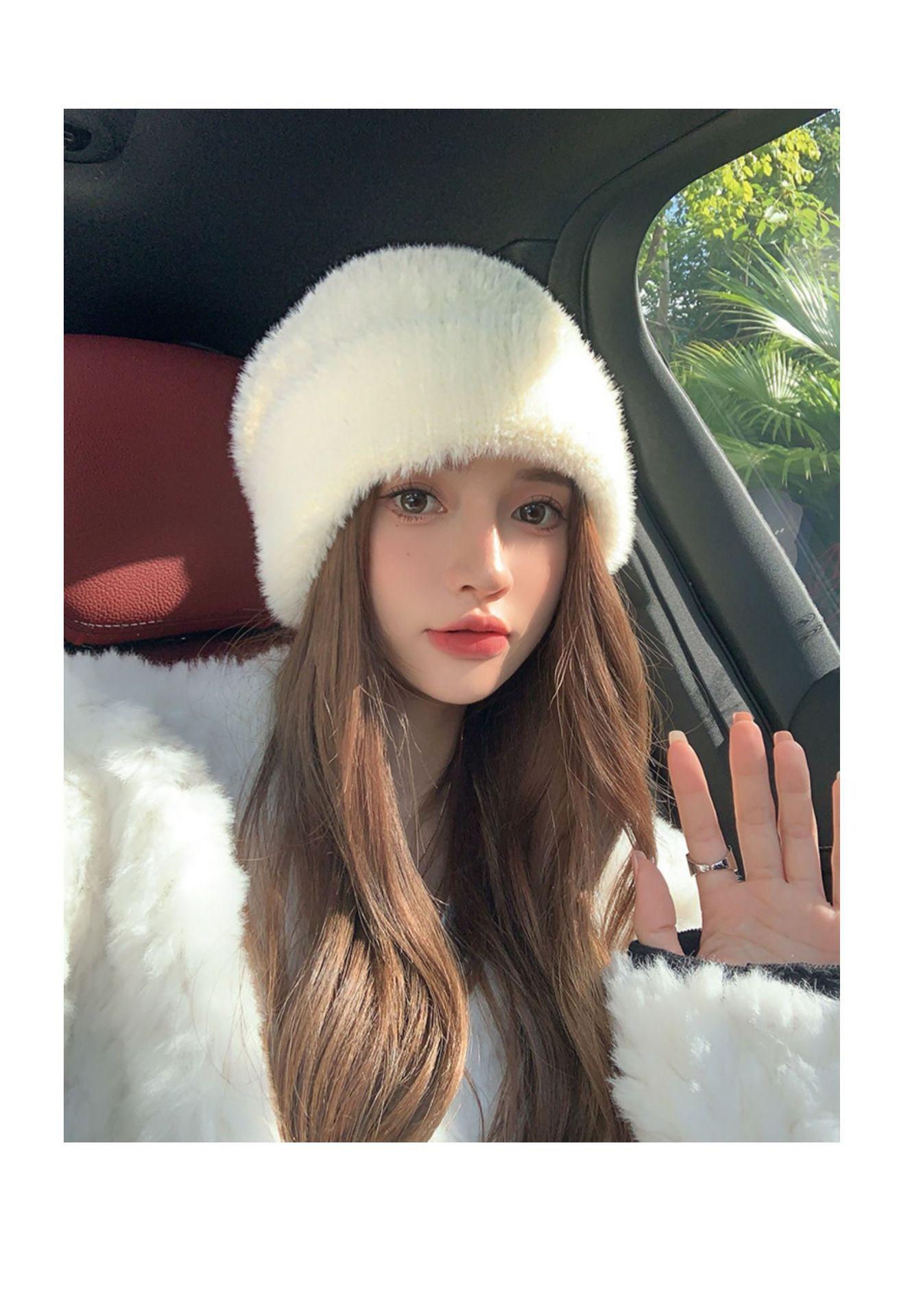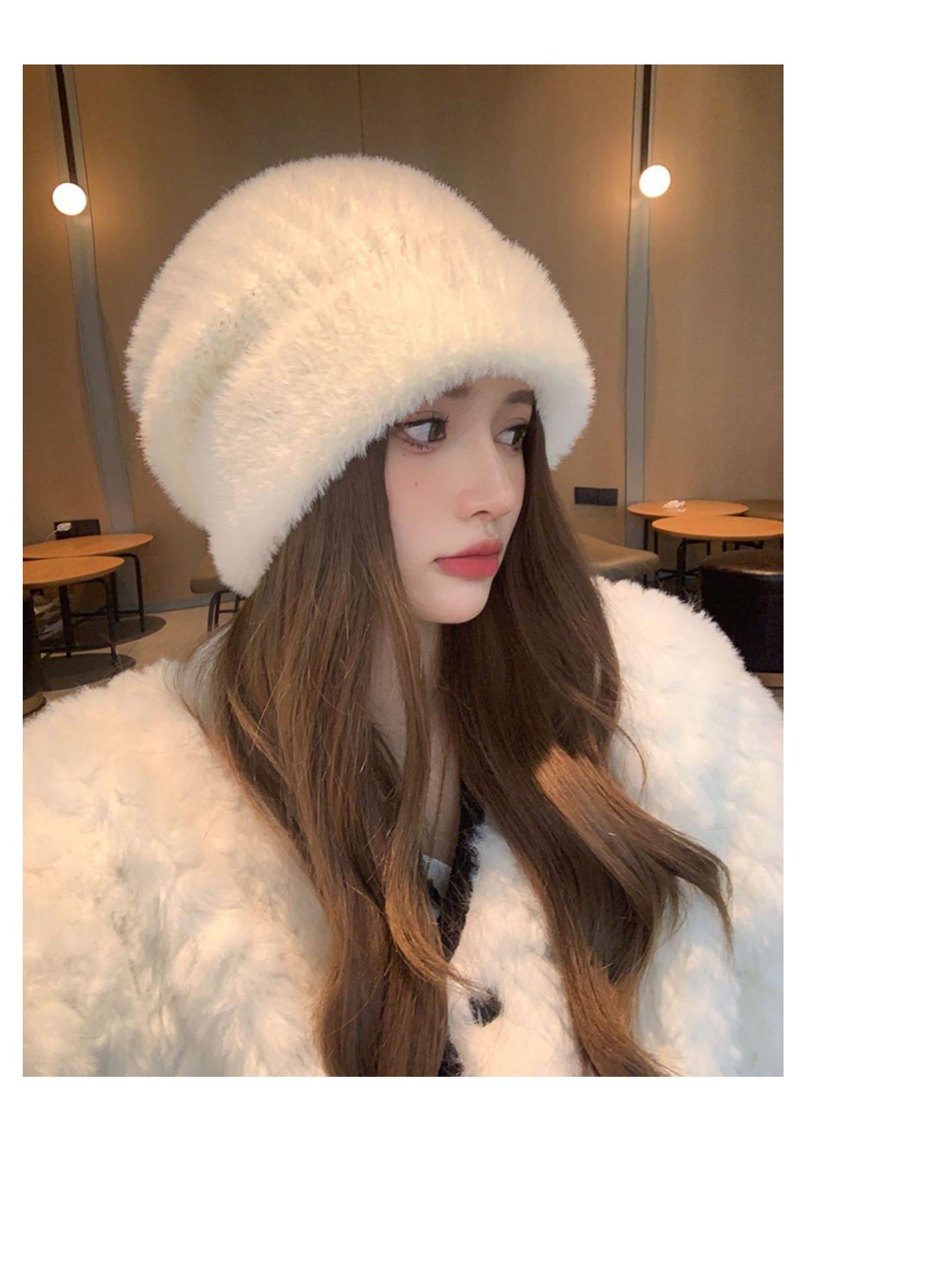 Gorro de punto con pelo de conejo pequeño y cara grande para mujer, nuevo gorro de lana japonés cálido y holgado para invierno, con protección para las orejas y para la cabeza grande.