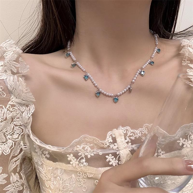 Collar de perlas azules de amor para mujer, diseño de nicho, cadena de clavícula de lujo, elegante y con un temperamento sencillo y distintivo.
