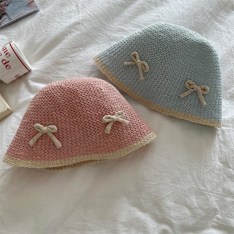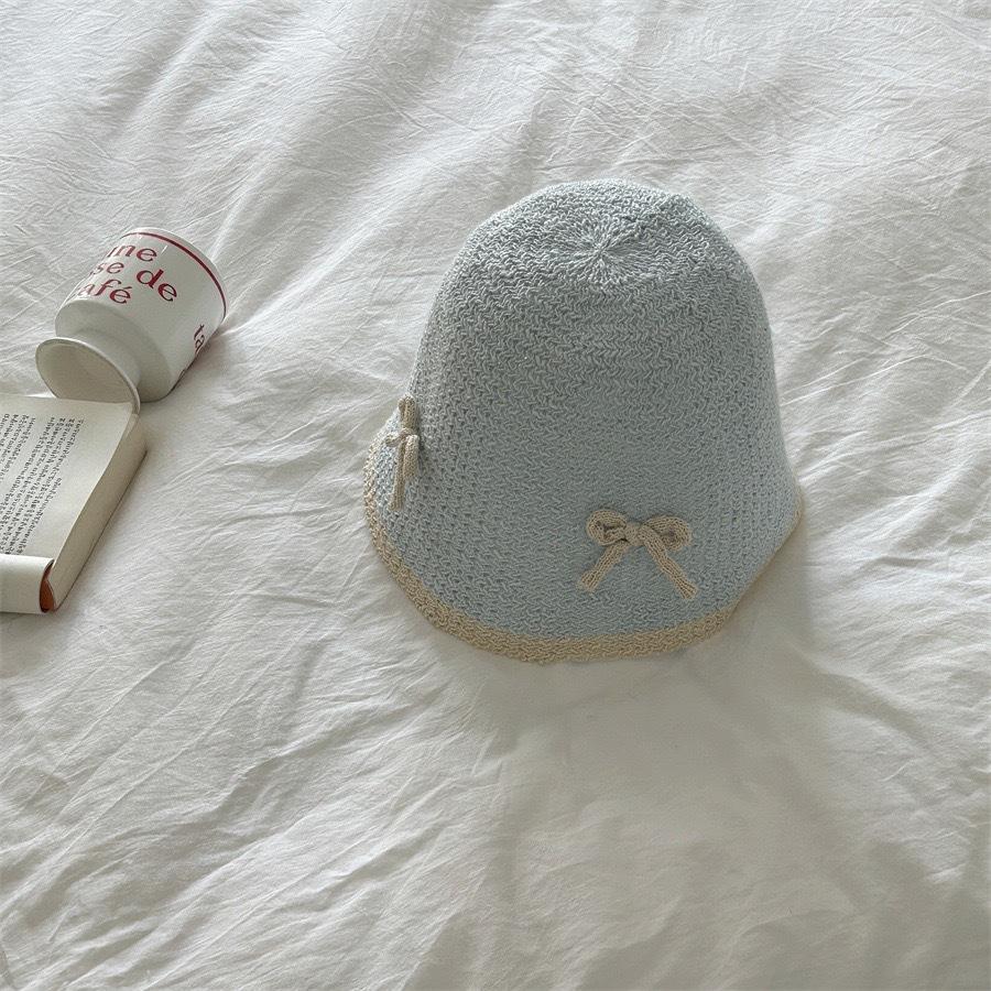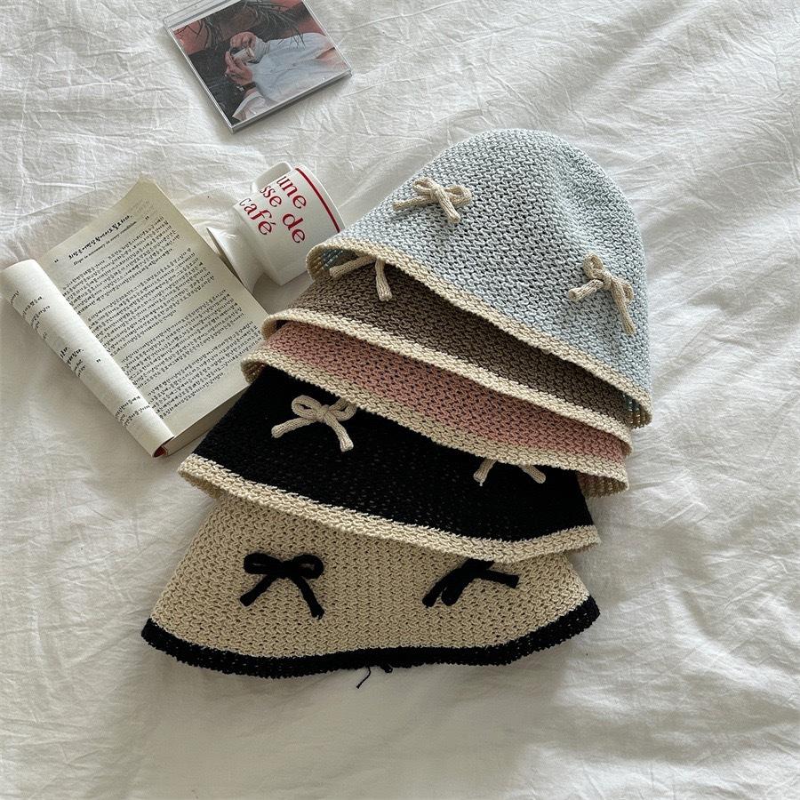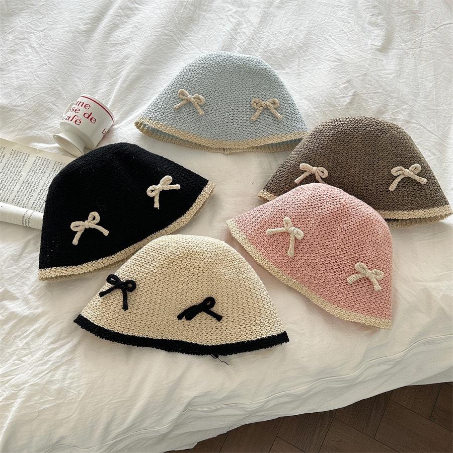 Sombrero de Pescador Tejido con Lazo Lindo Japonés para Mujer Verano Transpirable Delgado Cara Pequeña Sombrero de Cubo Pequeño Sombrero de Cuenca Parasol