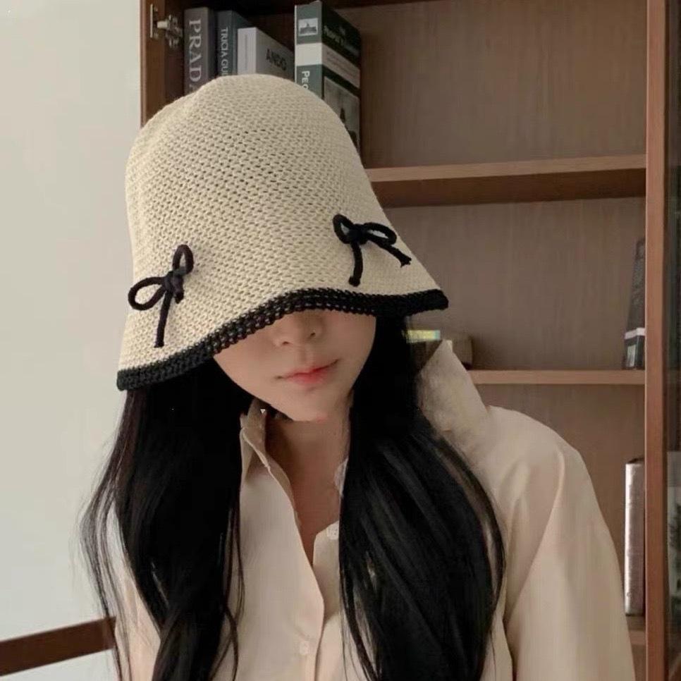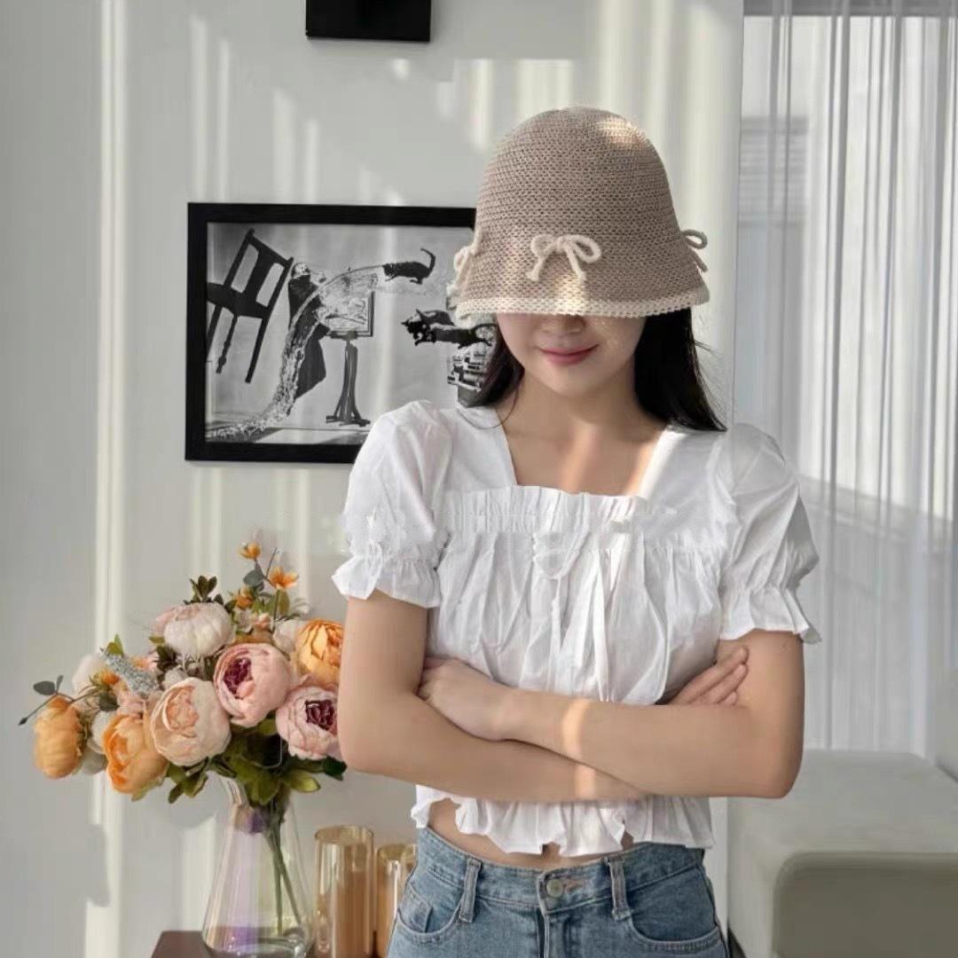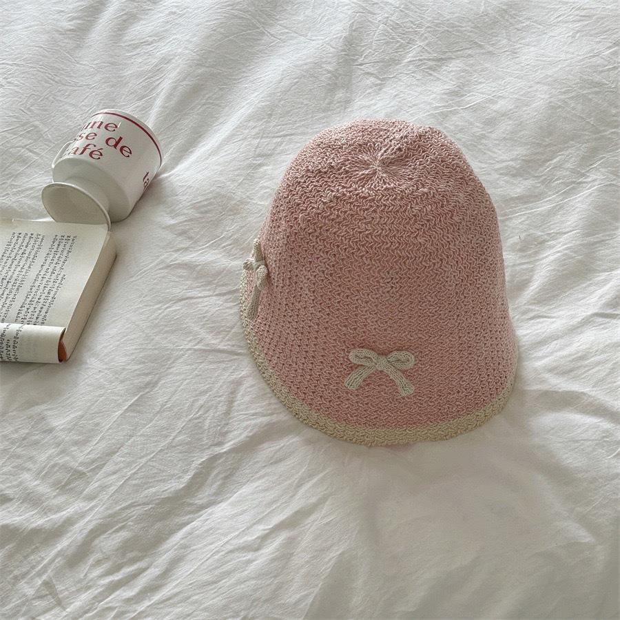 Sombrero de Pescador Tejido con Lazo Lindo Japonés para Mujer Verano Transpirable Delgado Cara Pequeña Sombrero de Cubo Pequeño Sombrero de Cuenca Parasol