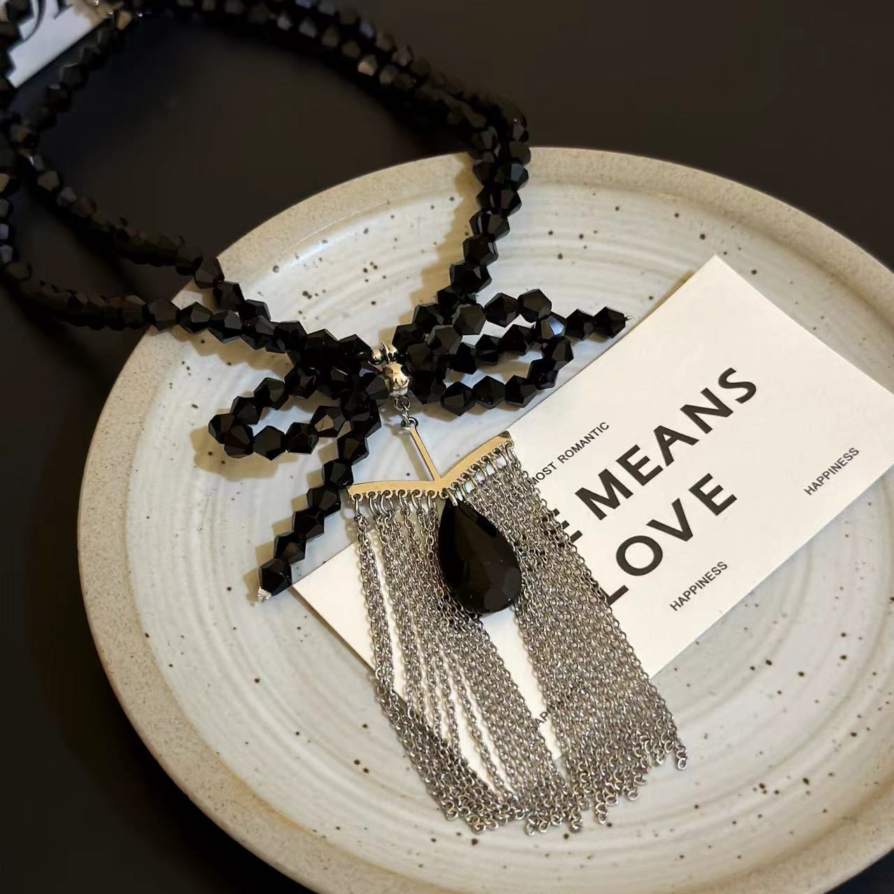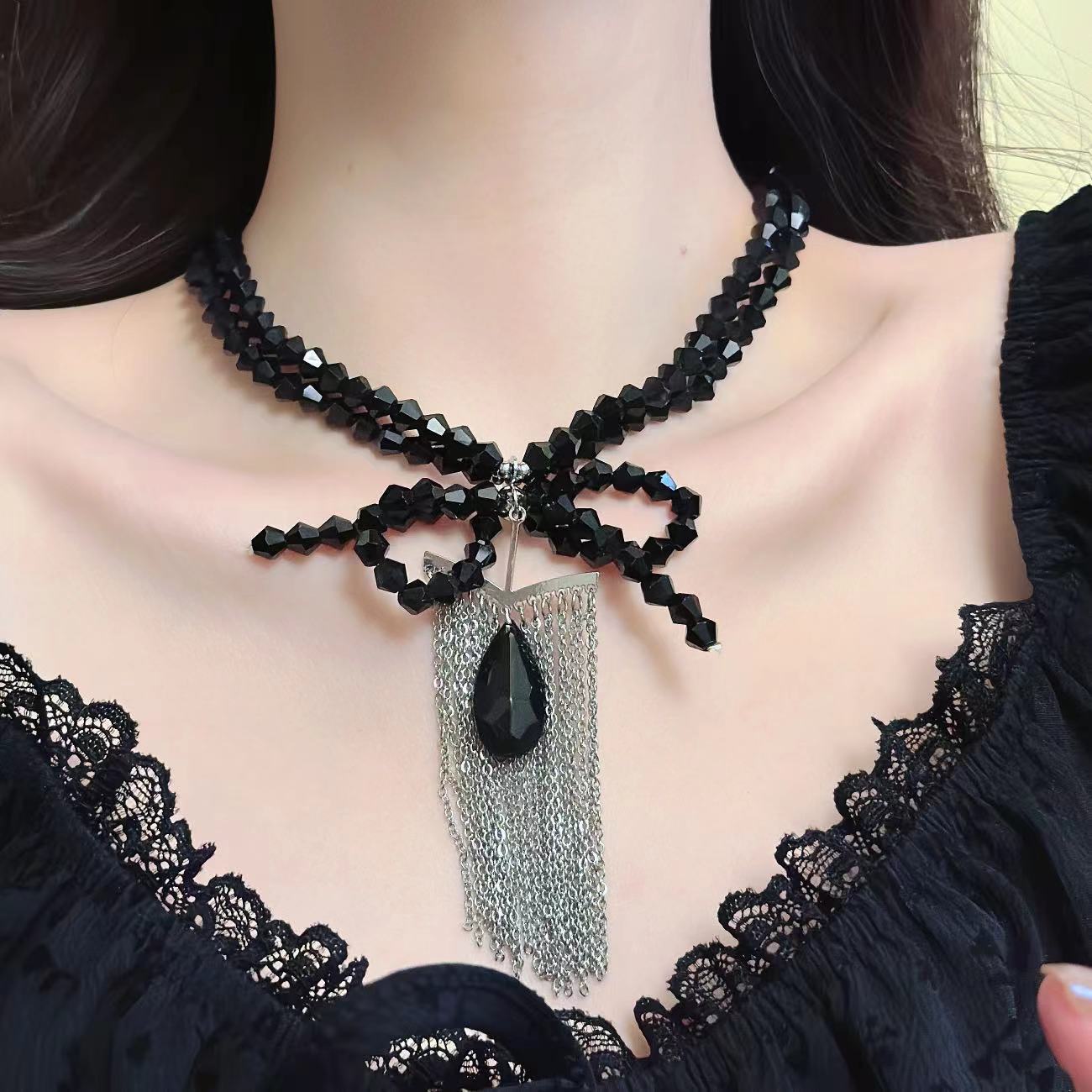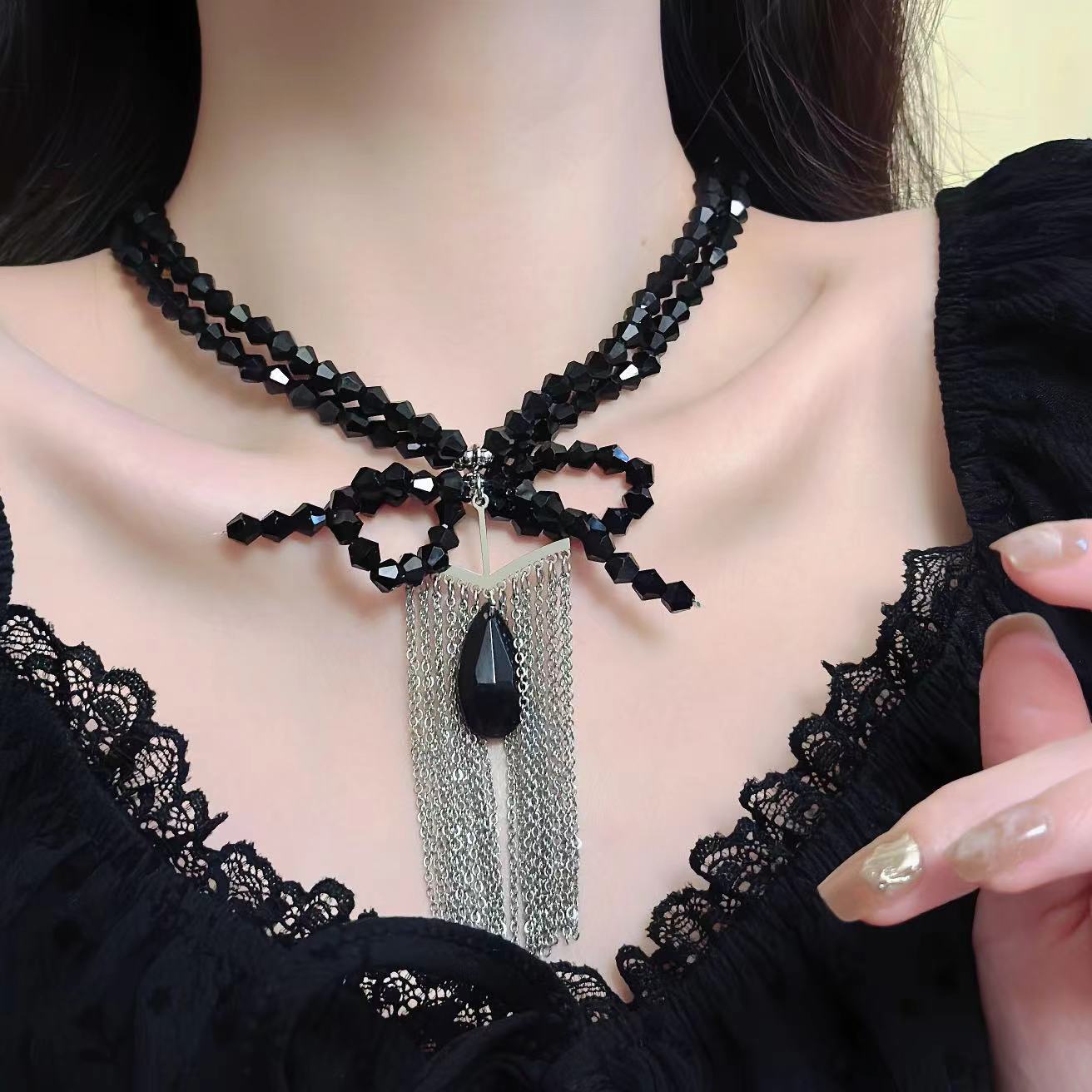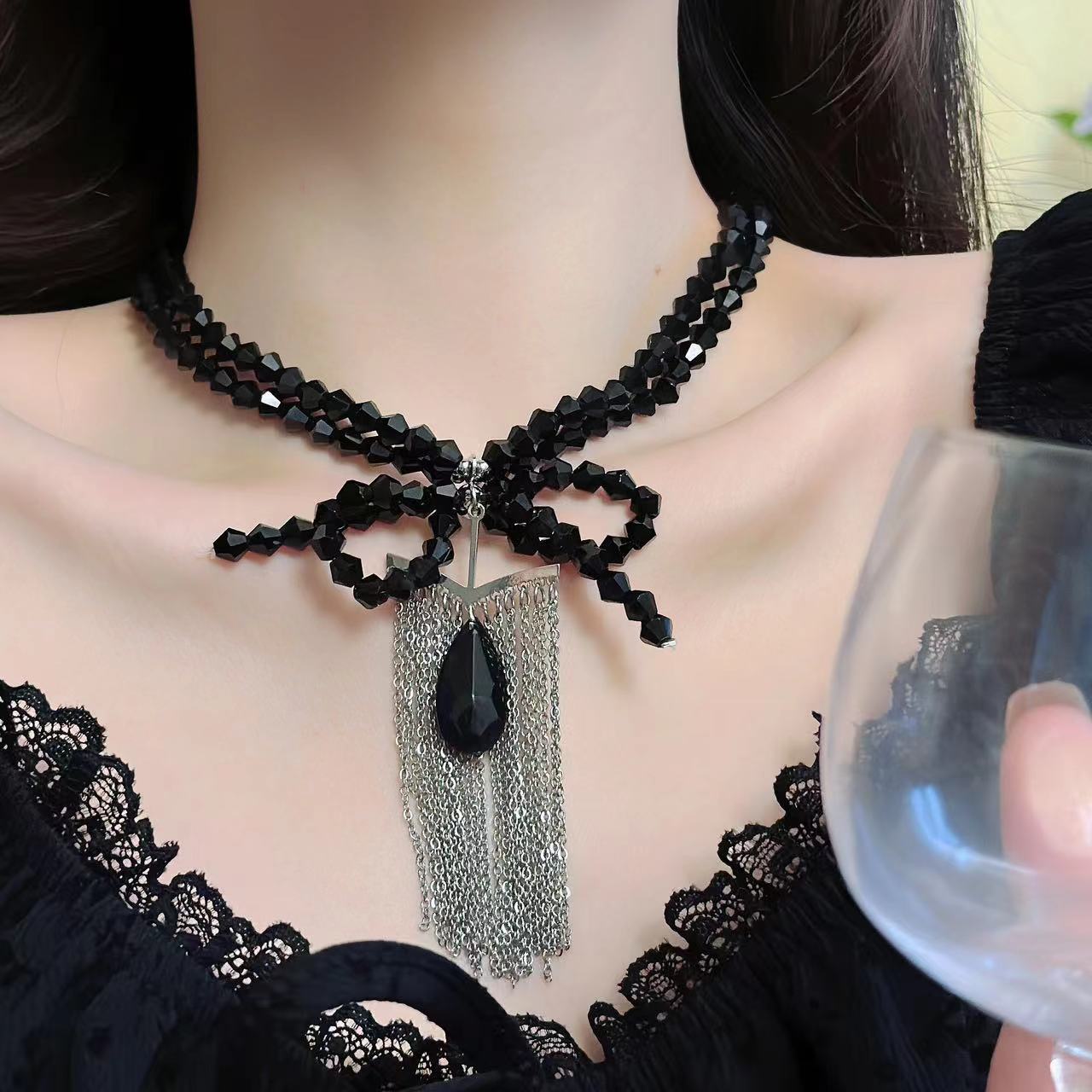 Collar de borlas con lazo y cuentas apiladas multicapa negras, estilo dulce y moderno, para mujer, cadena de clavícula con personalidad sencilla y combinable.