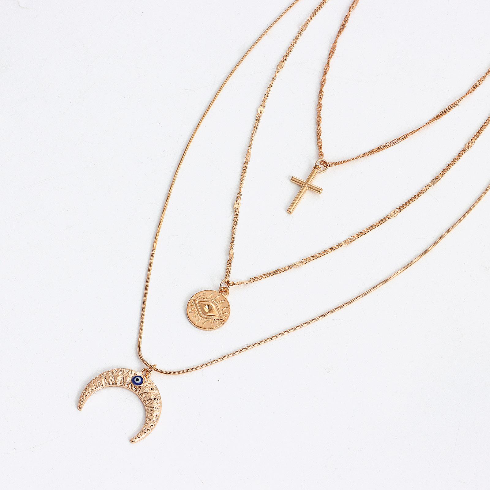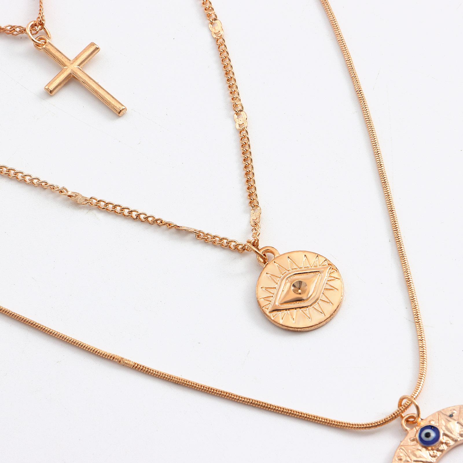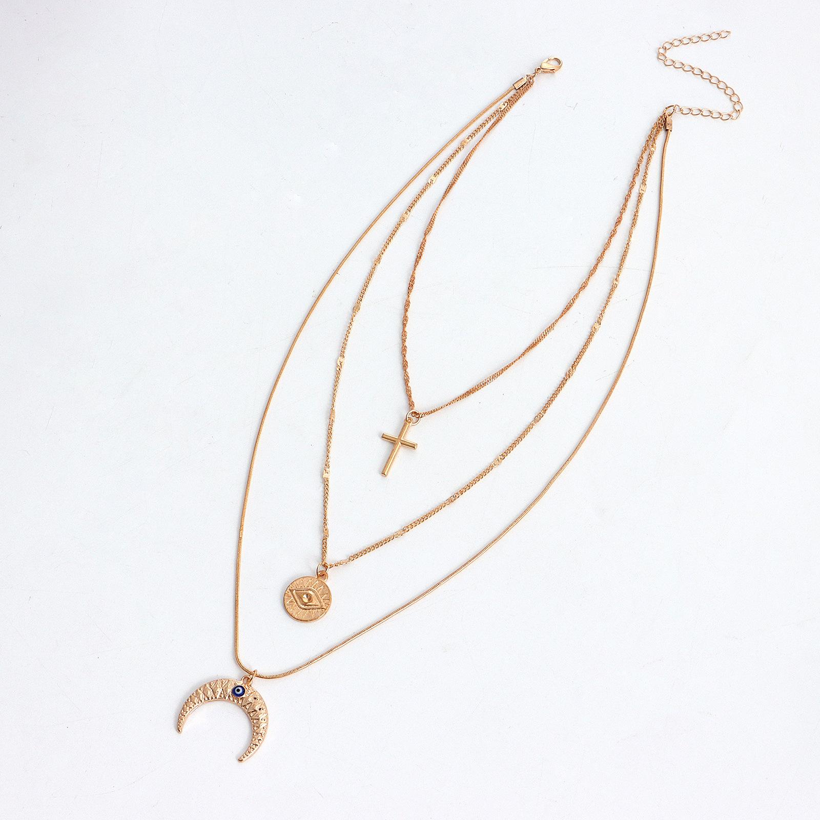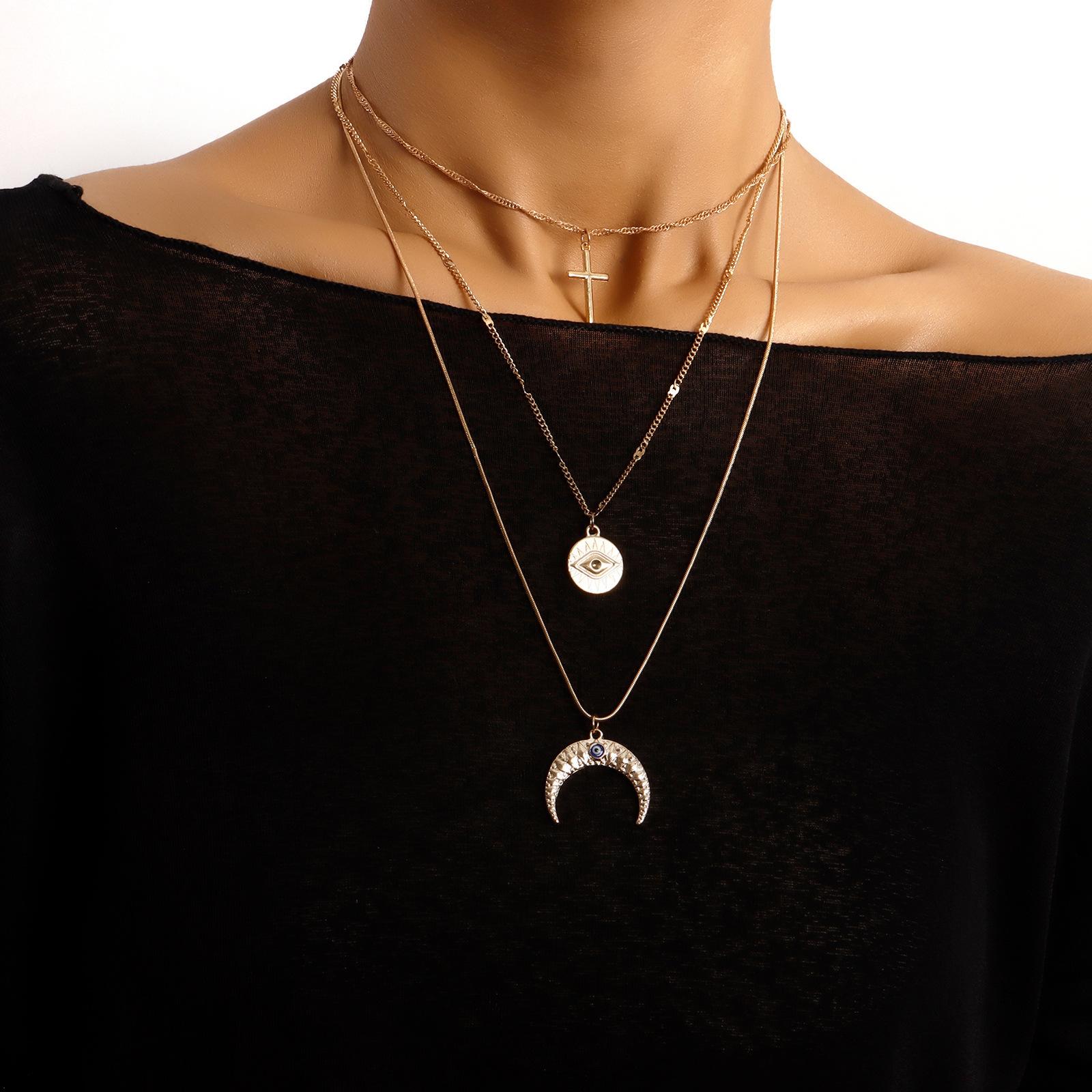Collar con colgante de media luna con ojo de diablo azul y cruz multicapa, joyería transfronteriza europea y americana, de lujo, ligero y a la moda, para mujer.