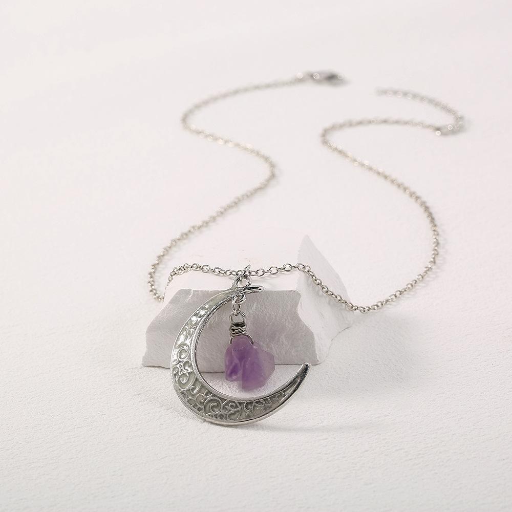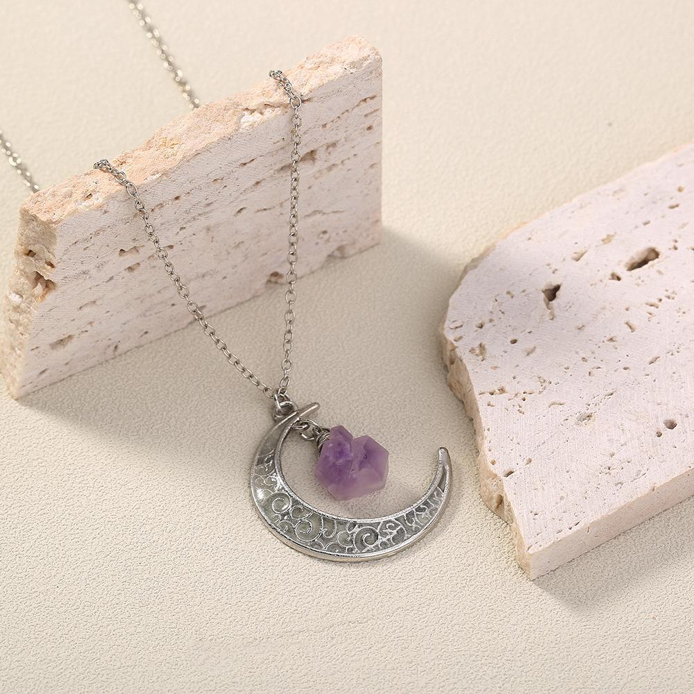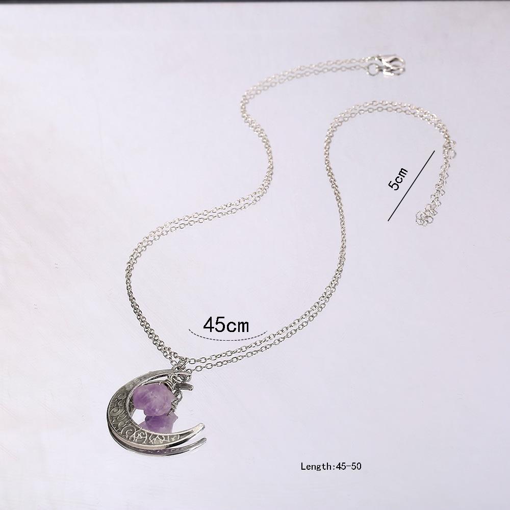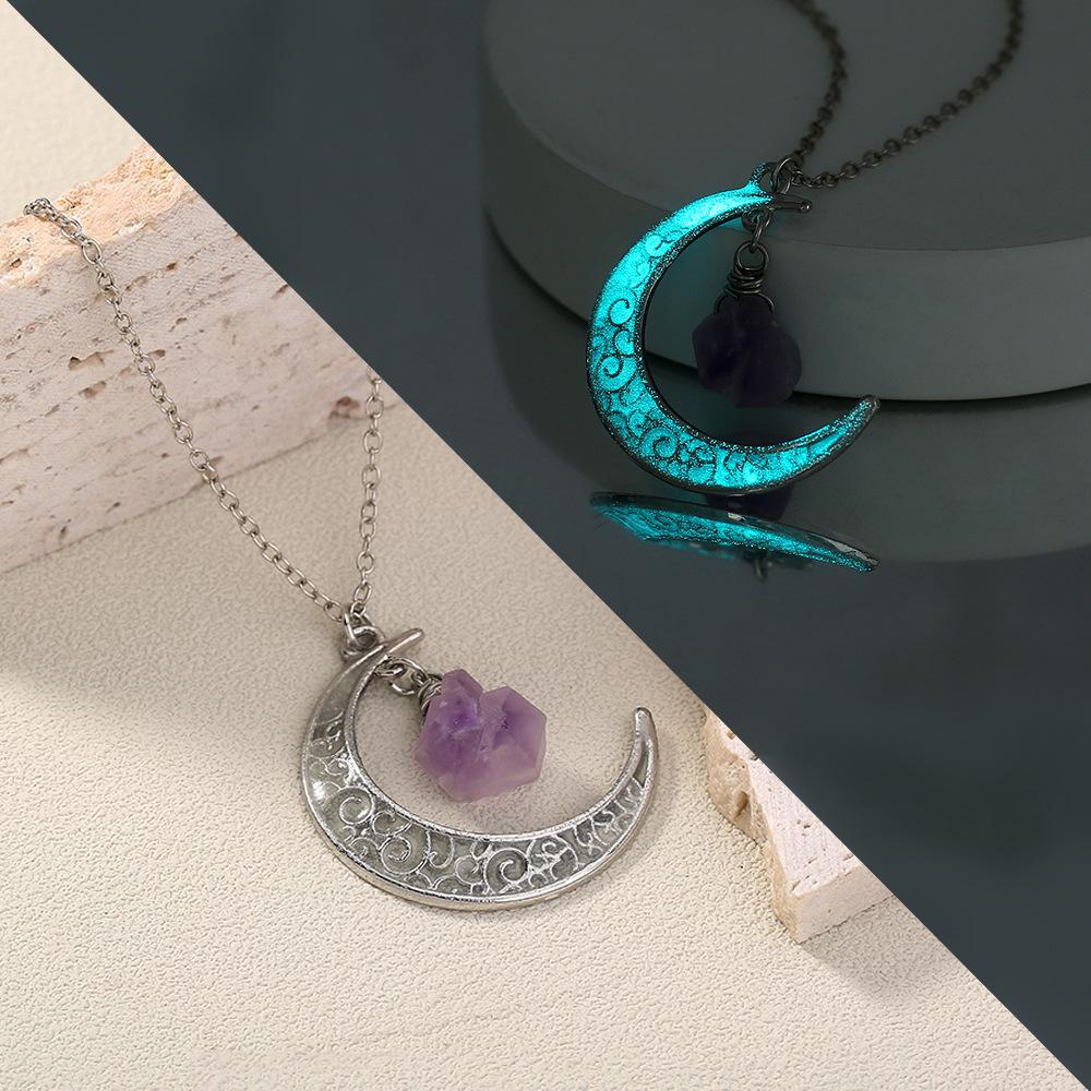 Collar con colgante de piedra natural púrpura, joyería clásica creativa europea y americana con forma de luna luminosa de noche extraña