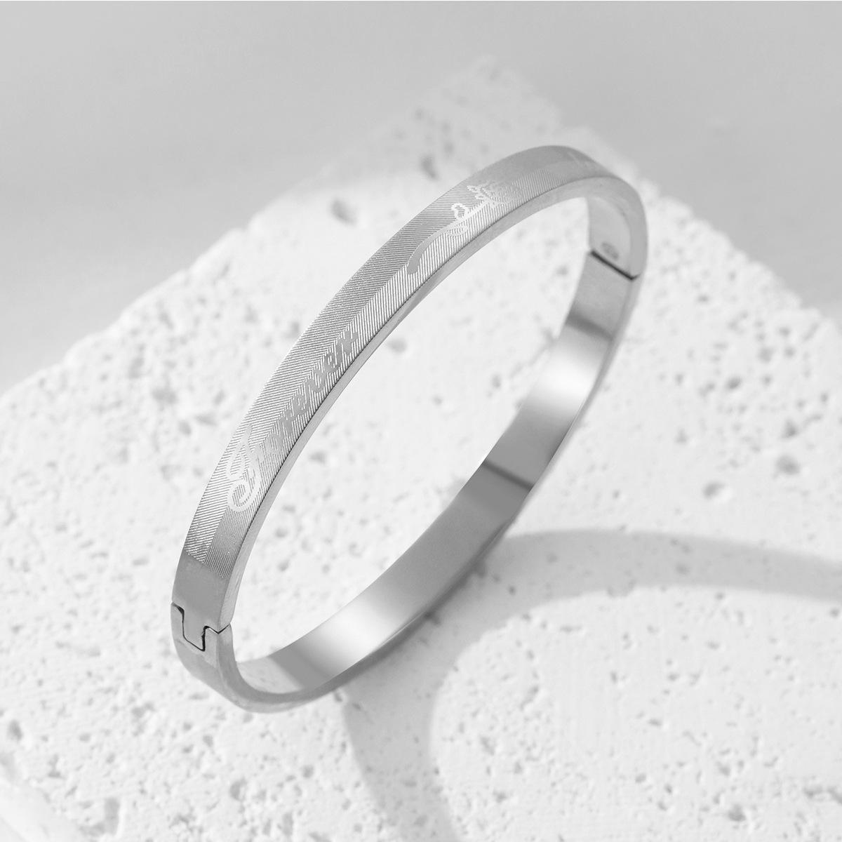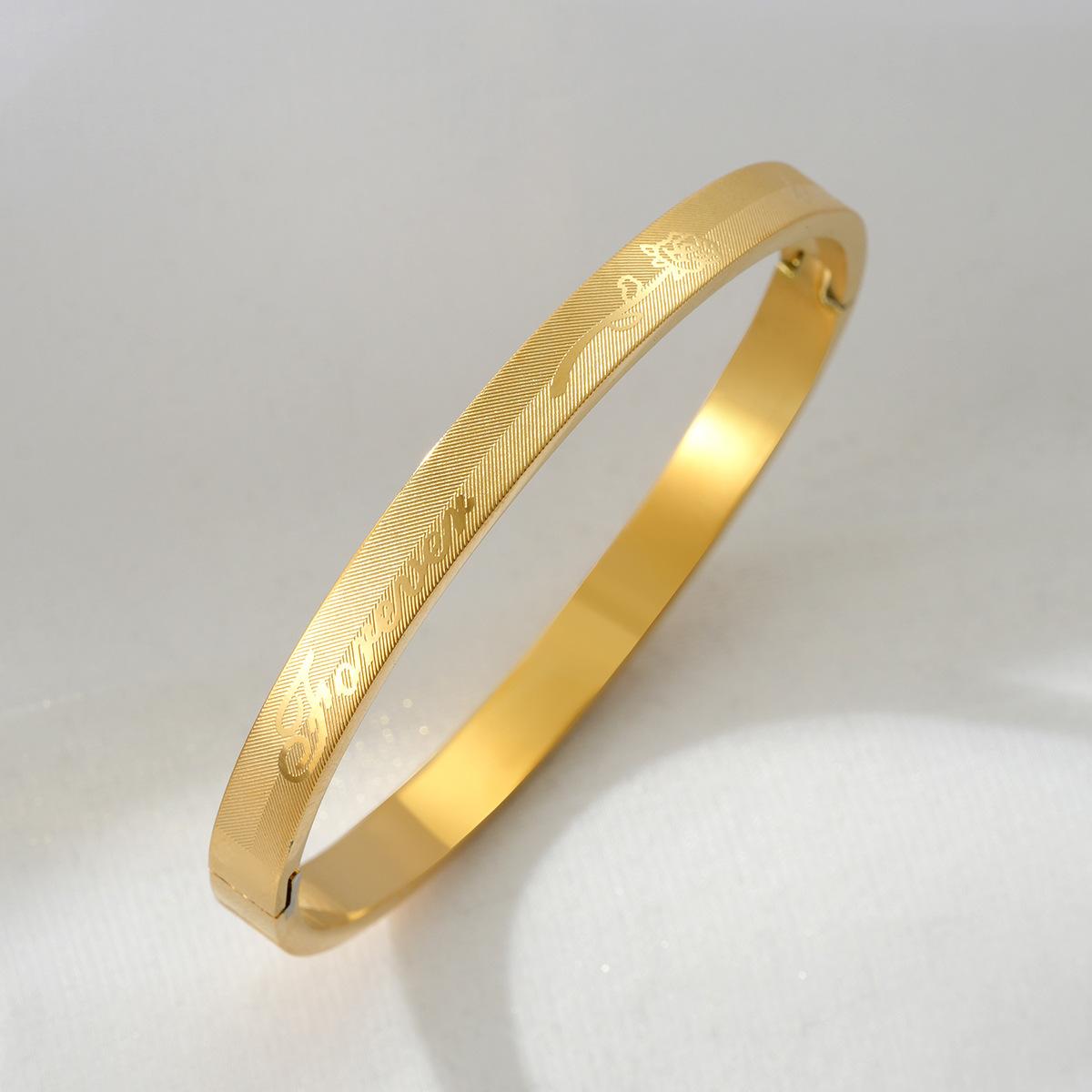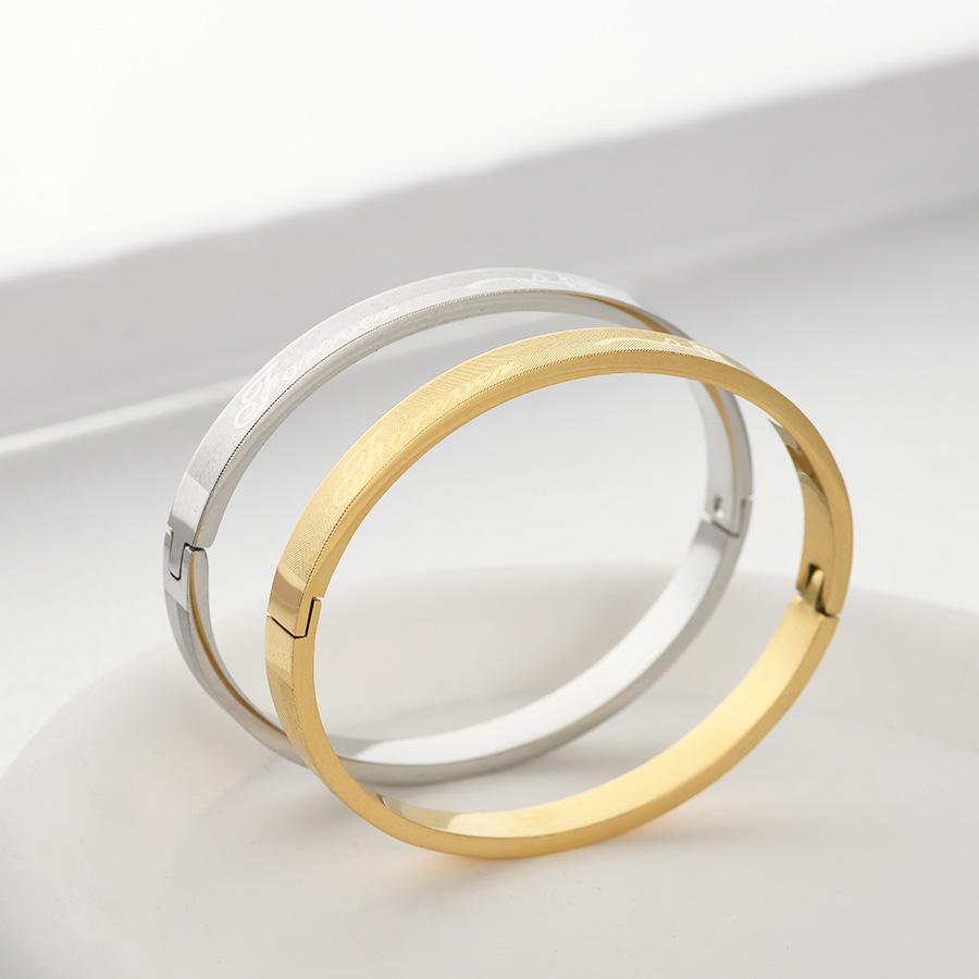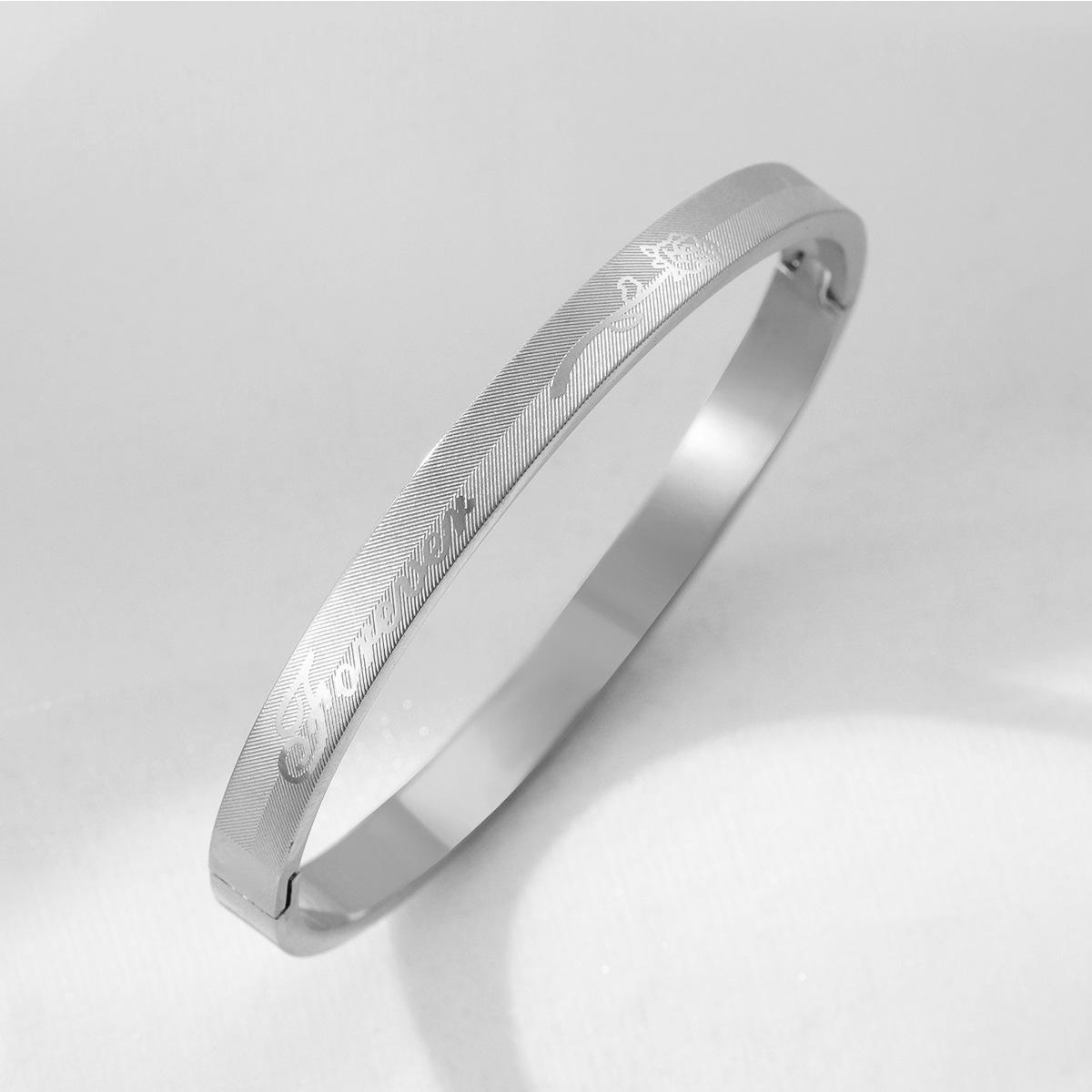 Fabricantes de pulseras de acero de titanio al por mayor, pulsera ajustable abierta en forma de C, pulsera femenina de acero inoxidable con logotipo de texto grabado.