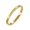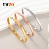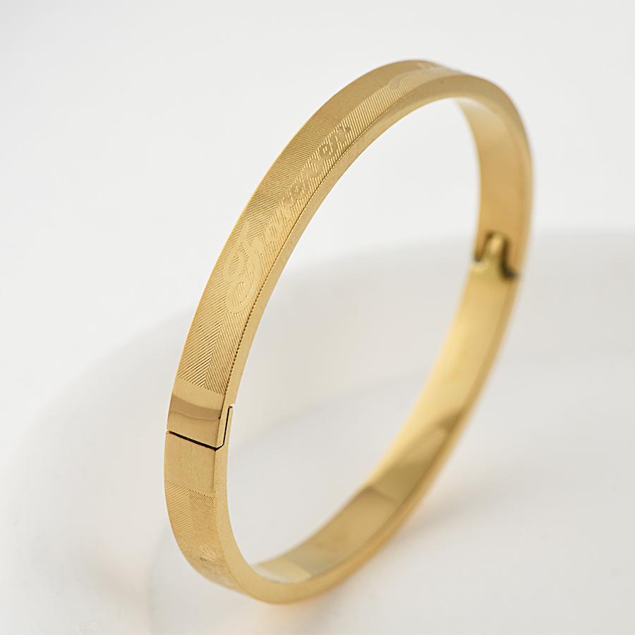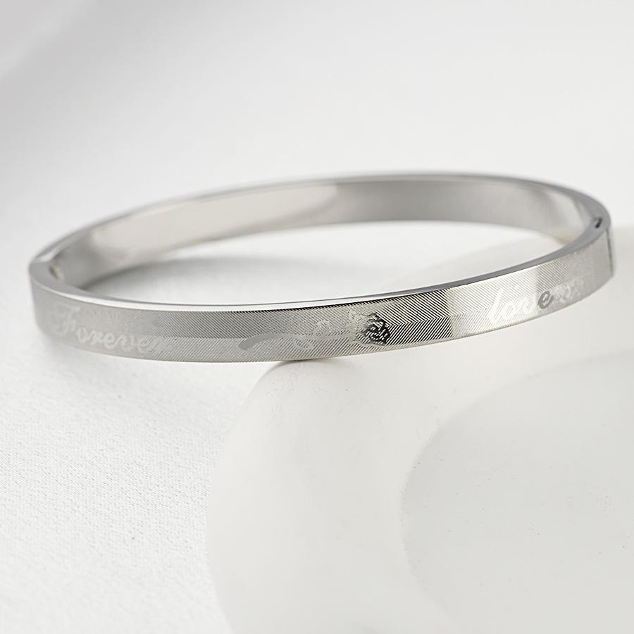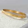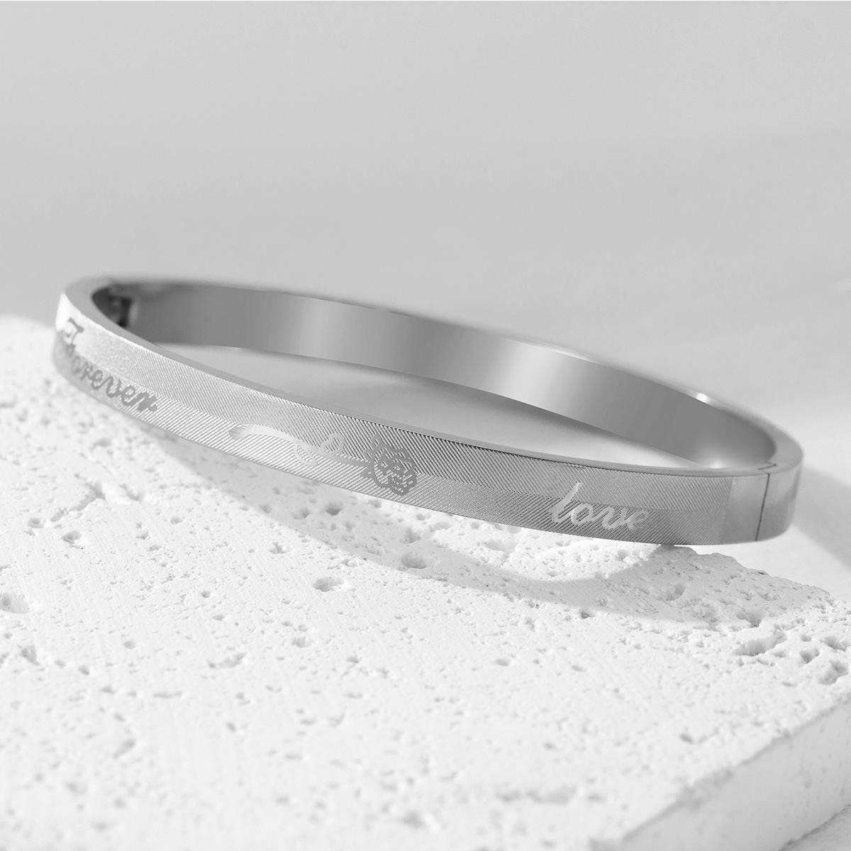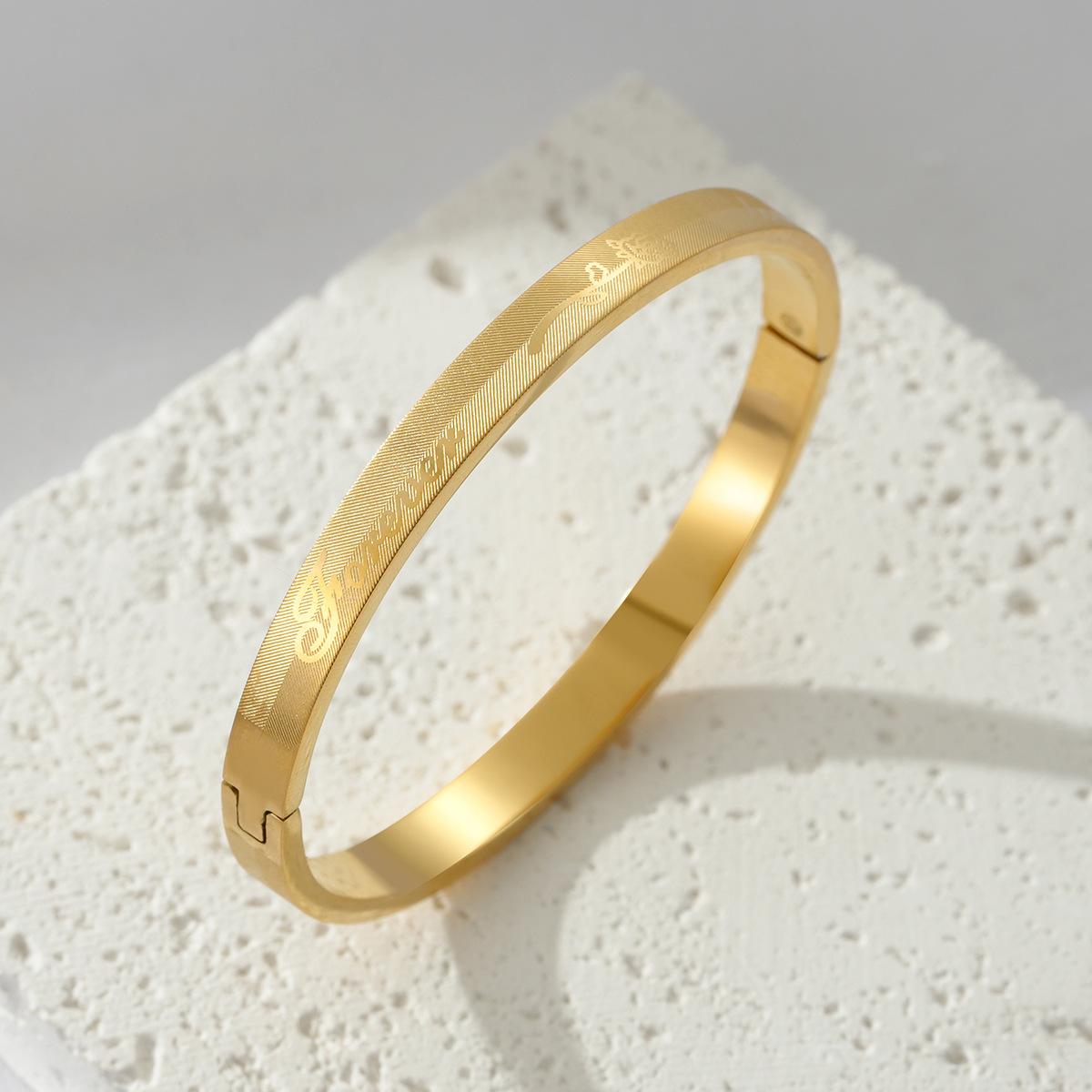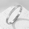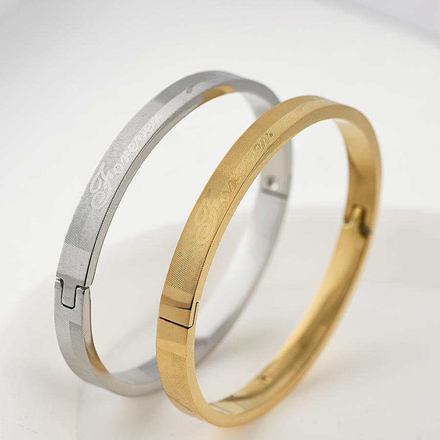 Fabricantes de pulseras de acero de titanio al por mayor, pulsera ajustable abierta en forma de C, pulsera femenina de acero inoxidable con logotipo de texto grabado.