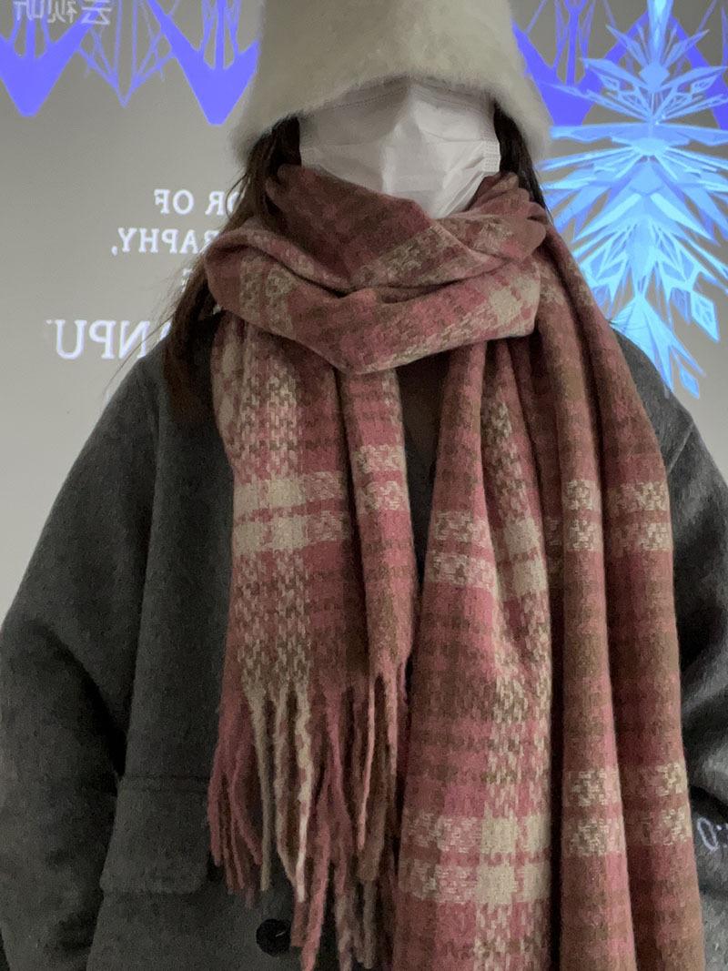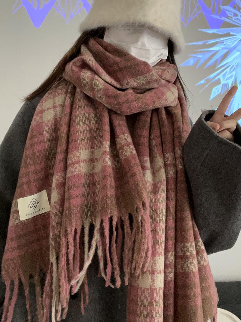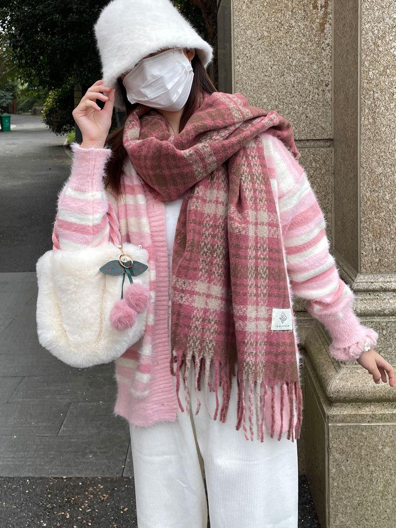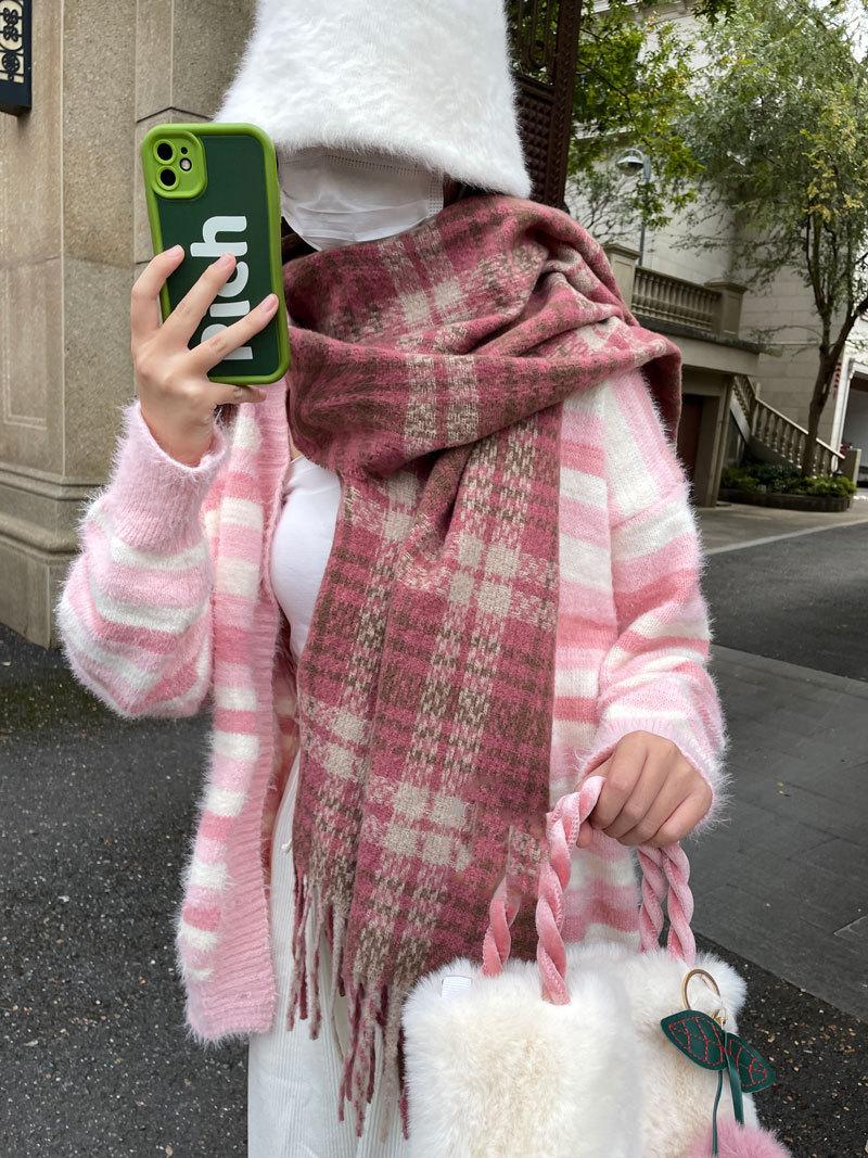 Color Rosa Invierno avanzado versátil estilo universitario casual estilo coreano simple cálido blanco a cuadros lana tejida bufanda