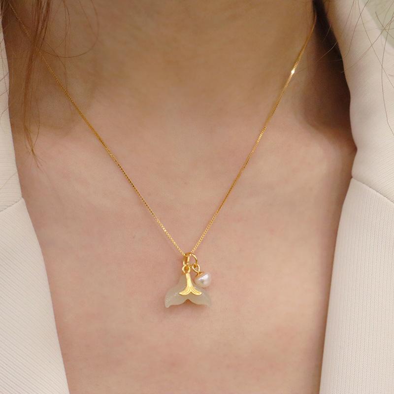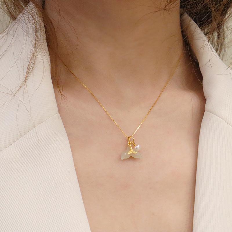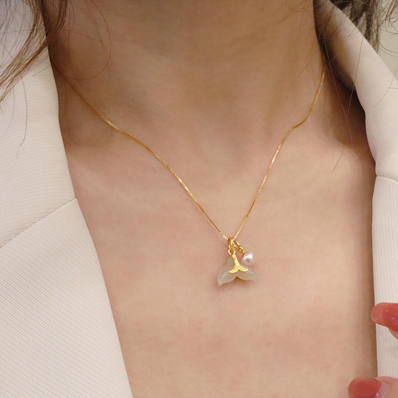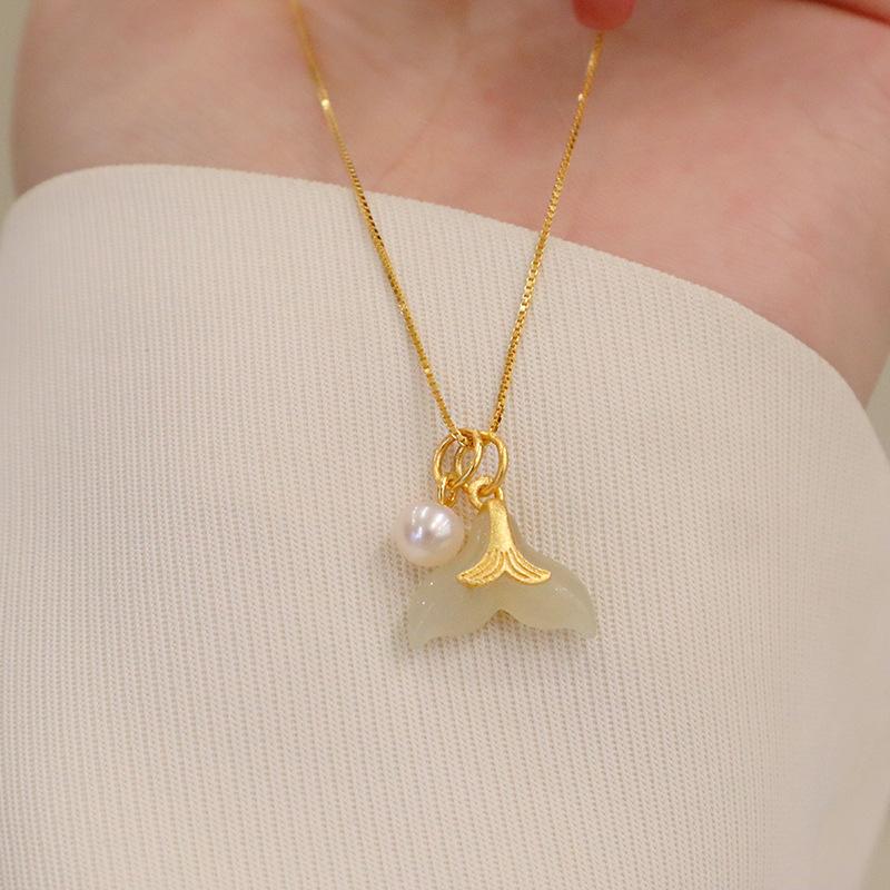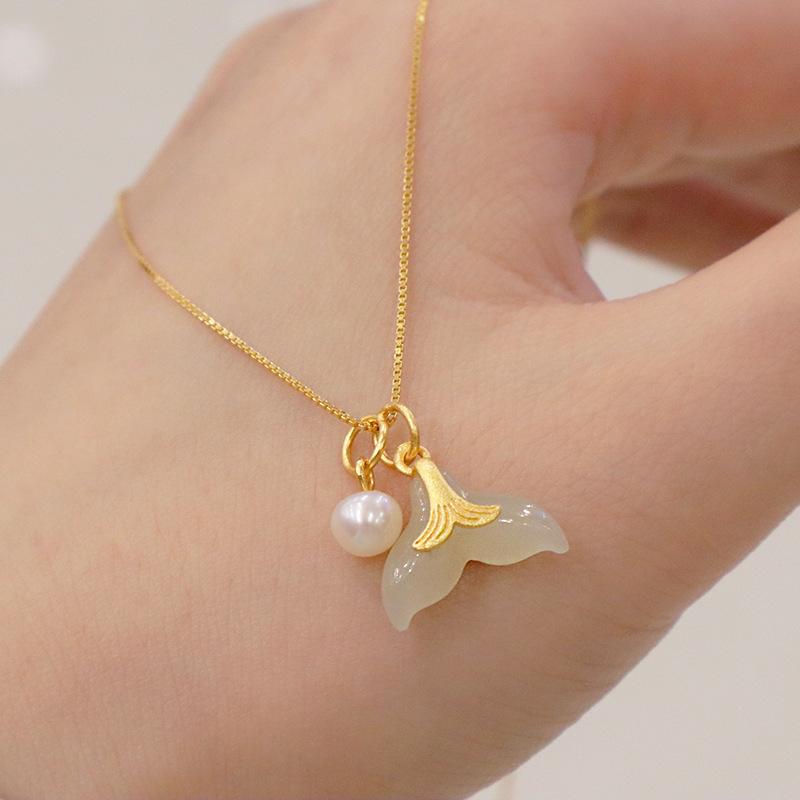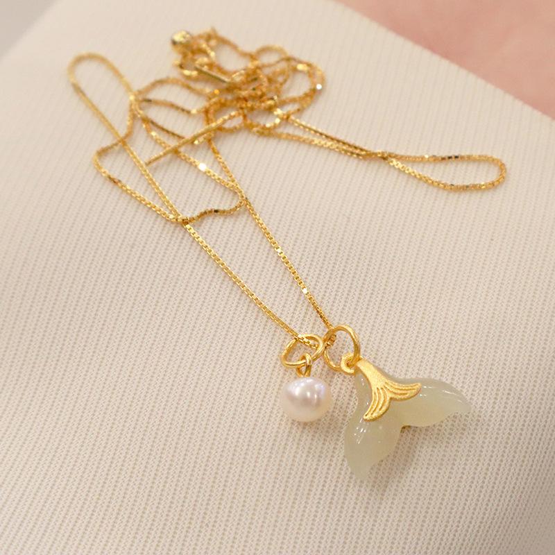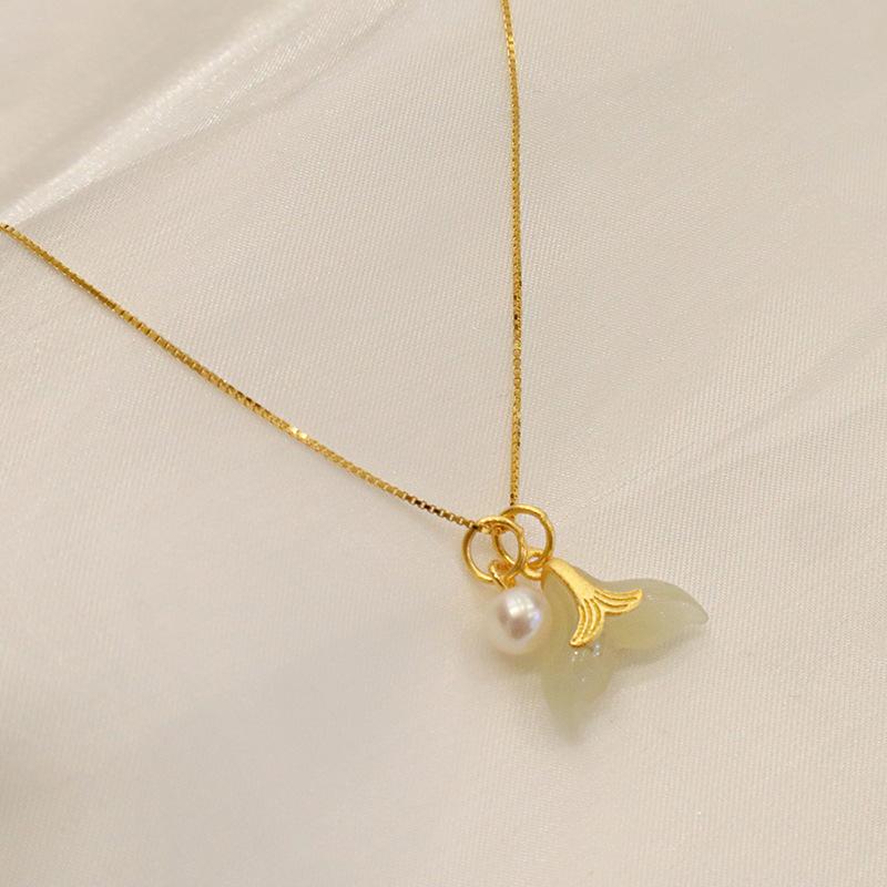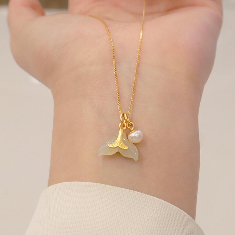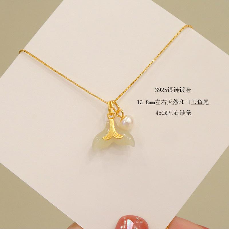 Collar de jade hetiano natural con colgante de perla de cola de pez, cadena de clavícula, diseño de nicho, estilo Sense ins, collar de perlas de plata esterlina