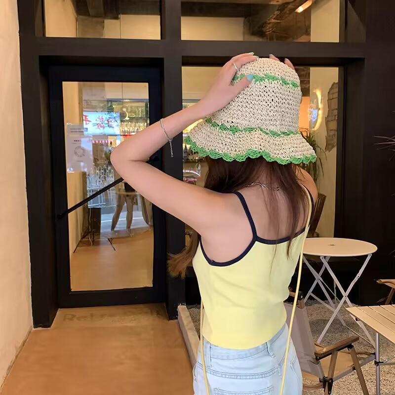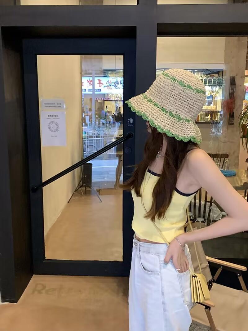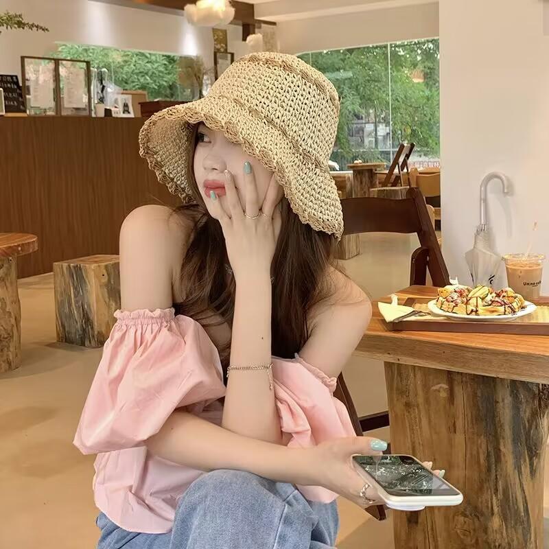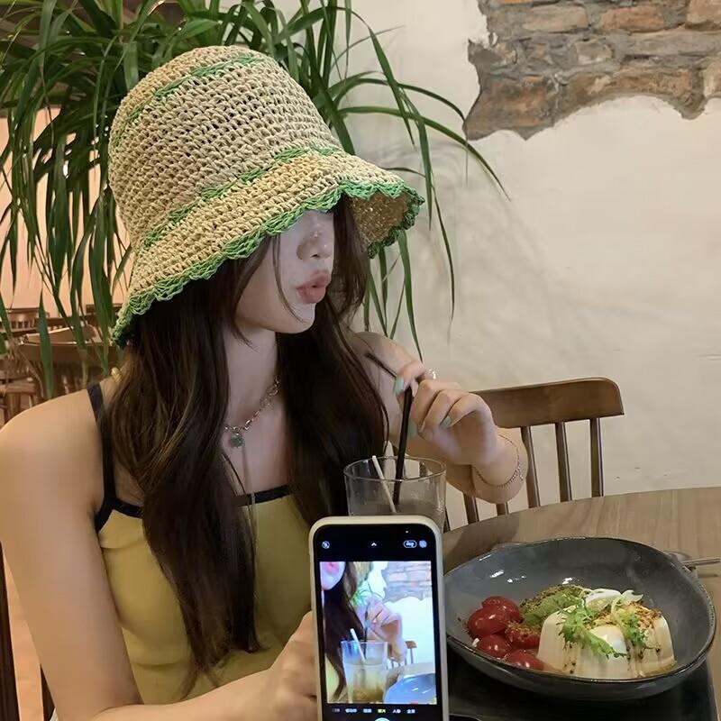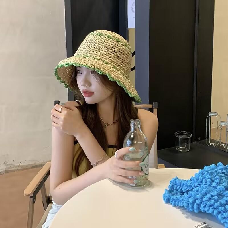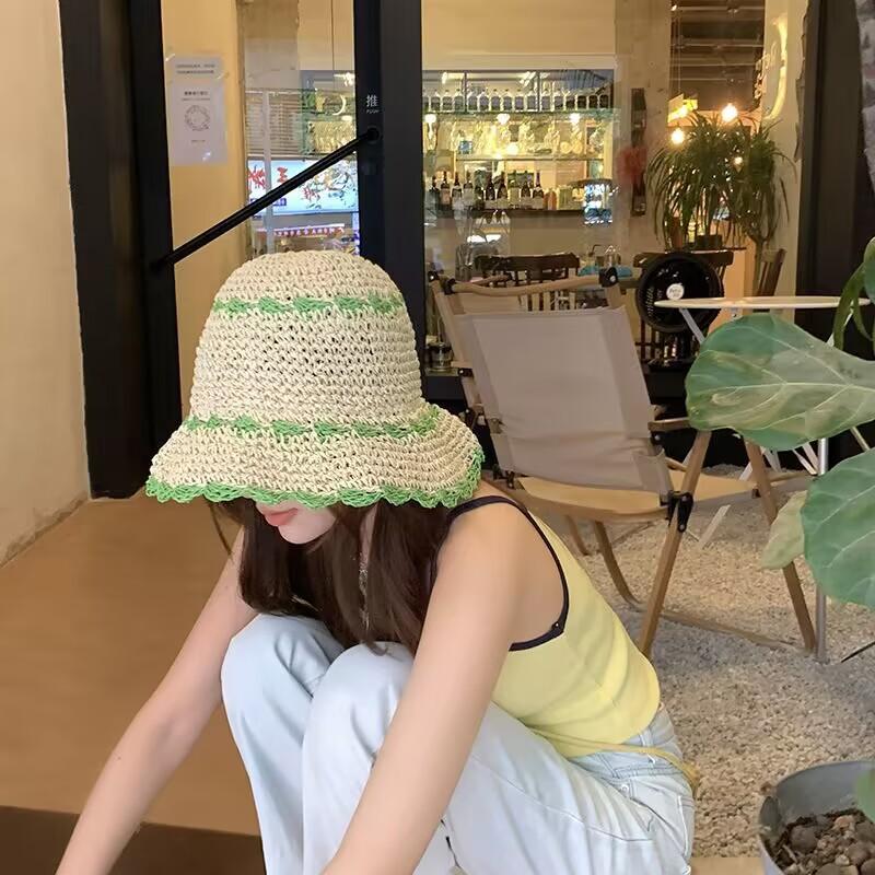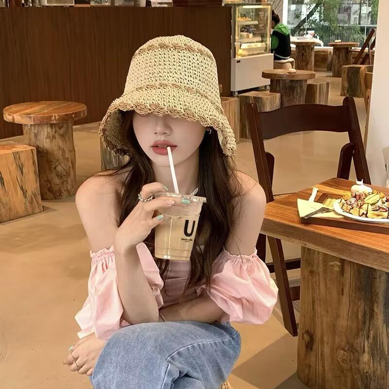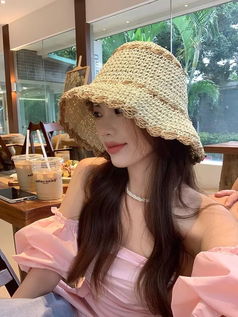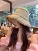 Sombrero de paja para mujer, estilo coreano, combina con todo, estilo japonés, sombrero de pescador de paja hueca para verano, para playa, vacaciones, sombrilla, sombrero de cubo moderno.