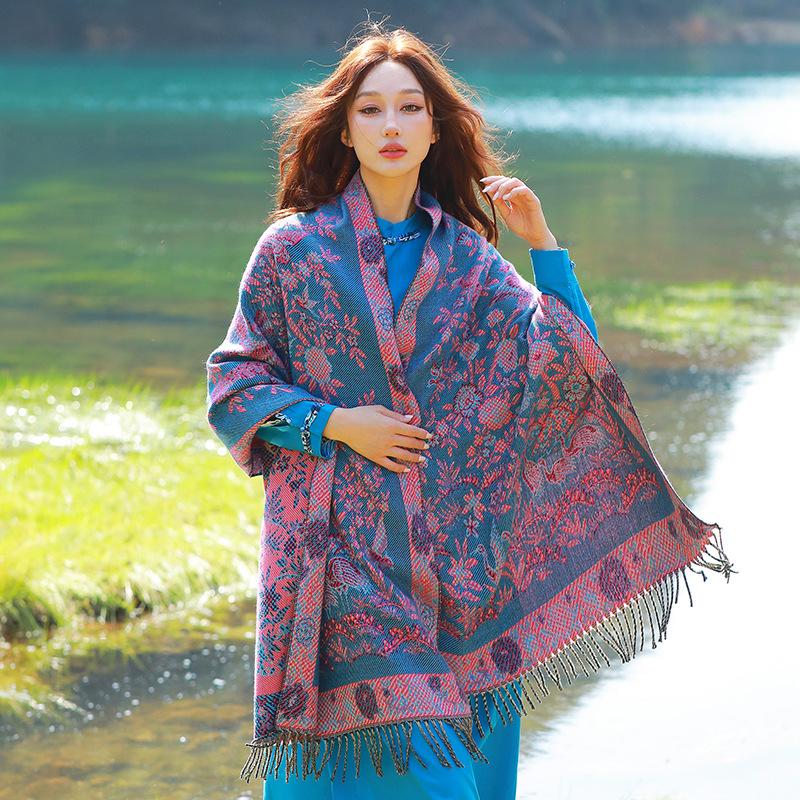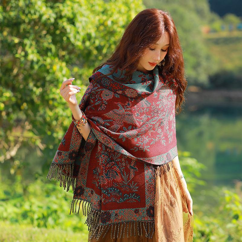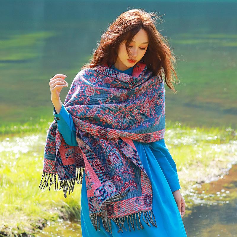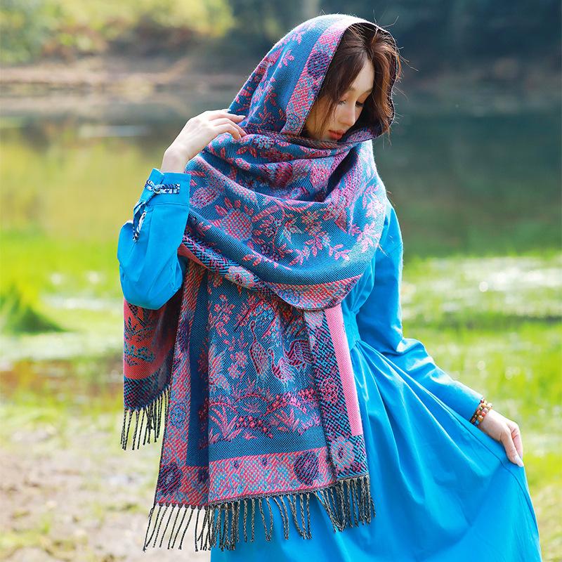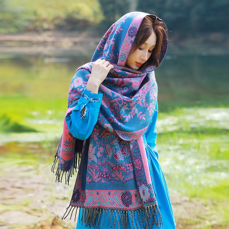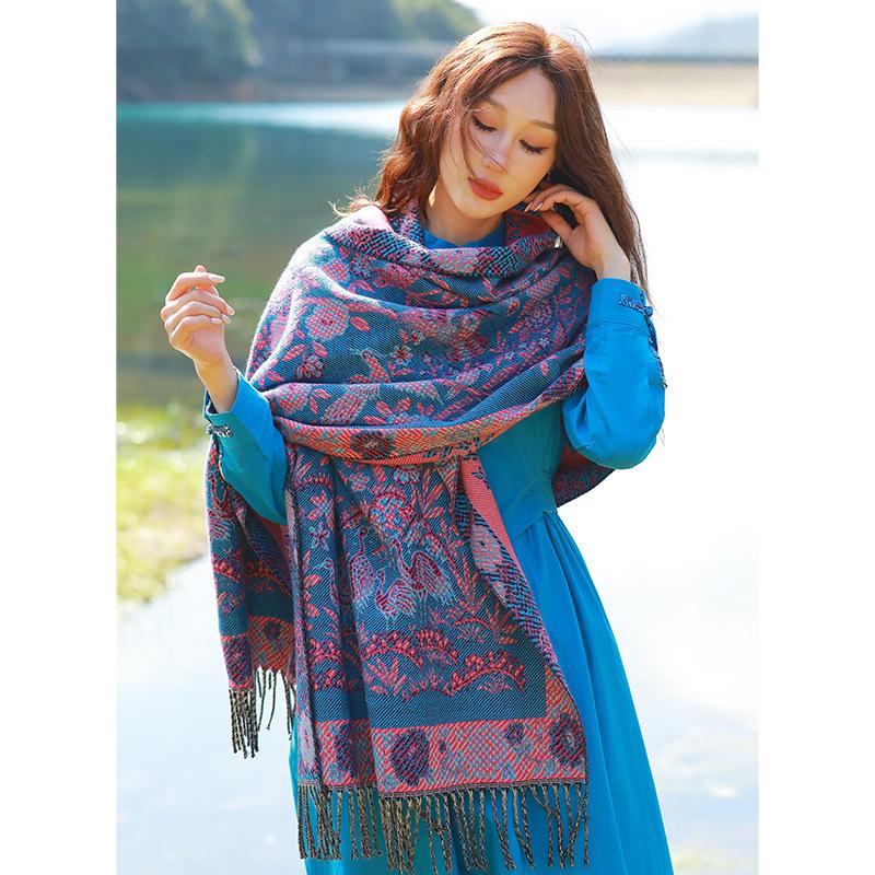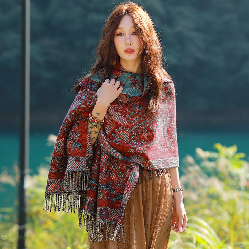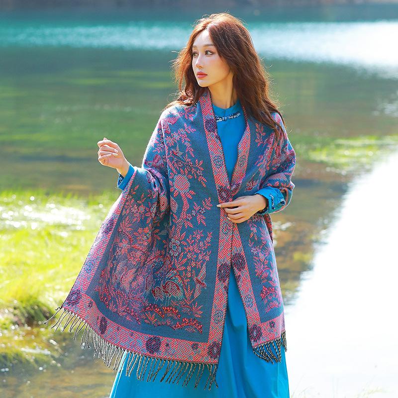 Capa de estilo étnico de invierno para mujer, nueva bufanda artística de turismo de Yunnan Erhai, bufanda gruesa y cálida que combina con todo.