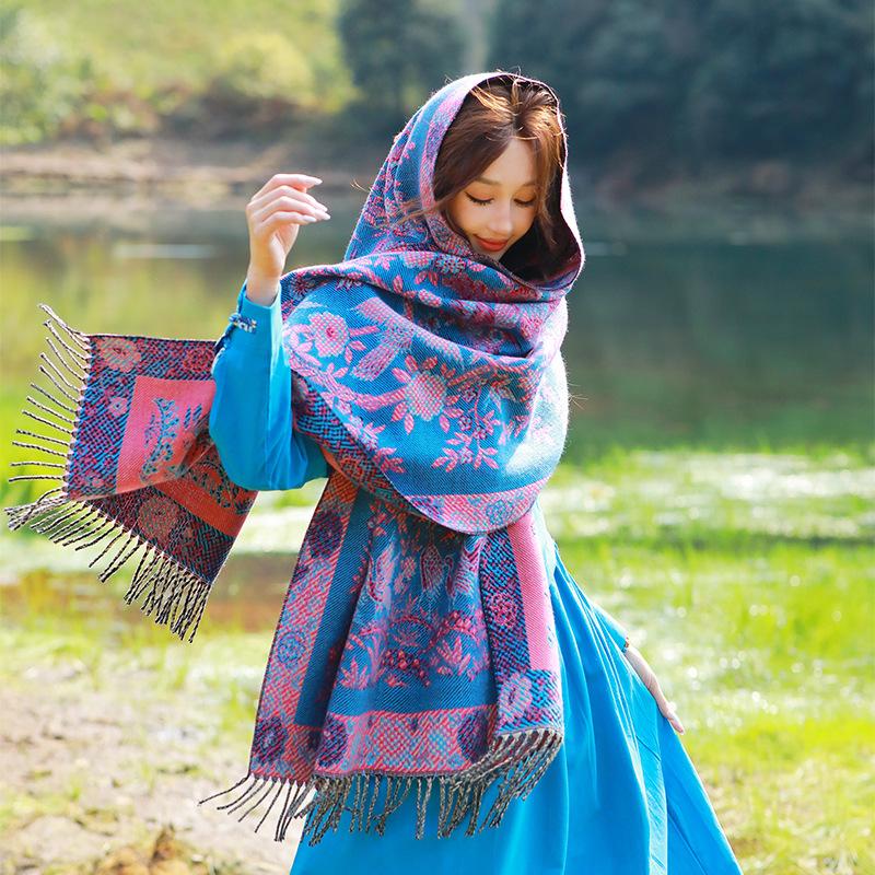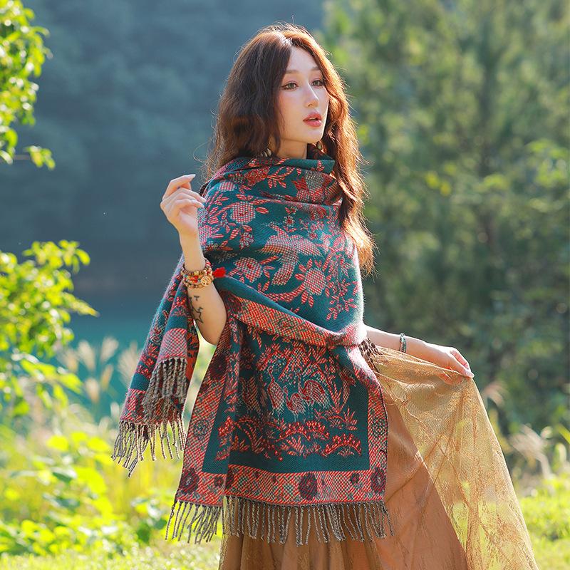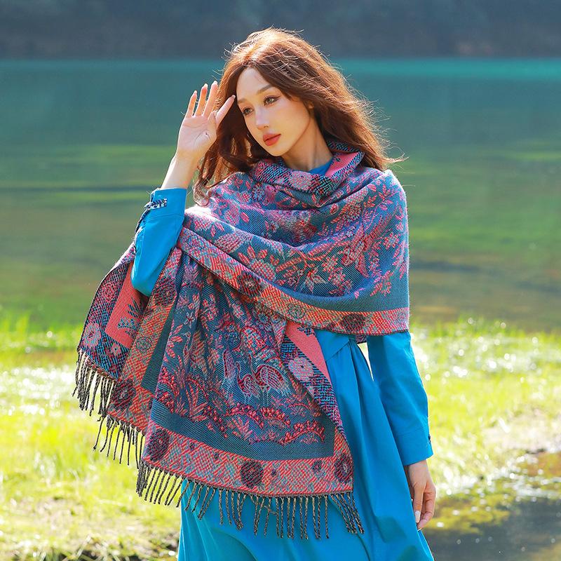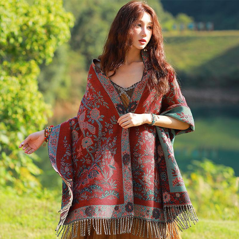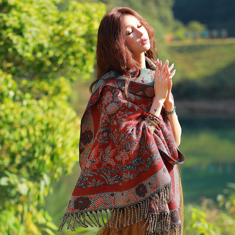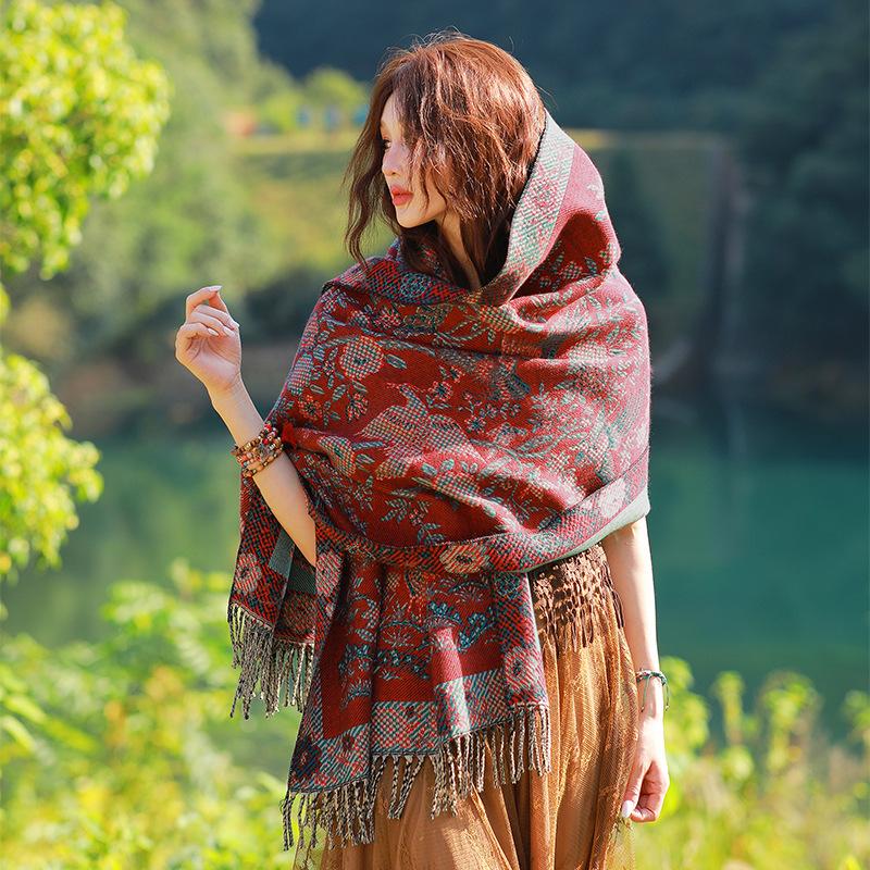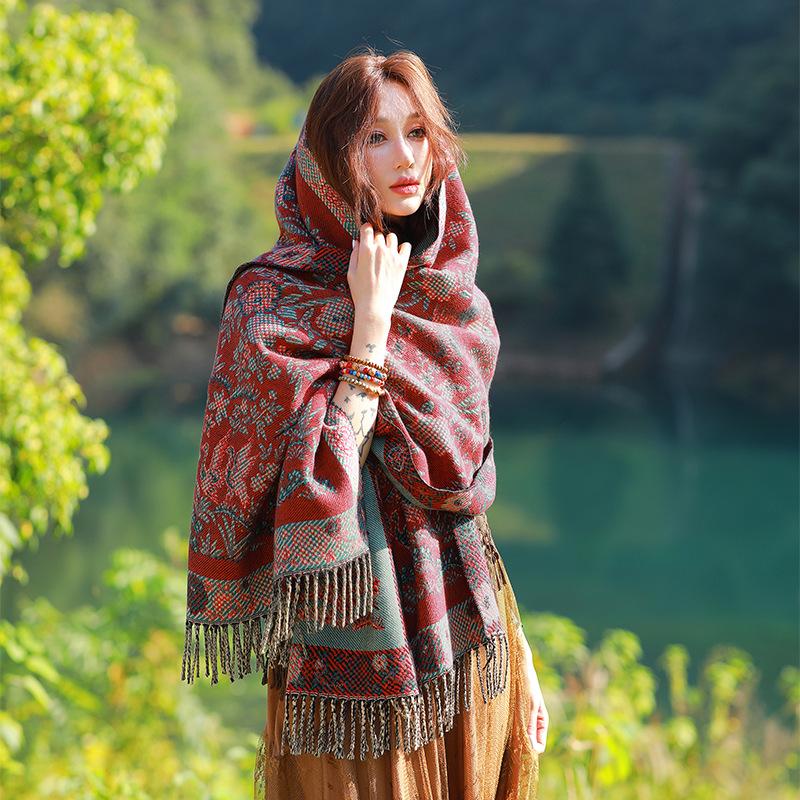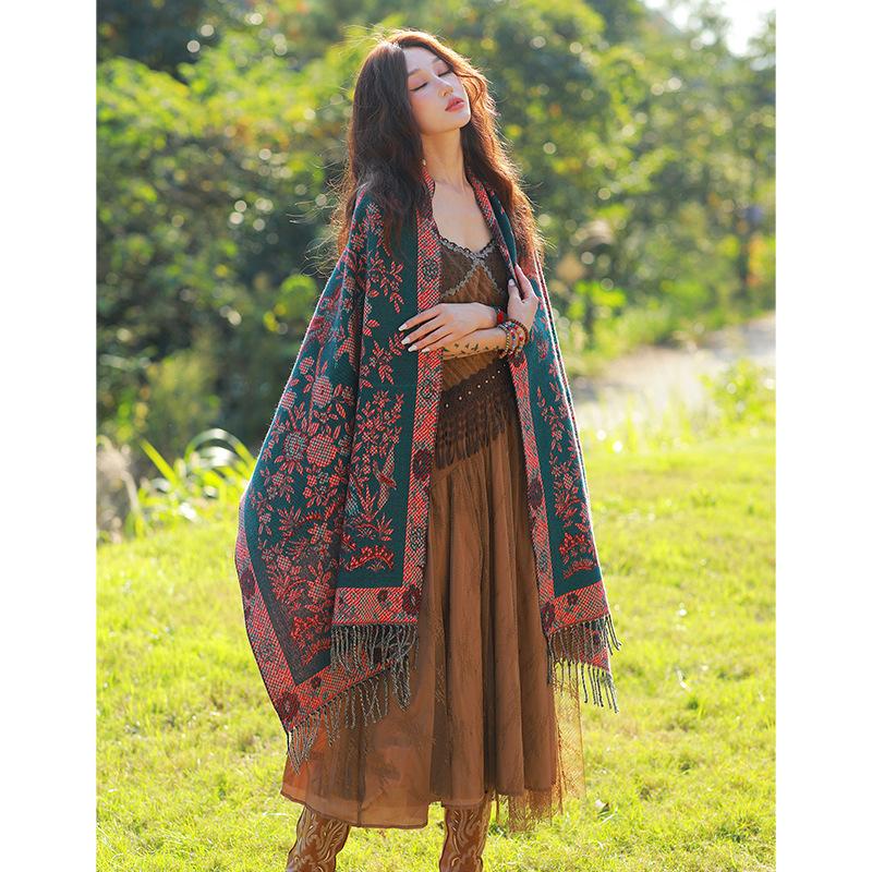 Capa de estilo étnico de invierno para mujer, nueva bufanda artística de turismo de Yunnan Erhai, bufanda gruesa y cálida que combina con todo.