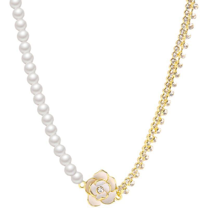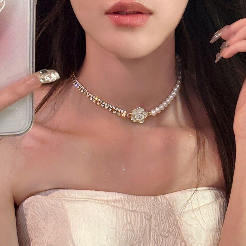 Amor de Camelia ~ Collar de perlas de camelia retro francesas. Collar de cadena de clavícula con diseño de nicho de lujo ligero para mujer.