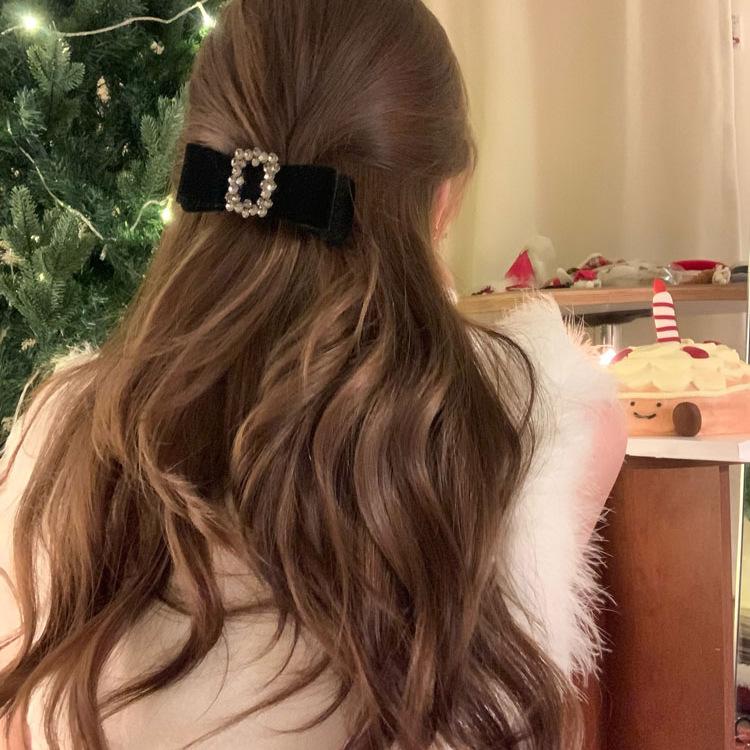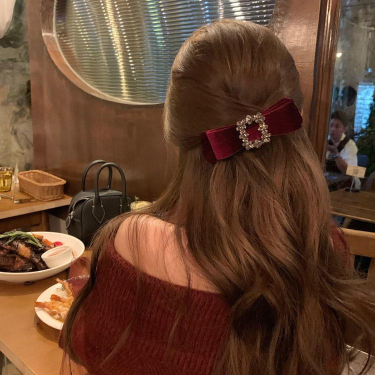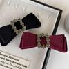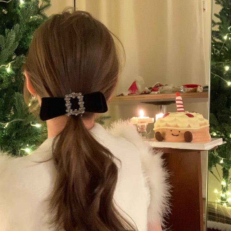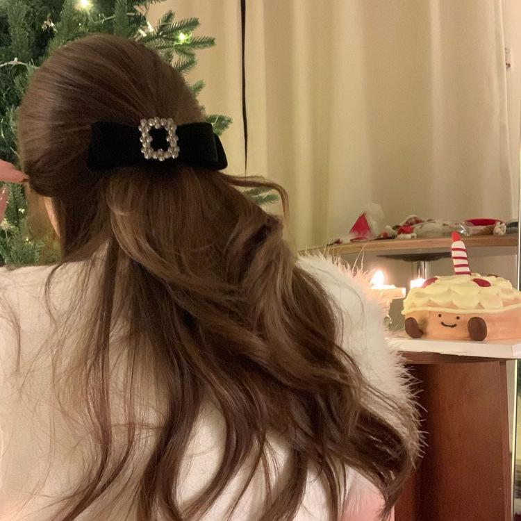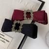 Horquilla con lazo de terciopelo negro tridimensional con diamantes cuadrados dorados para mujer, pinza para el pelo con lazo en la espalda, tocado