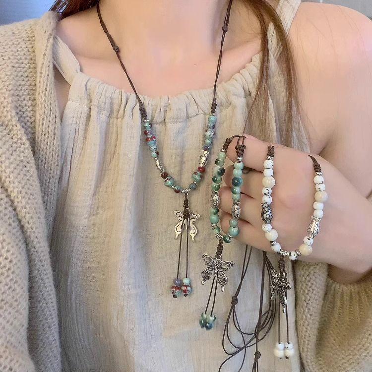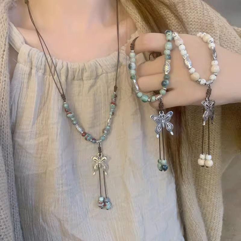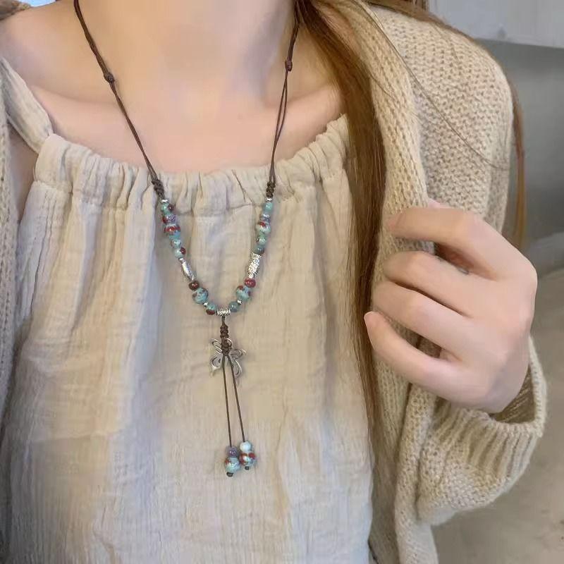 Collar de cuerda tejida con mariposas de cerámica y cuentas de colores, nuevo accesorio antiguo étnico chino, cadena de clavícula ligera de lujo de alta gama.