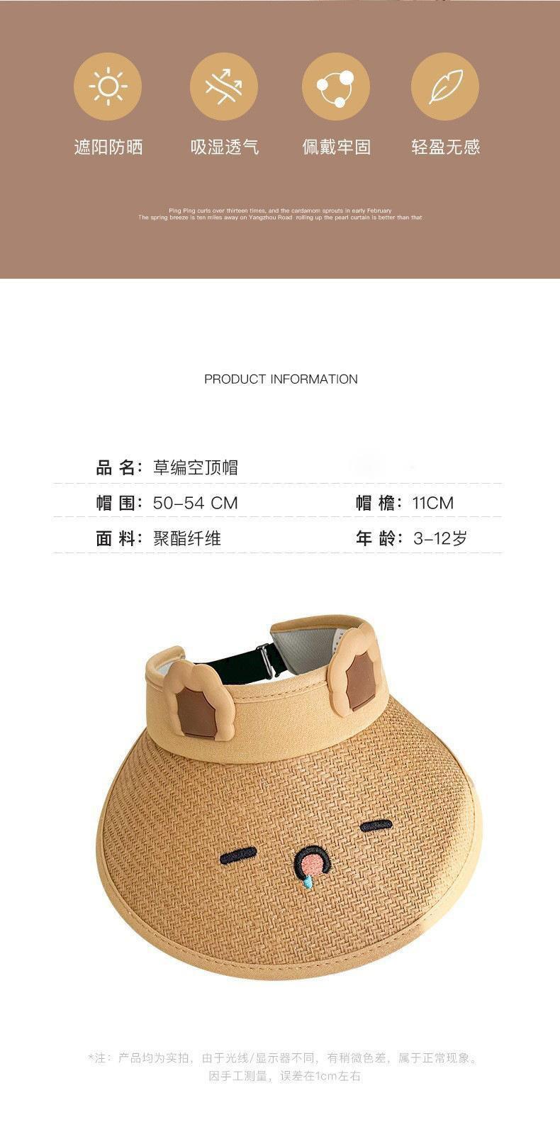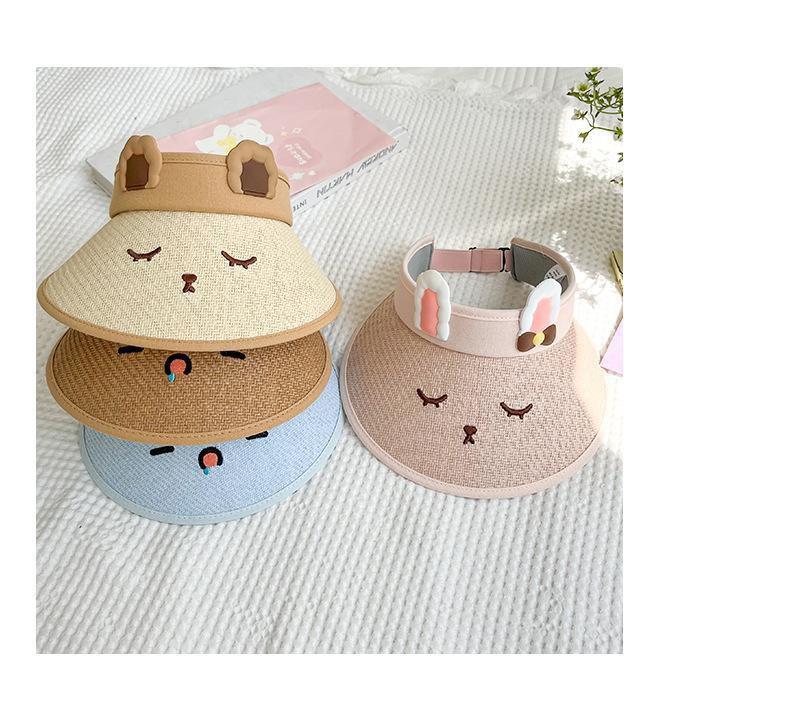 Sombrero de paja para niños con protección solar, transpirable, de verano, con diseño de oso de dibujos animados para bebé, con visera grande y parte superior vacía