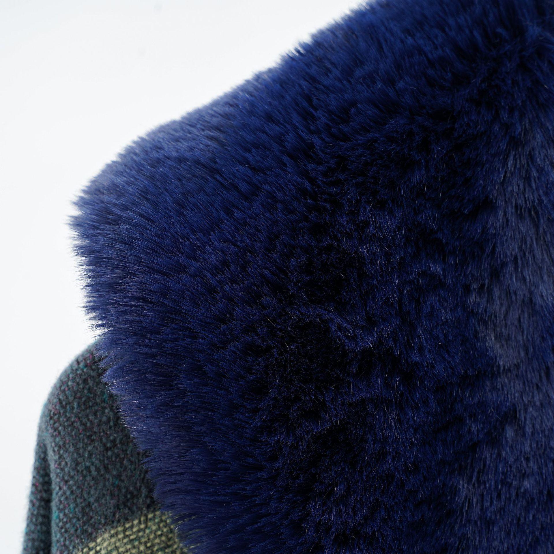 Capa chal para mujer con cuello de piel azul fiesta a cuadros, nueva, cálida, otoño e invierno