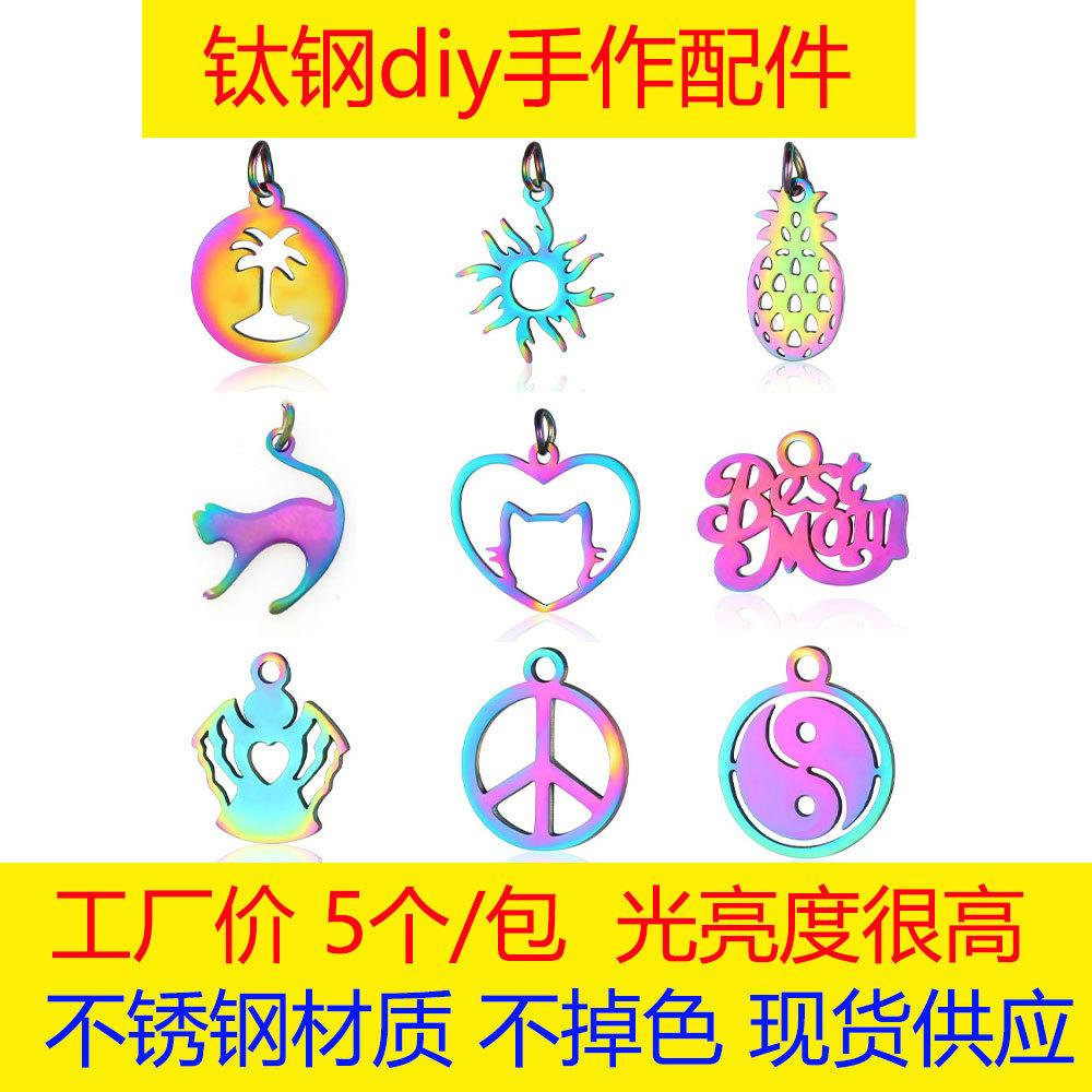 Paquete de 5 accesorios de joyería de acero de titanio con diseño de ángel, sol, Yin Yang, corazón de melocotón, piña, oso, acero inoxidable, colgante pequeño colorido DIY