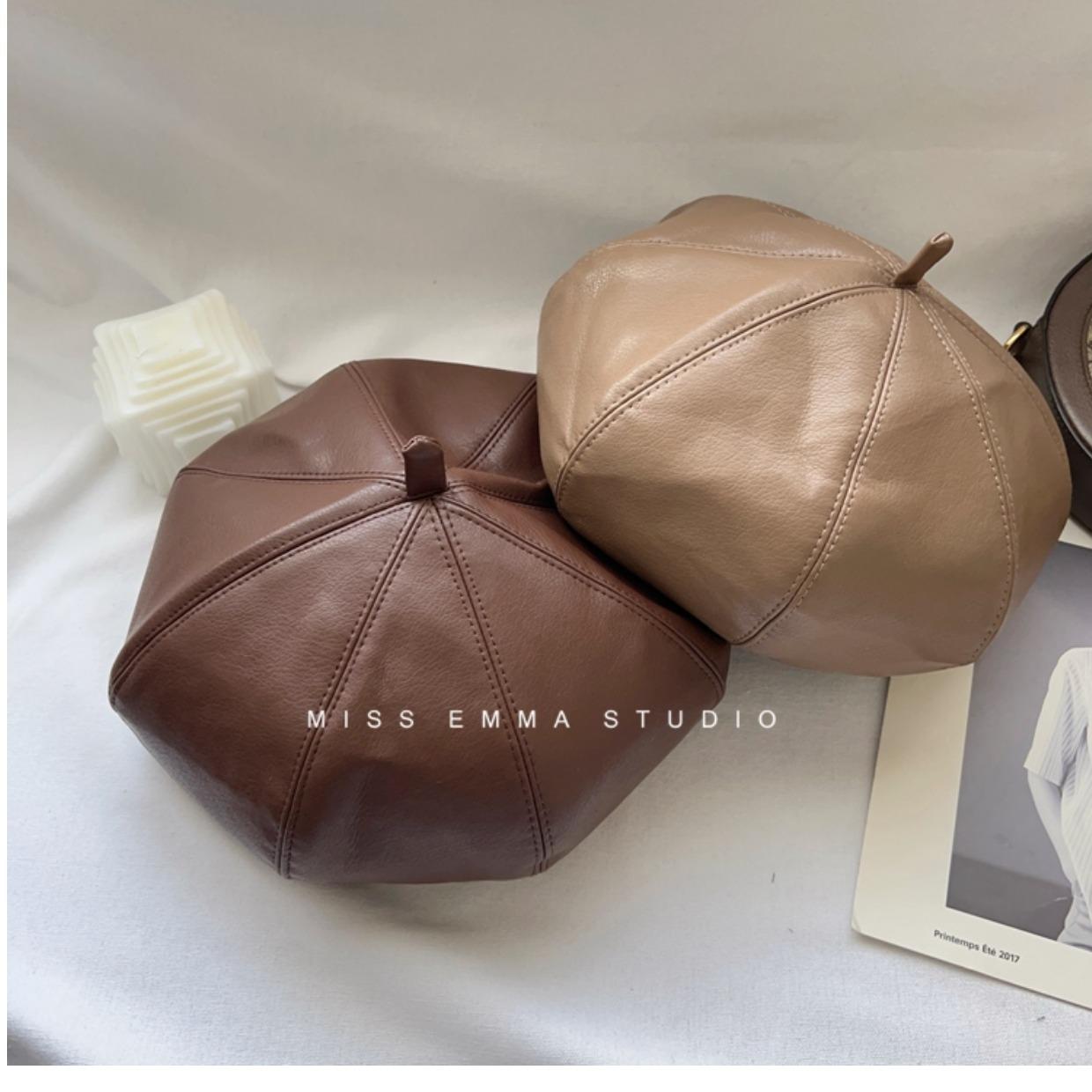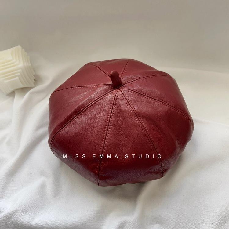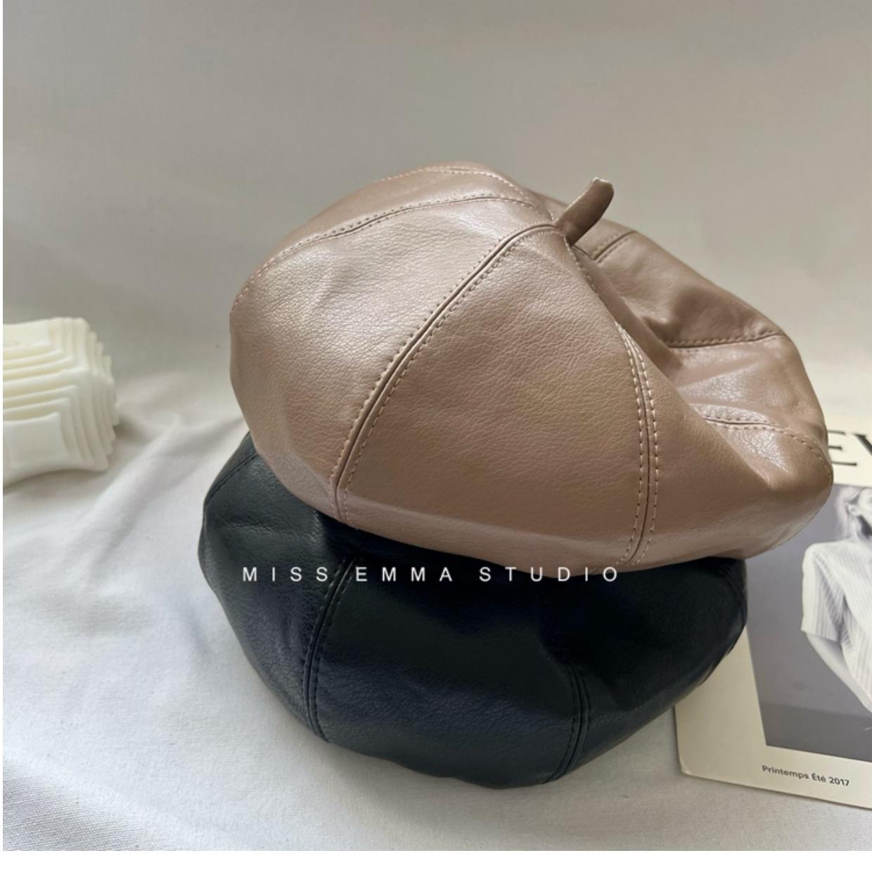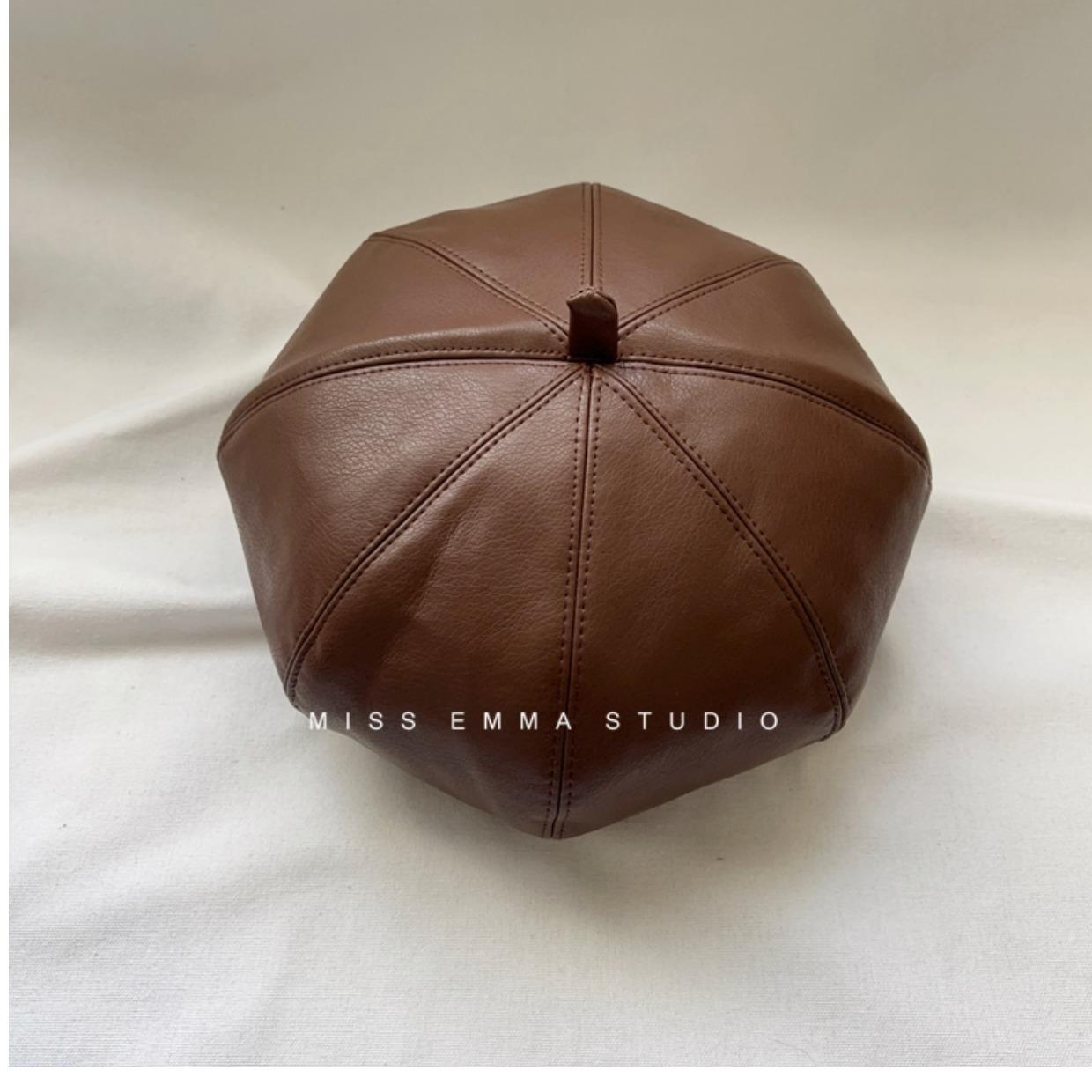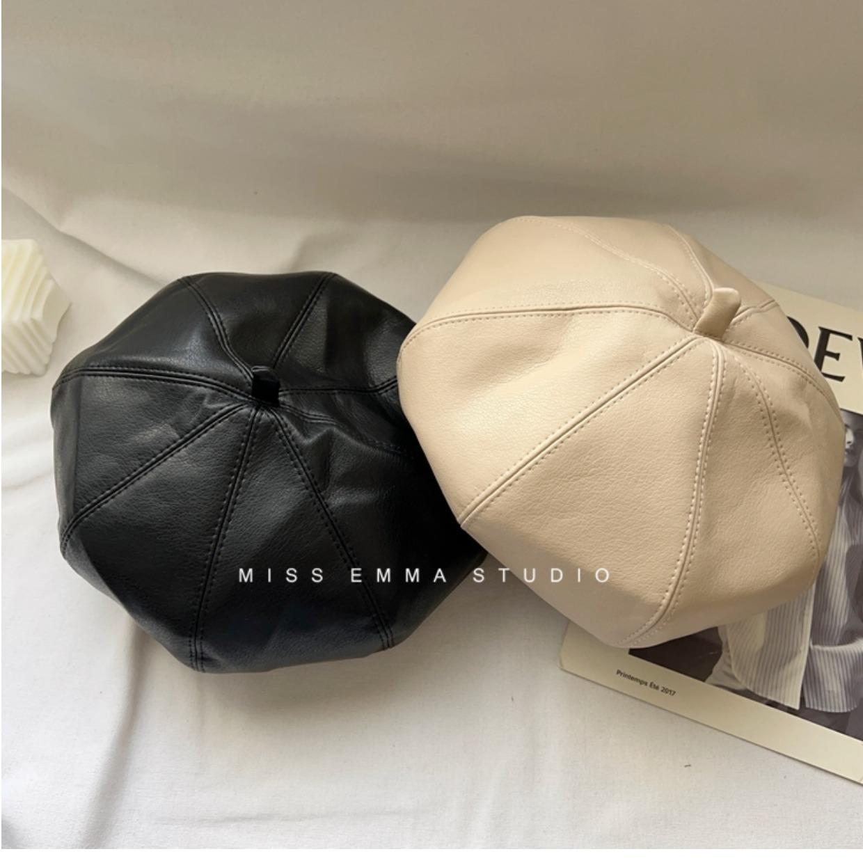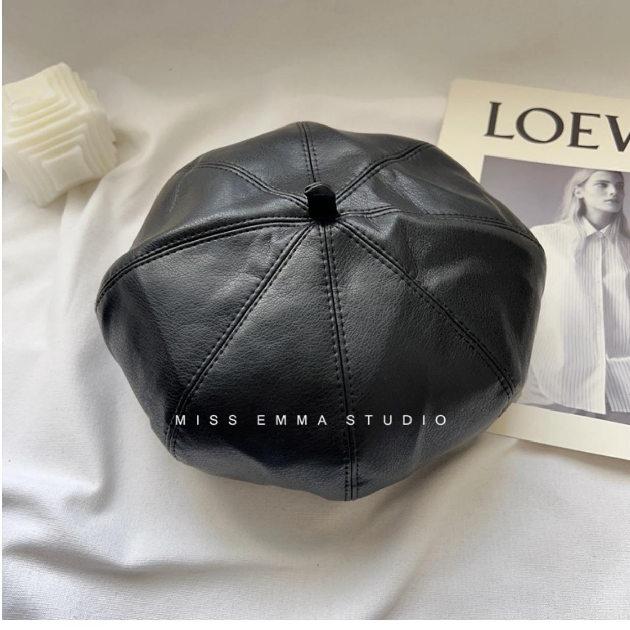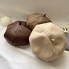 Boina de cuero PU de color sólido estilo japonés para mujer, negra, combinable con todo, que hace que la cara se vea pequeña, sombrero octogonal pequeño retro artístico de pintor, boina