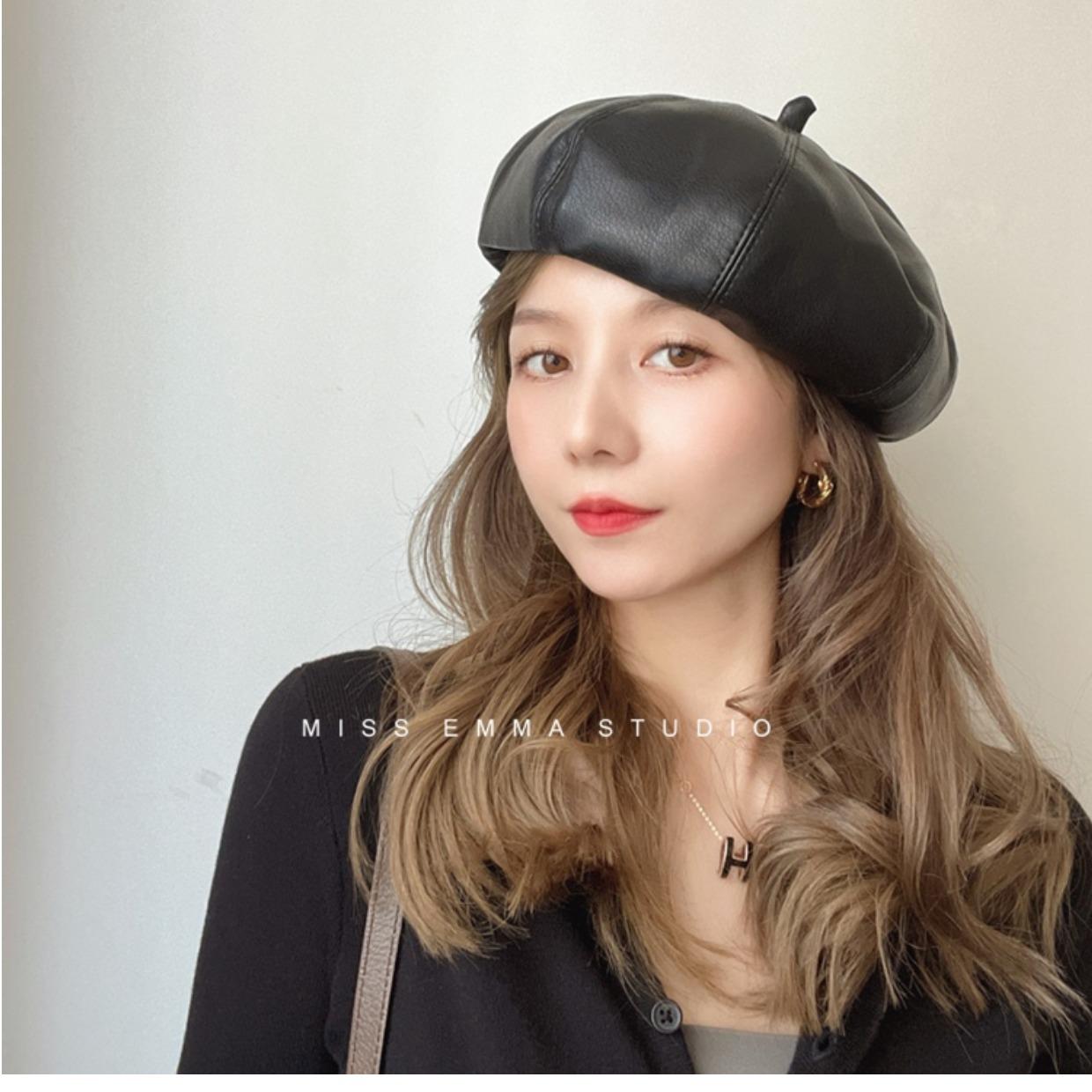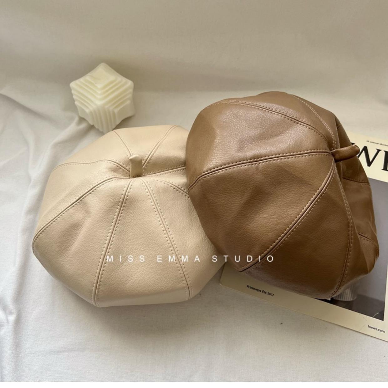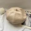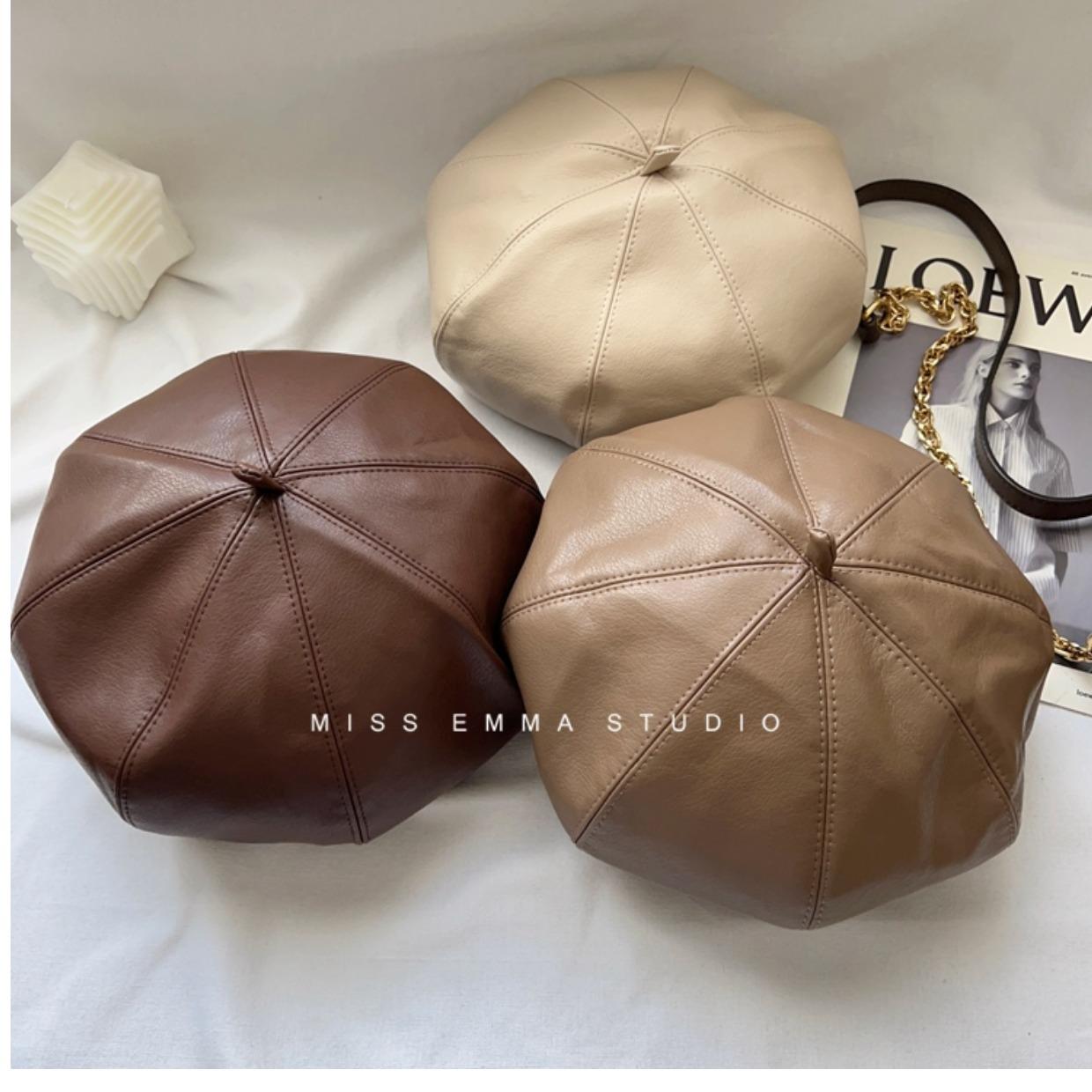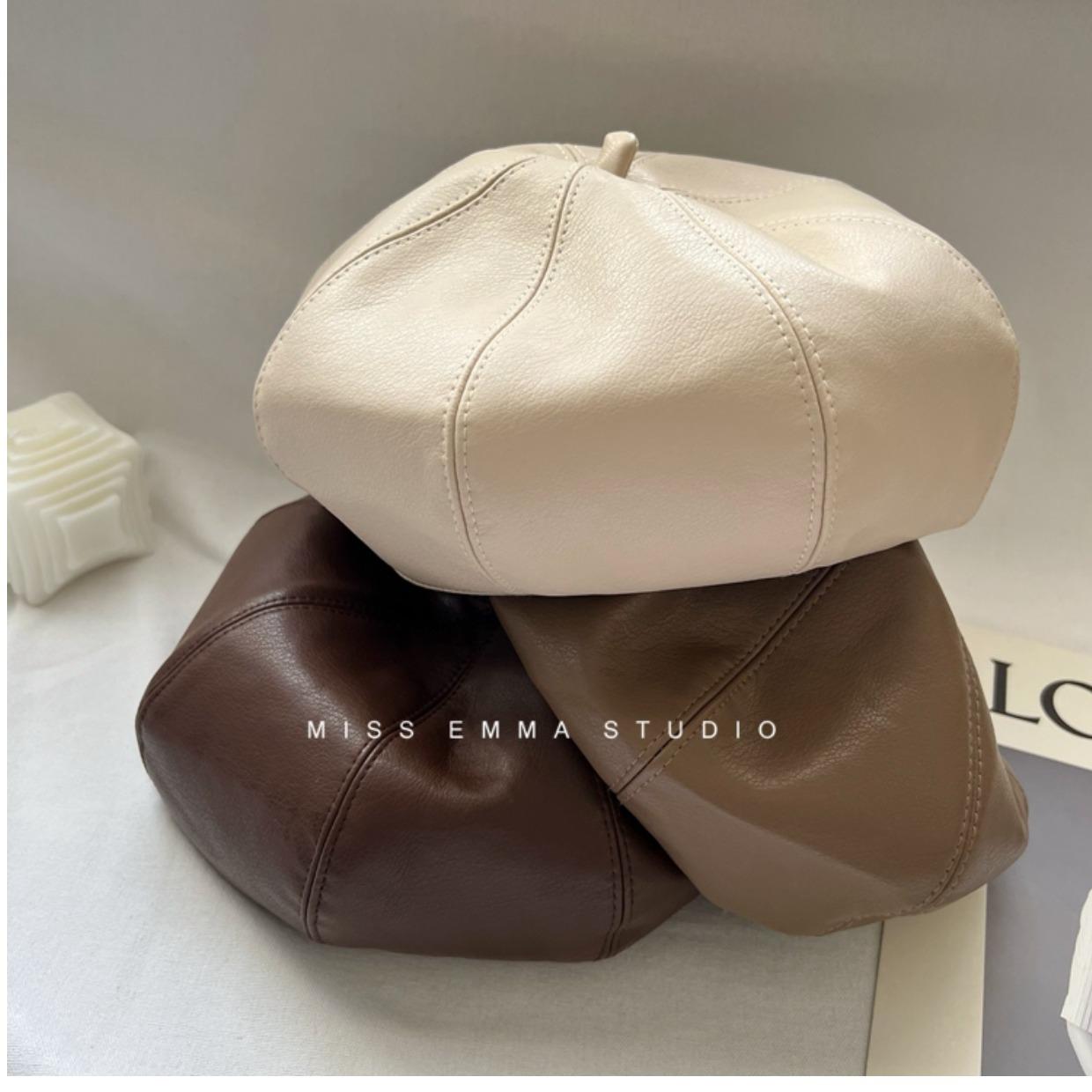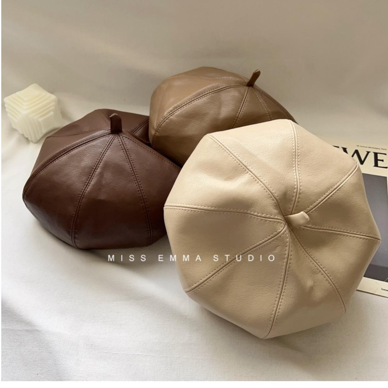 Boina de cuero PU de color sólido estilo japonés para mujer, negra, combinable con todo, que hace que la cara se vea pequeña, sombrero octogonal pequeño retro artístico de pintor, boina