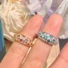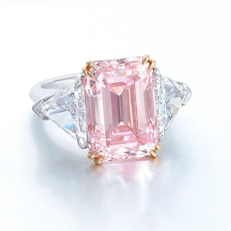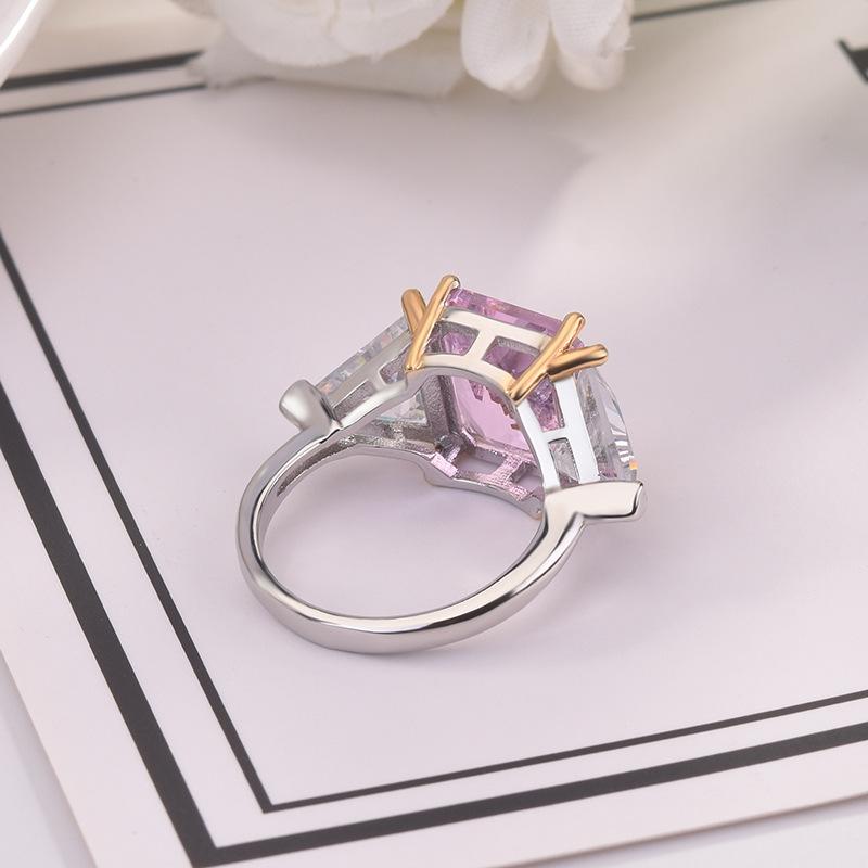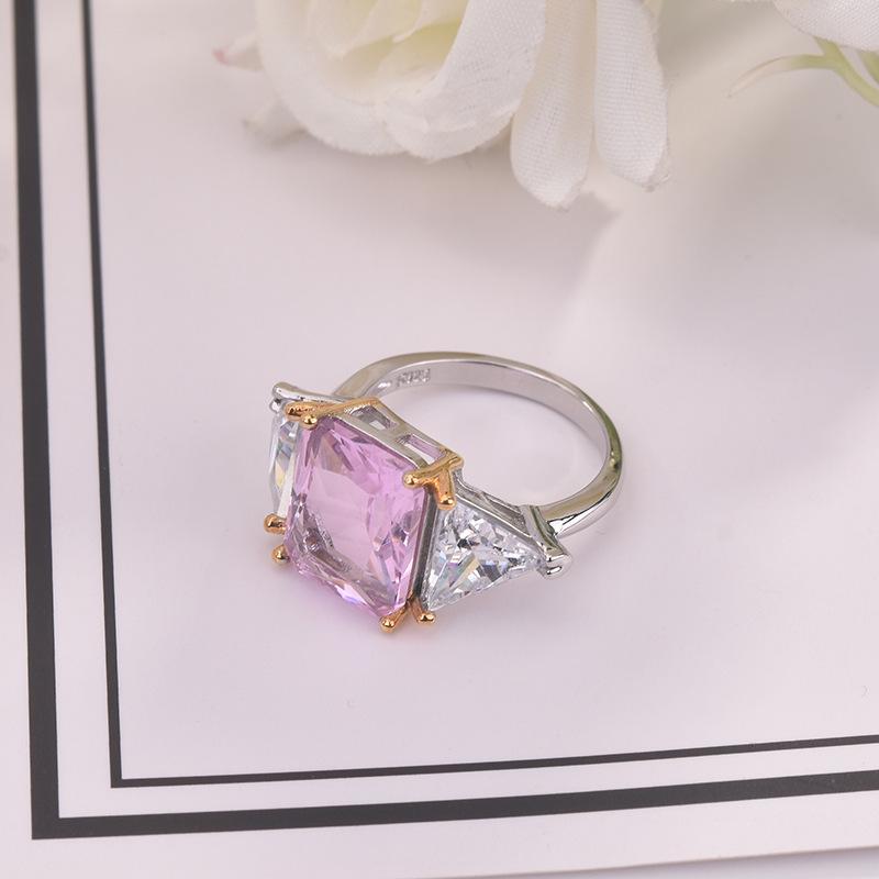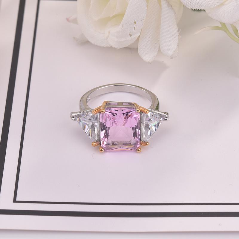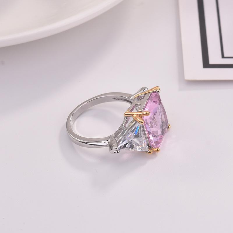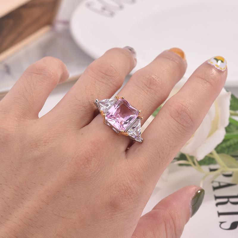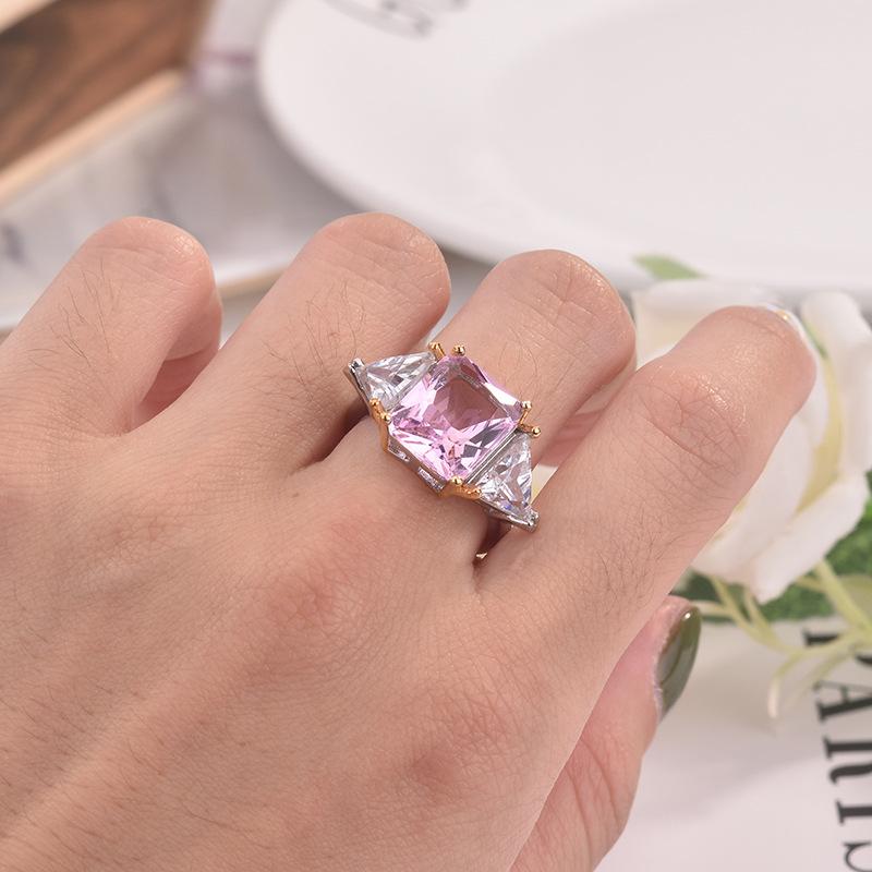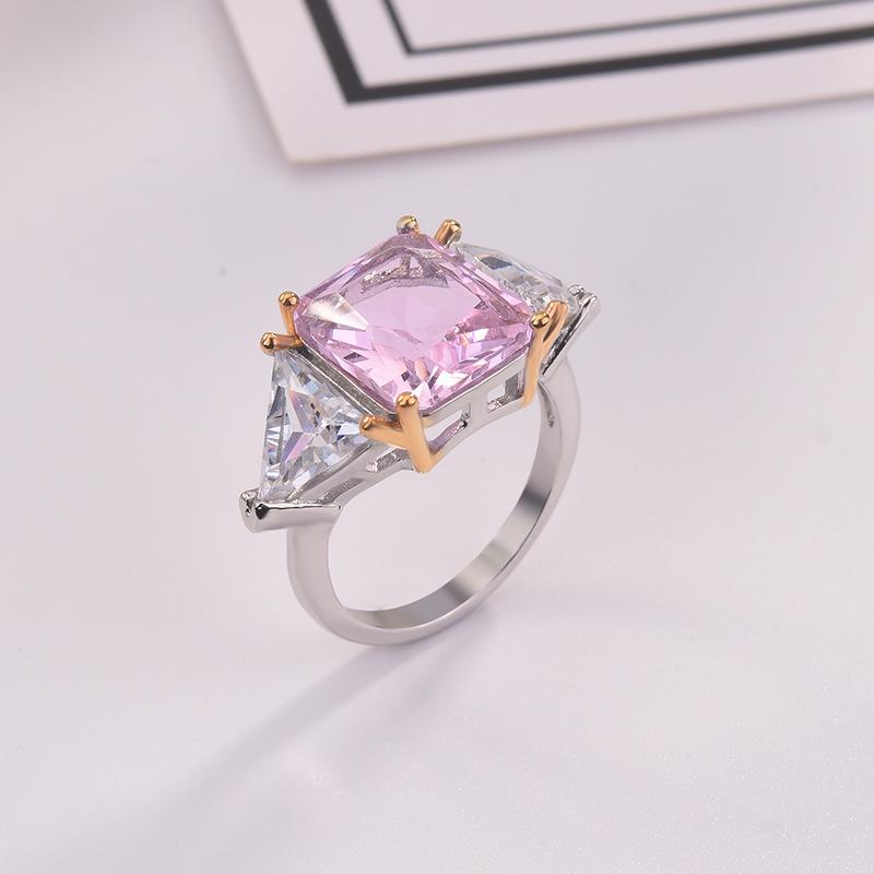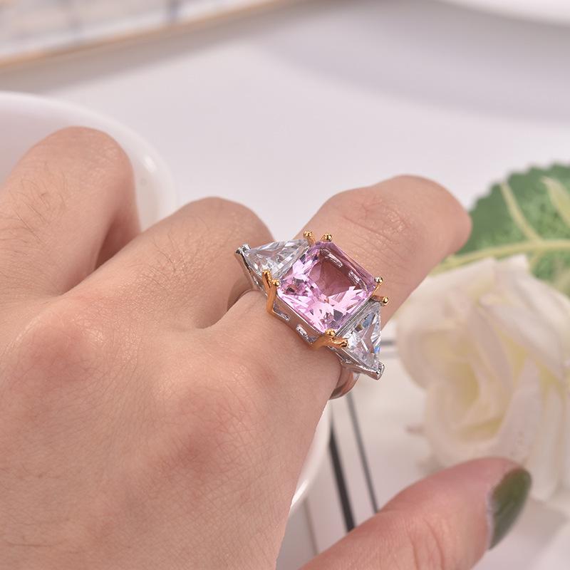 Zhenrong desea un nuevo anillo de princesa cuadrado de dos colores con diamantes rosas, anillo de compromiso con circonita de simulación triangular europea y americana.