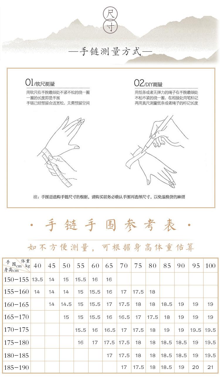 6. Nuestras pulseras se pueden personalizar según el tamaño de la muñeca del cliente. Tenga en cuenta la medida real de la muñeca al tomar la foto. Personalizaremos la longitud adecuada según el tamaño de su muñeca. Si no desea hacer ninguna observación,El tamaño de mano predeterminado es 15 cm.