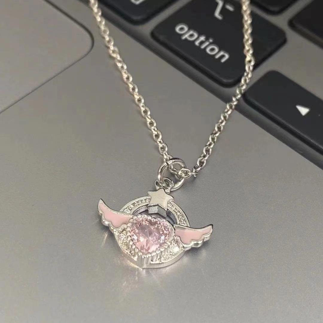 Collar de corazón de ángel de acero de titanio con temperamento dulce, cadena de clavícula con incrustaciones de diamantes rosas para mujer, estilo coreano, collar de celebridades de Internet que combina con todo, accesorios