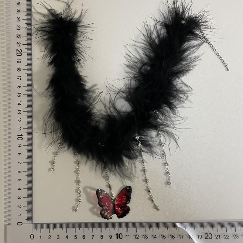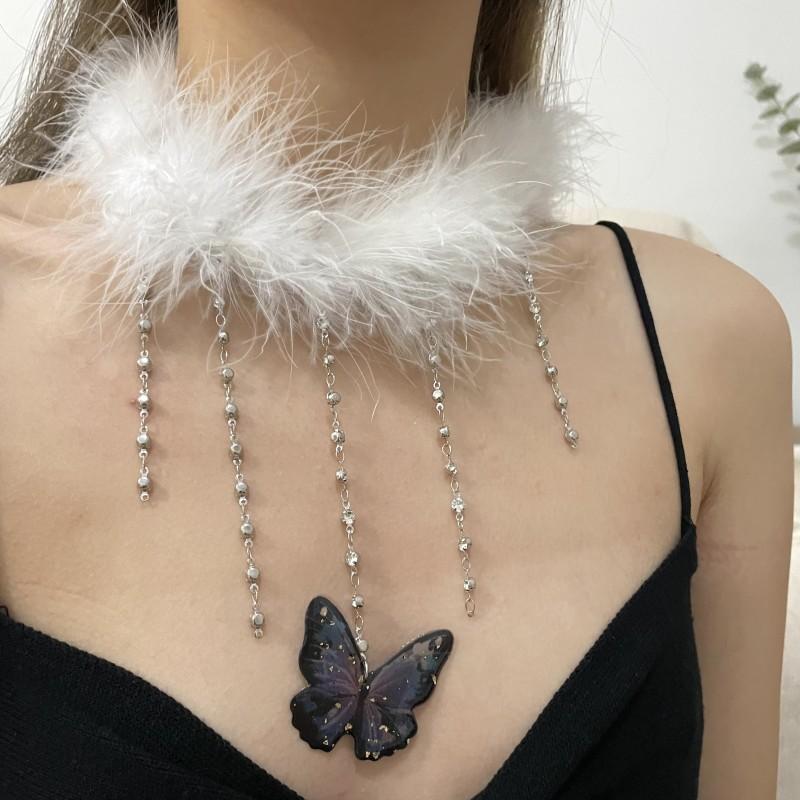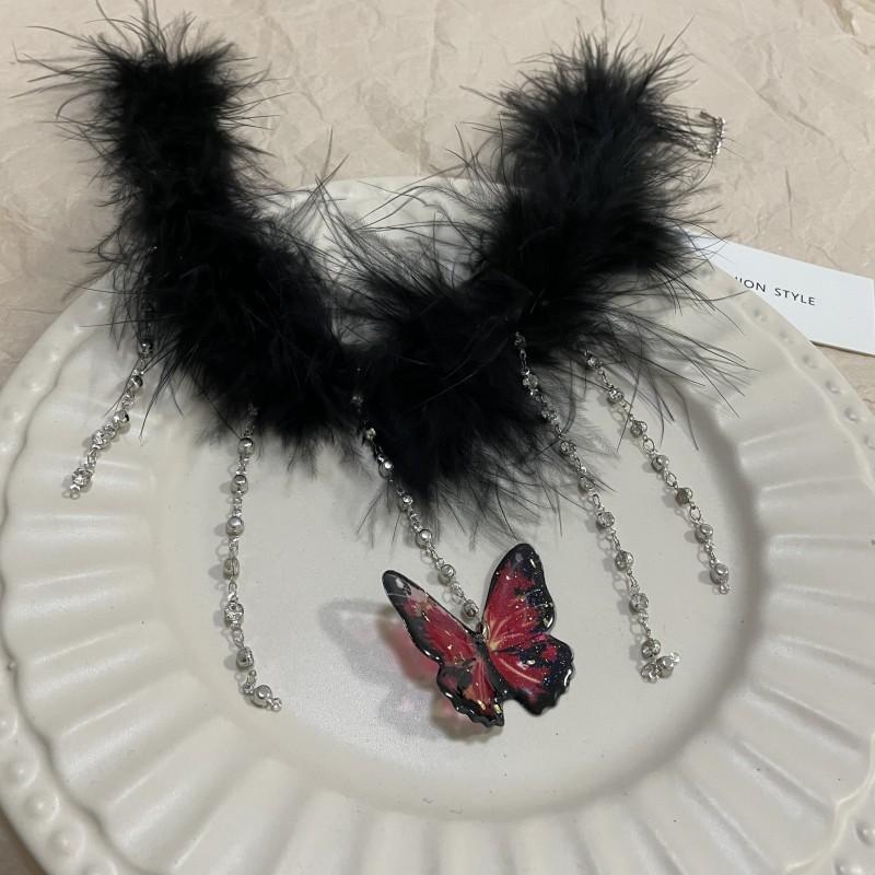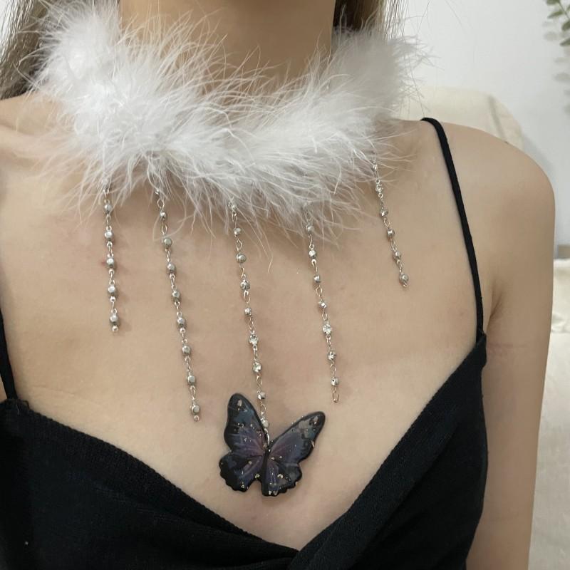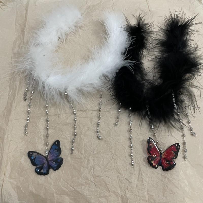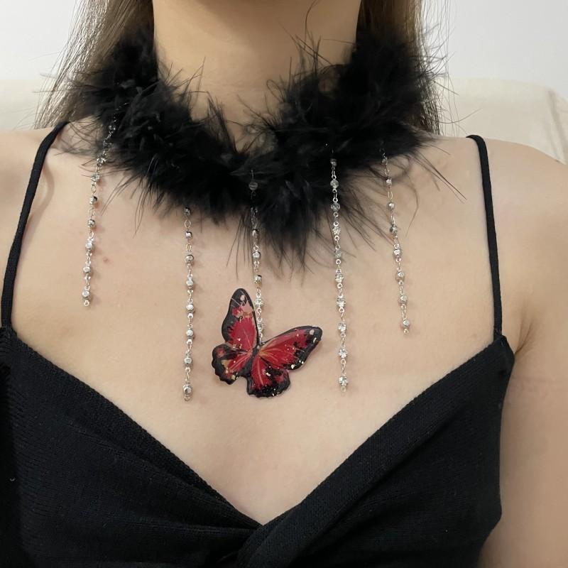 Black plush tassel butterfly necklace, White plush tassel butterfly necklace