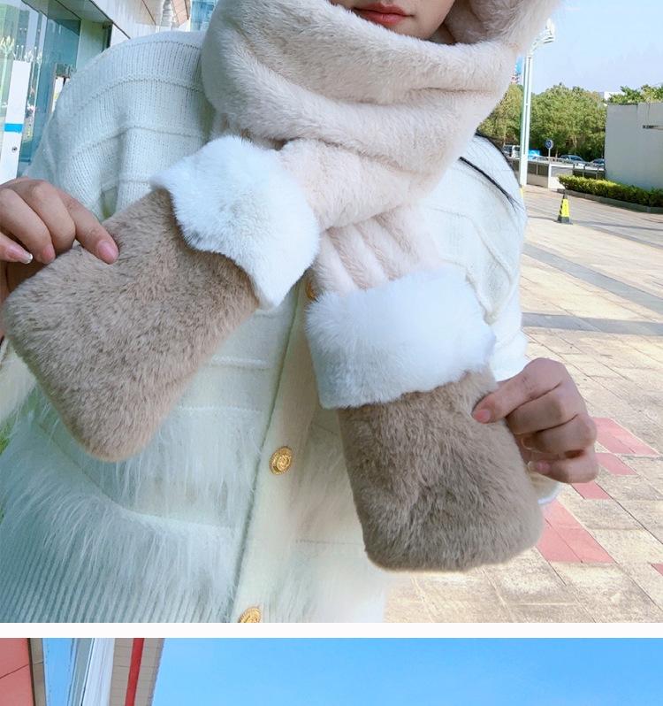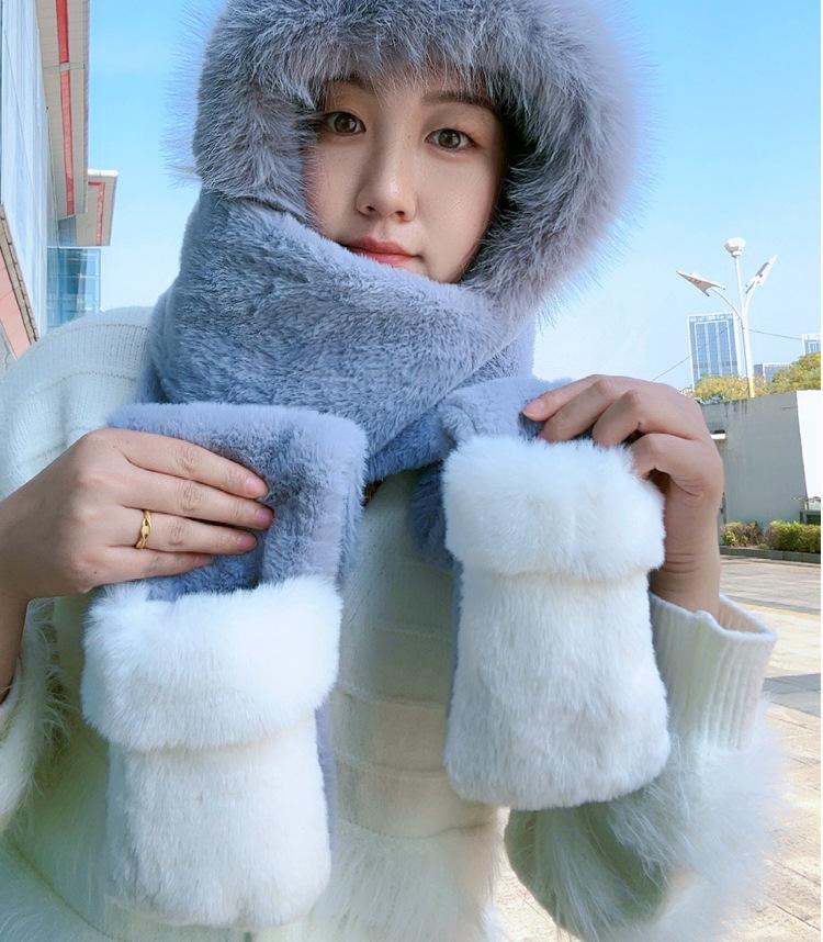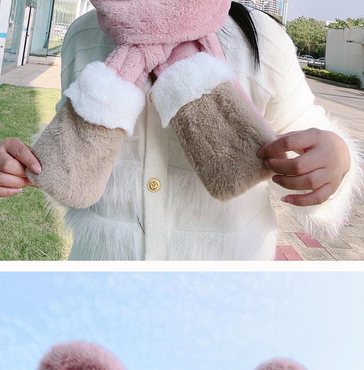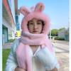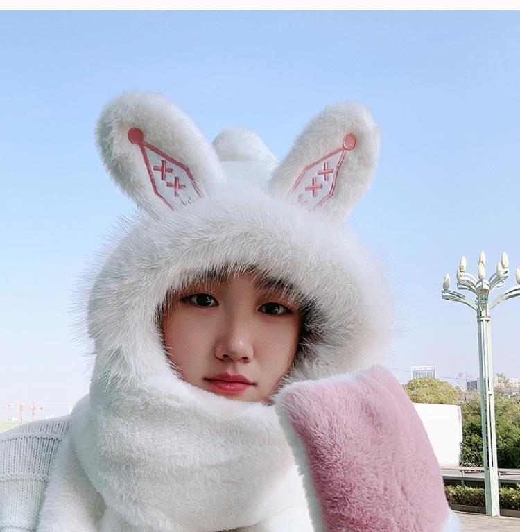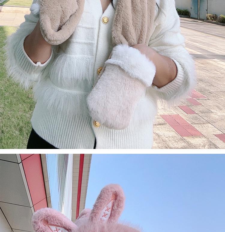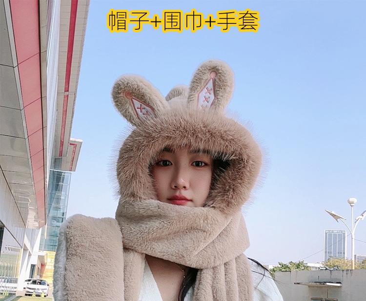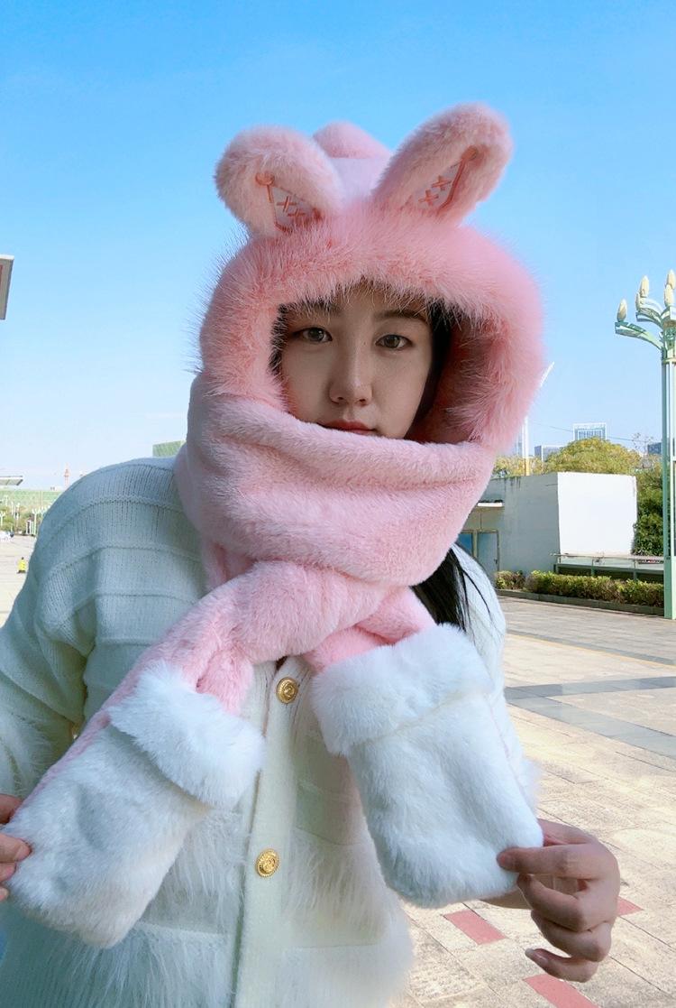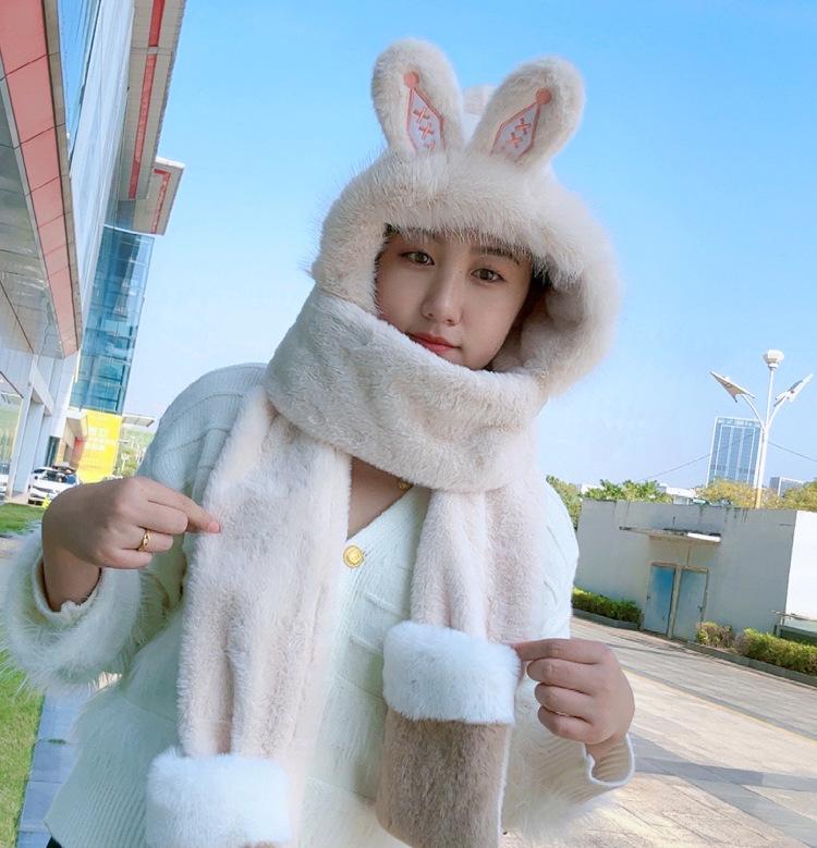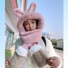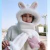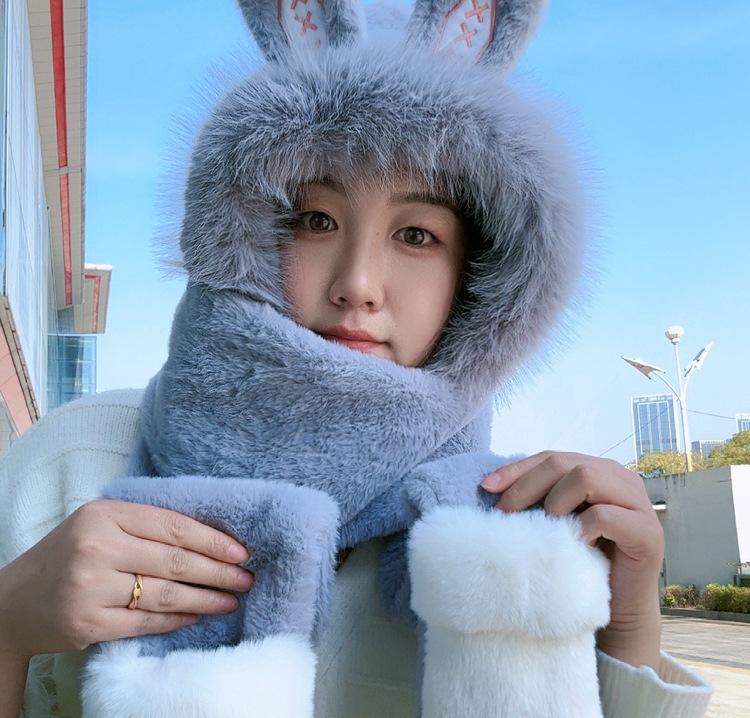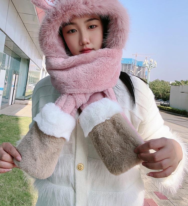 Invierno Felpa Espesado Sombrero Bufanda Guantes Conjunto de Tres Piezas Almacenamiento Cálido Lindo Conejo Cuello Capucha de Una Pieza