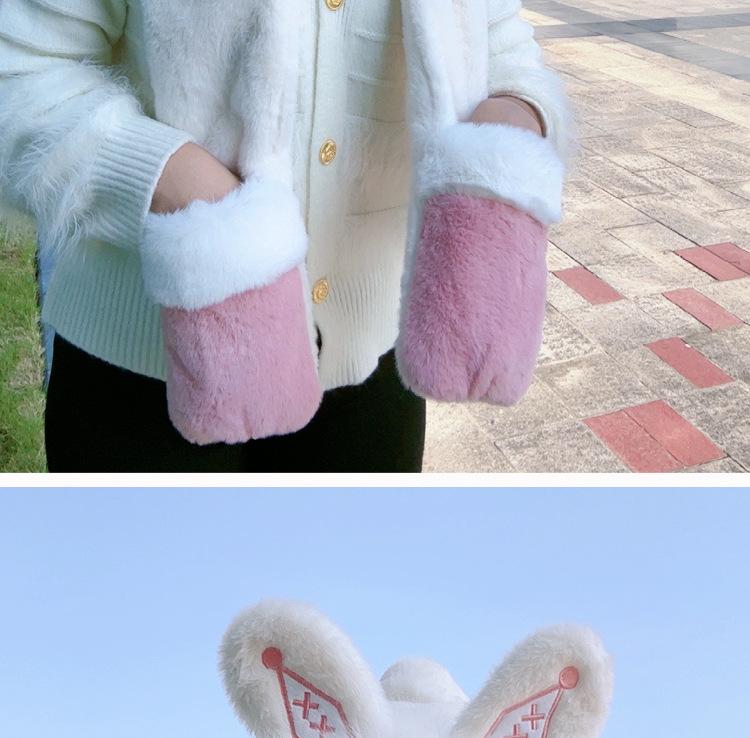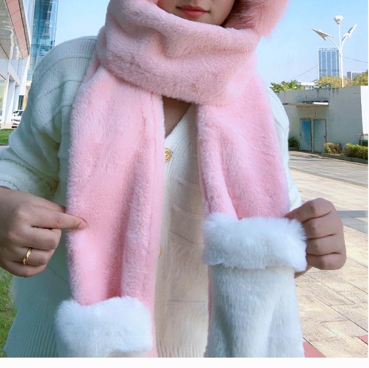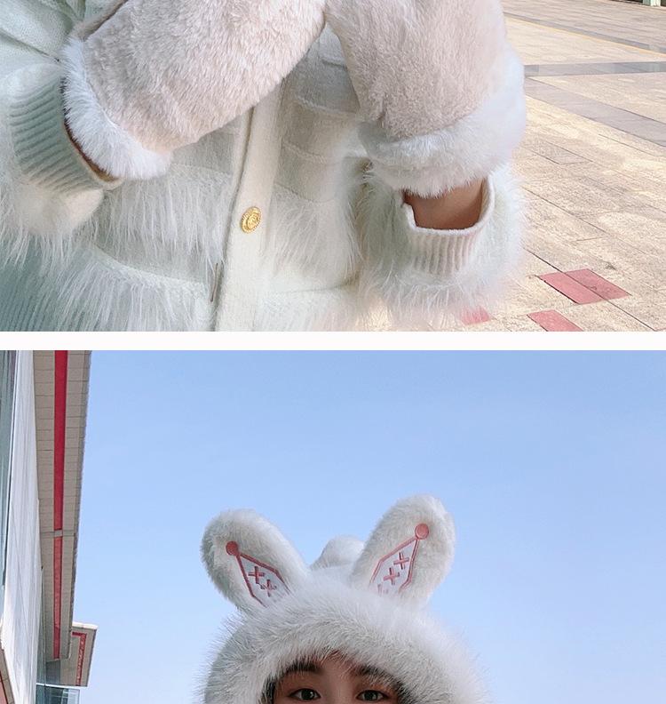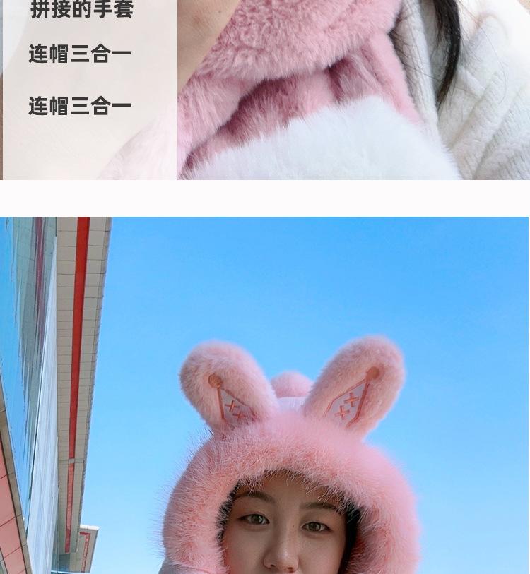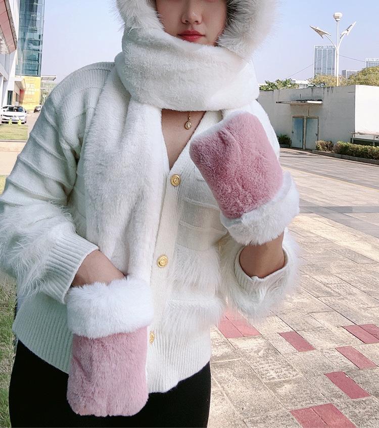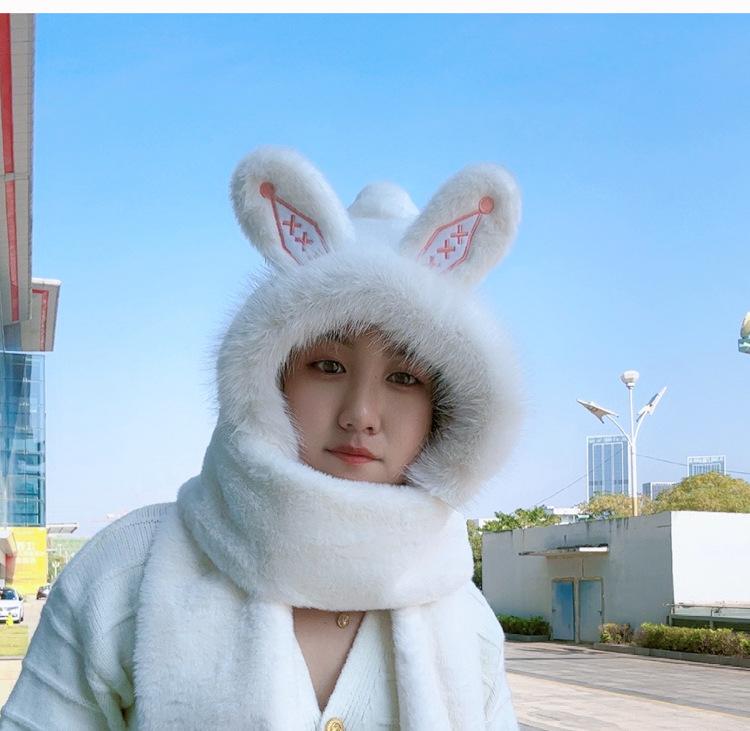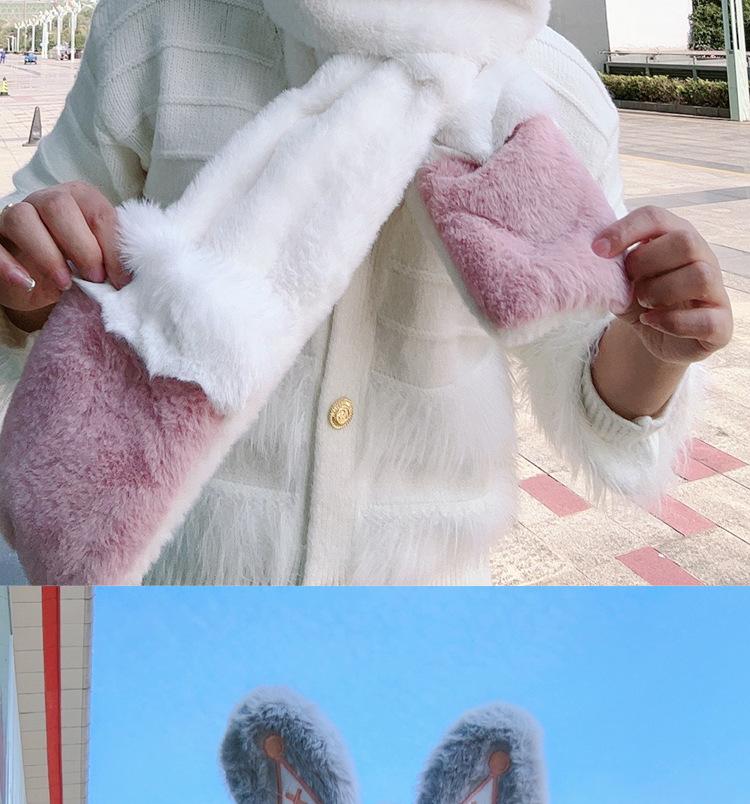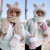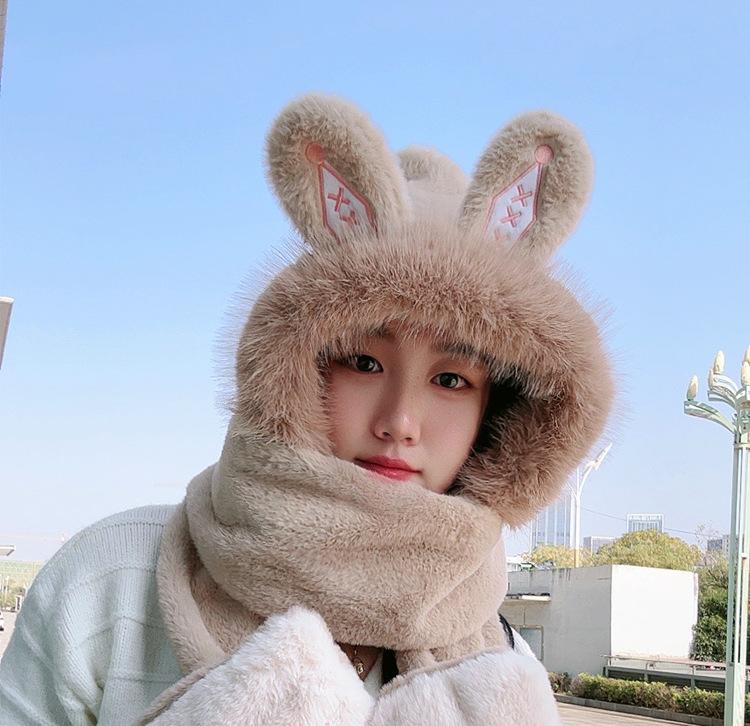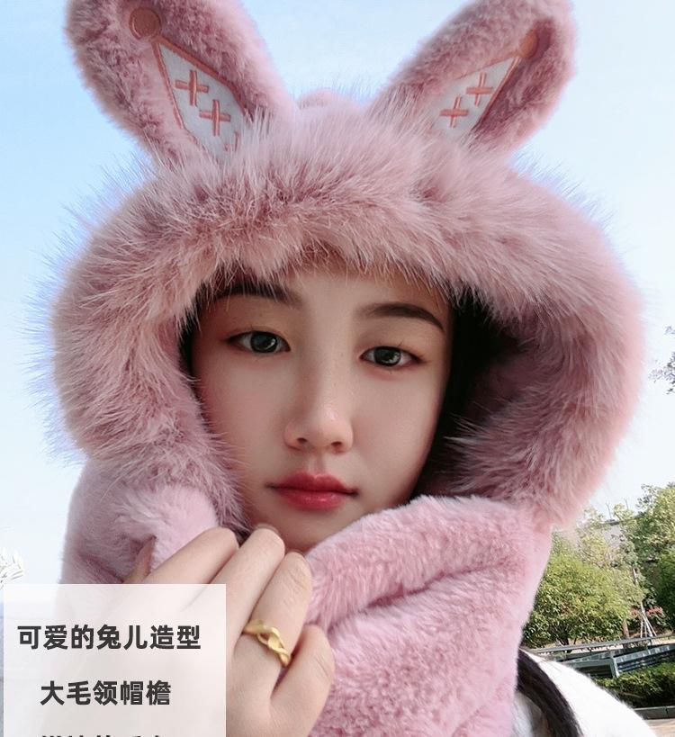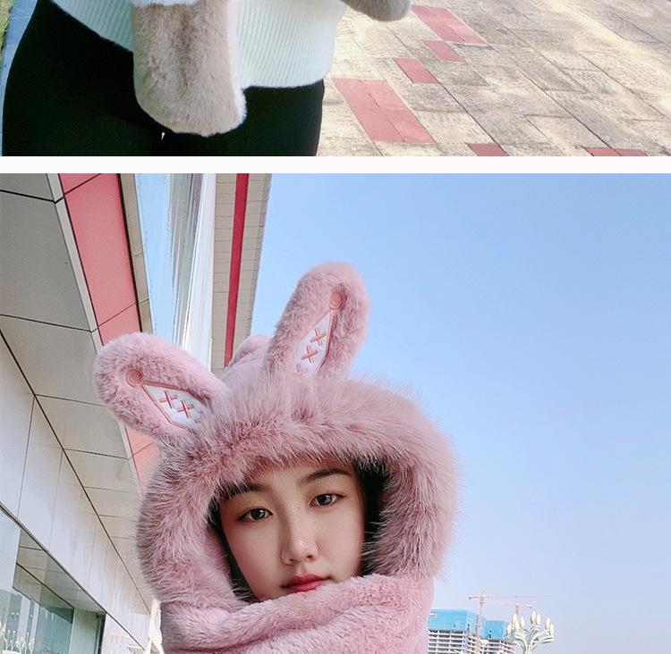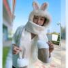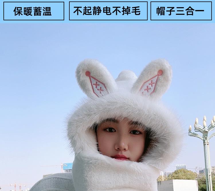 Invierno Felpa Espesado Sombrero Bufanda Guantes Conjunto de Tres Piezas Almacenamiento Cálido Lindo Conejo Cuello Capucha de Una Pieza