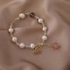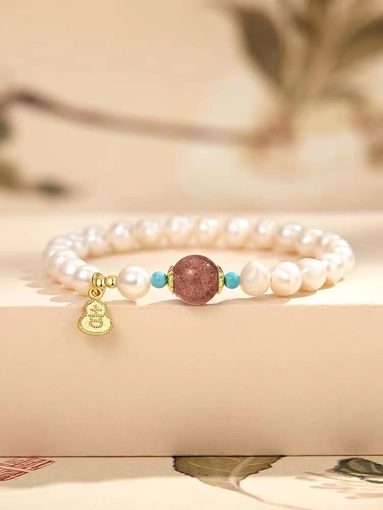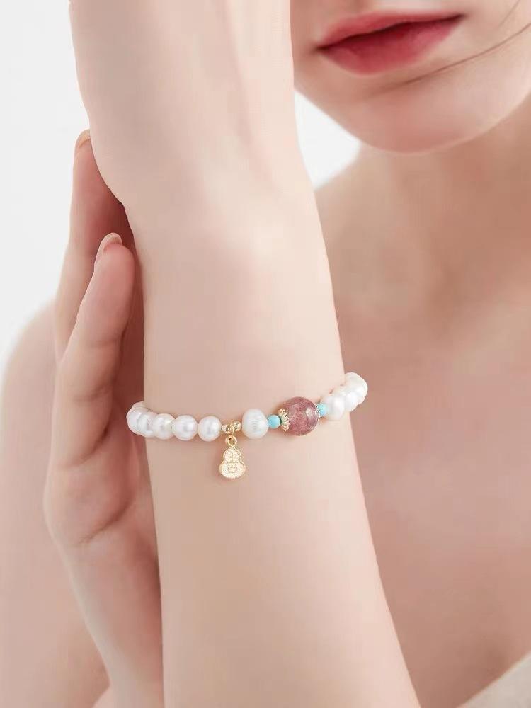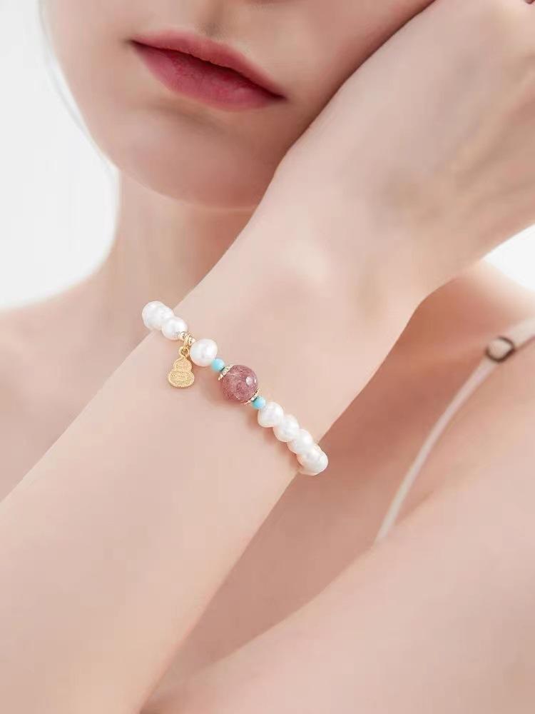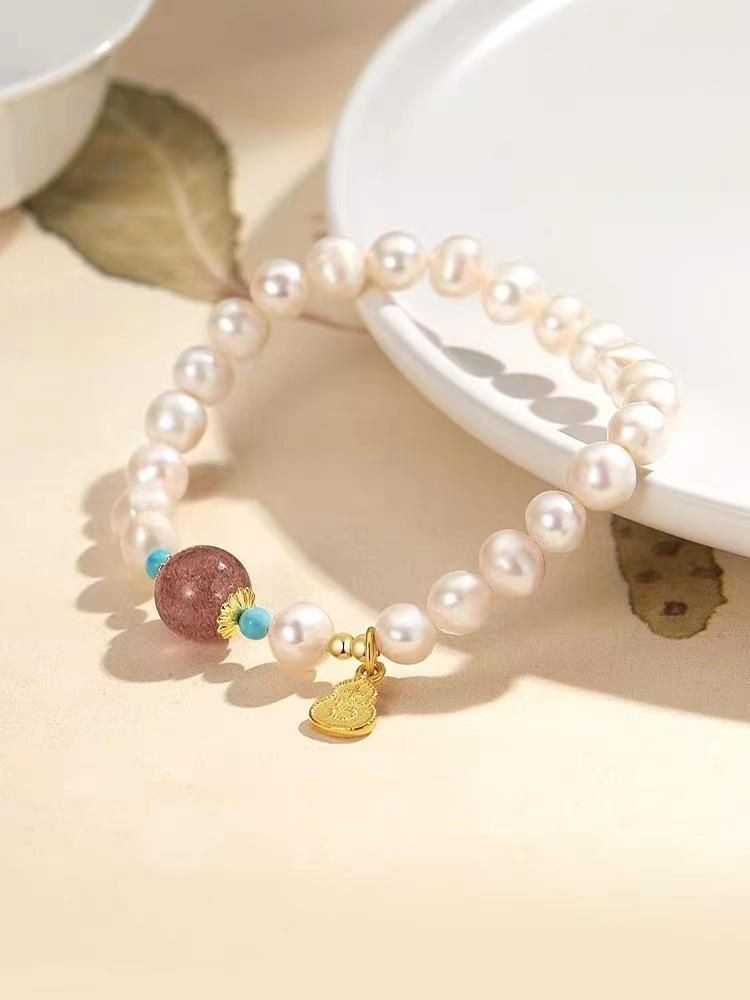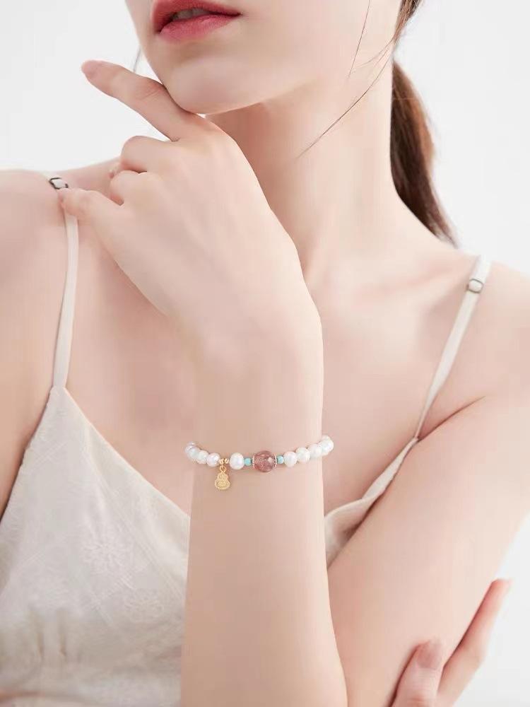 Pulsera Ji de perla de agua dulce natural para mujer, pulsera de cristal de fresa, pulsera de cuentas de nicho de lujo ligero para niñas y novias