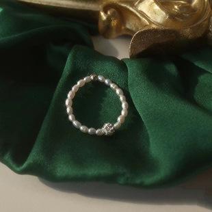 Anillo de bola de cristal de perla con diseño de nicho estilo Ins para mujer que no se desvanece, simple y versátil, anillo elástico de estilo lujoso y fresco.
