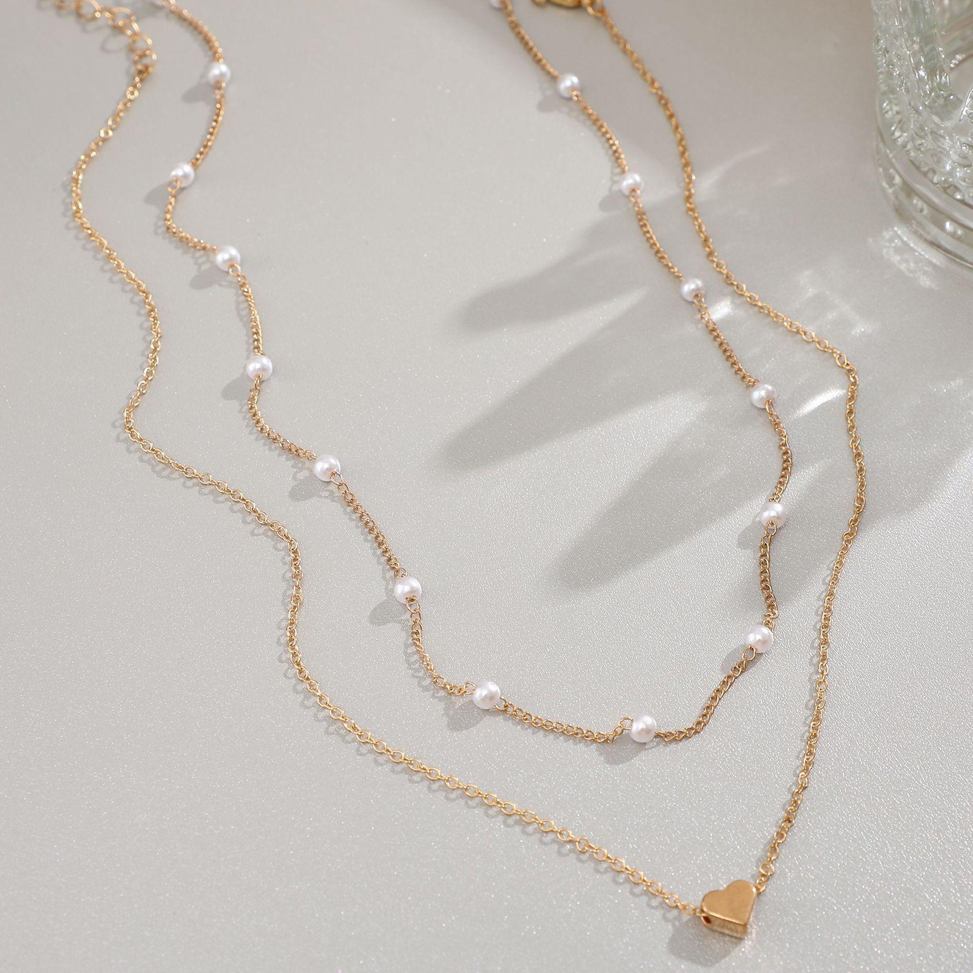 Collar Europeo y Americano Transfronterizo de Doble Capa Más Vendido Collar Creativo Simple Estilo Callejero Cobre Corazón de Durazno Perla Imitación Cadena Clavícula Multicapa