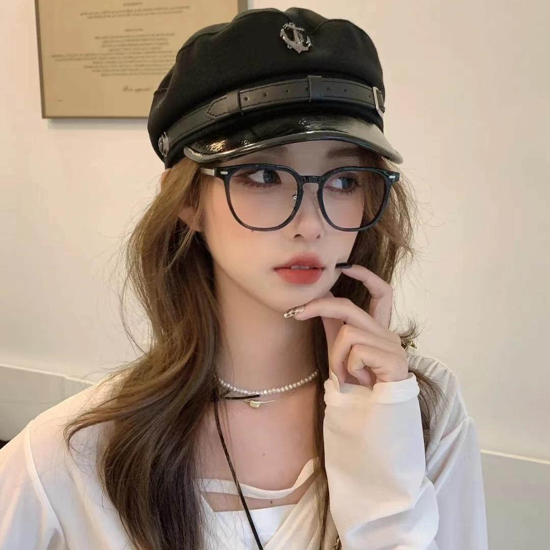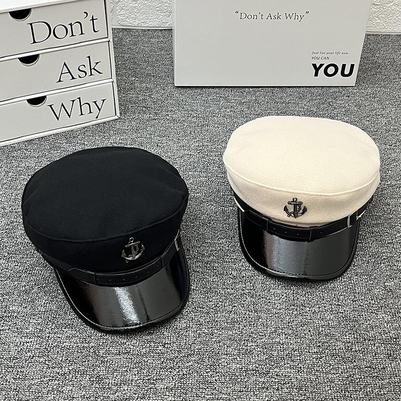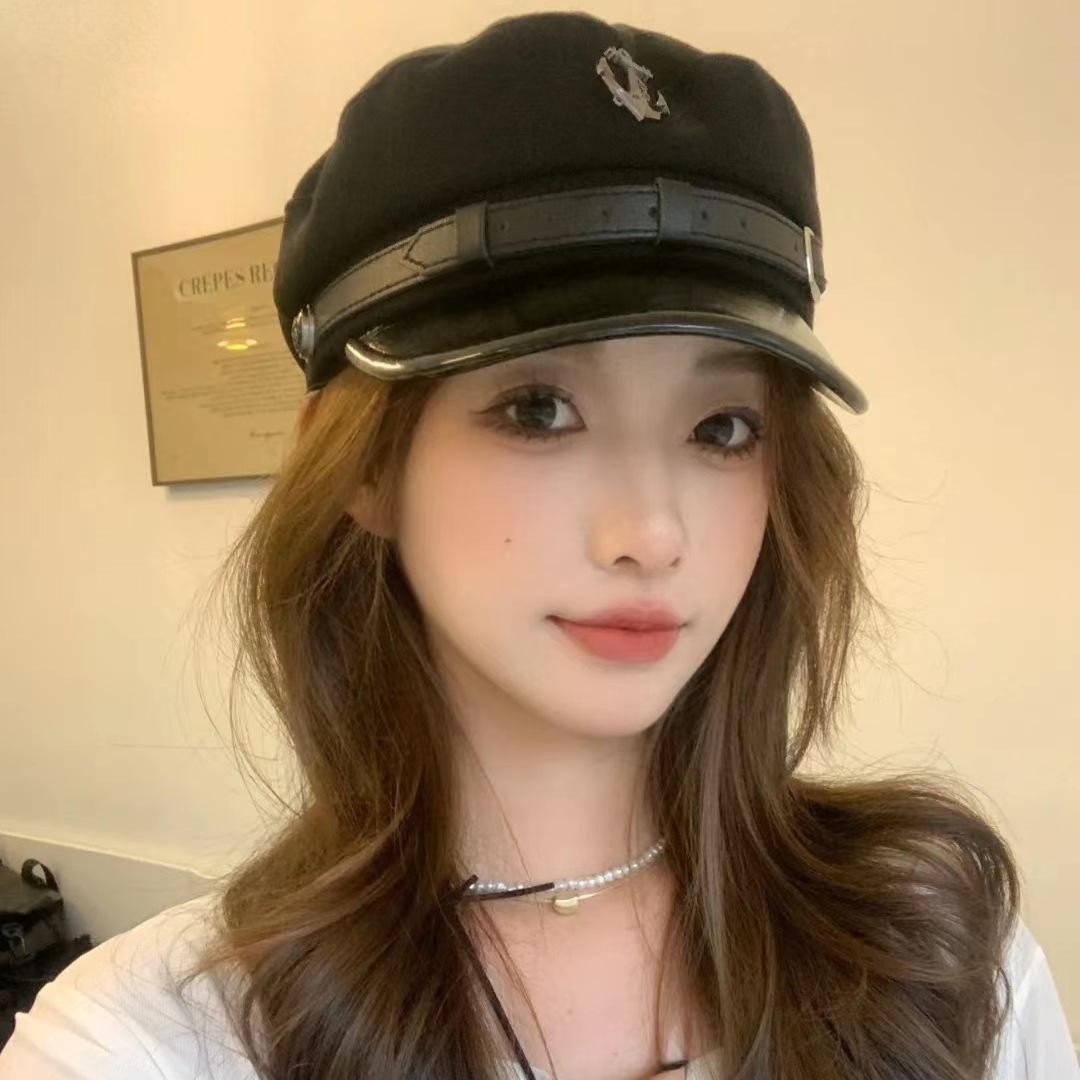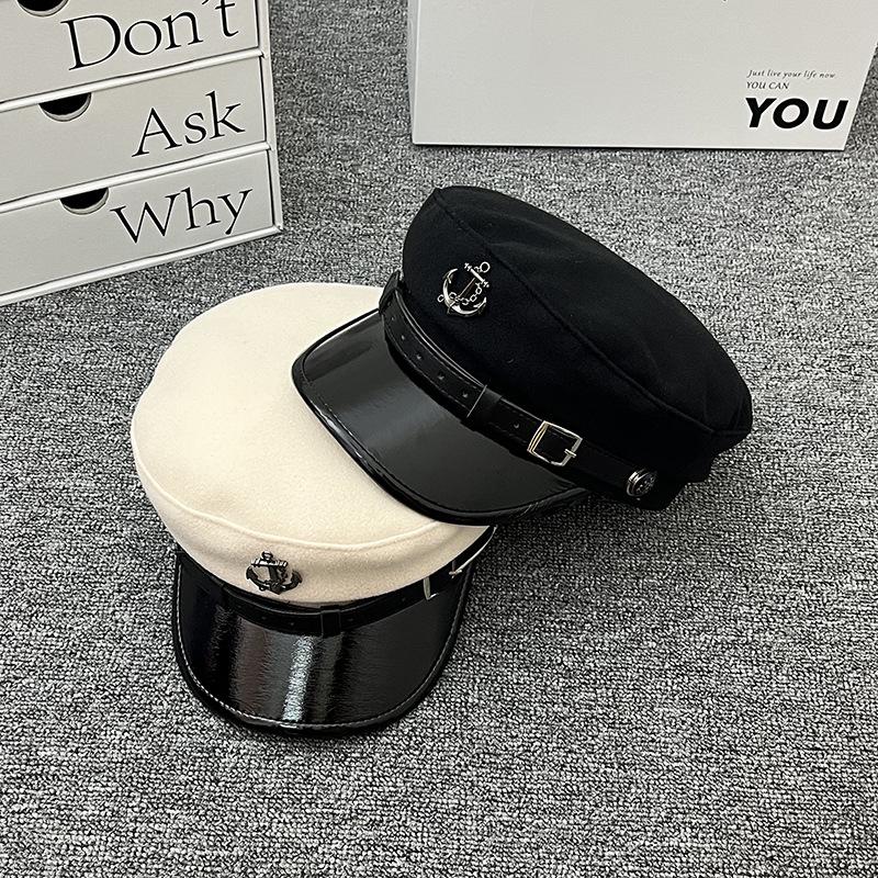 Otoño e Invierno lana estilo Navy sombrero octogonal femenino coreano retro ins boina de marinero nicho PU cuero sombrero militar moda
