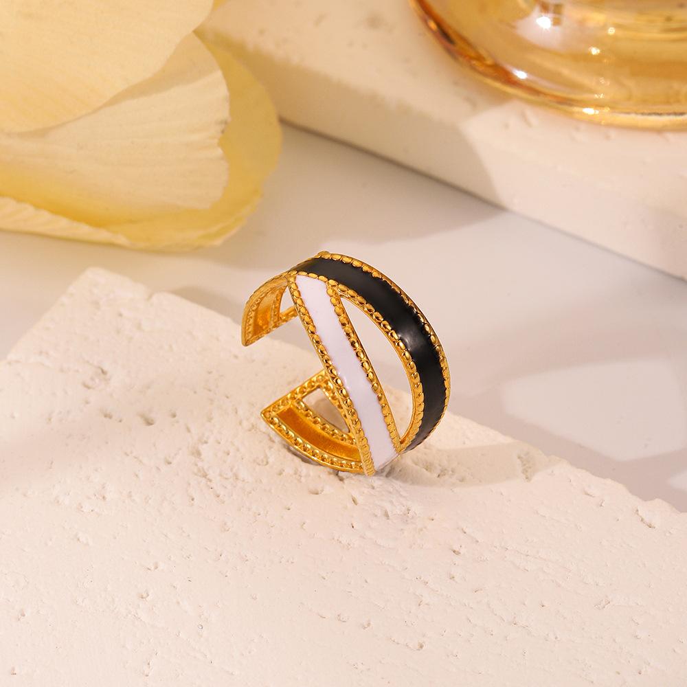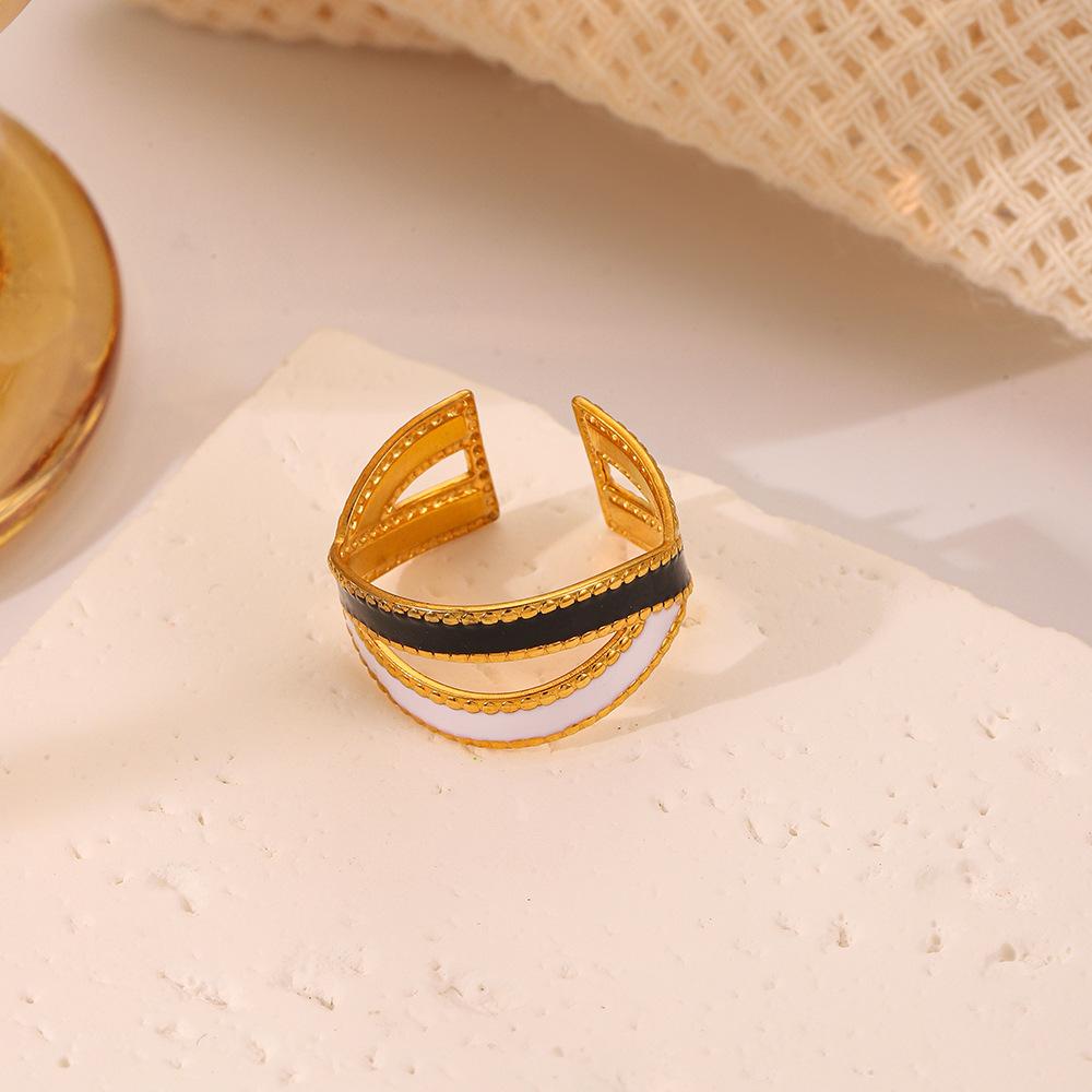 Anillo cruzado con goteo en blanco y negro abierto de oro de acero inoxidable combinable de nueva moda francesa, venta directa de fábrica para mujer