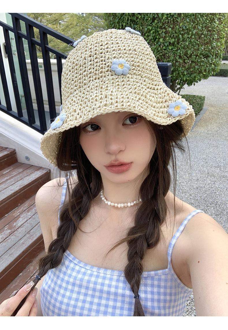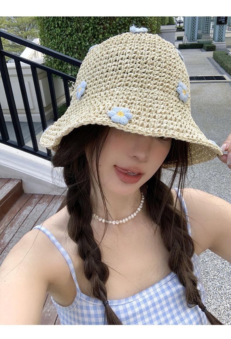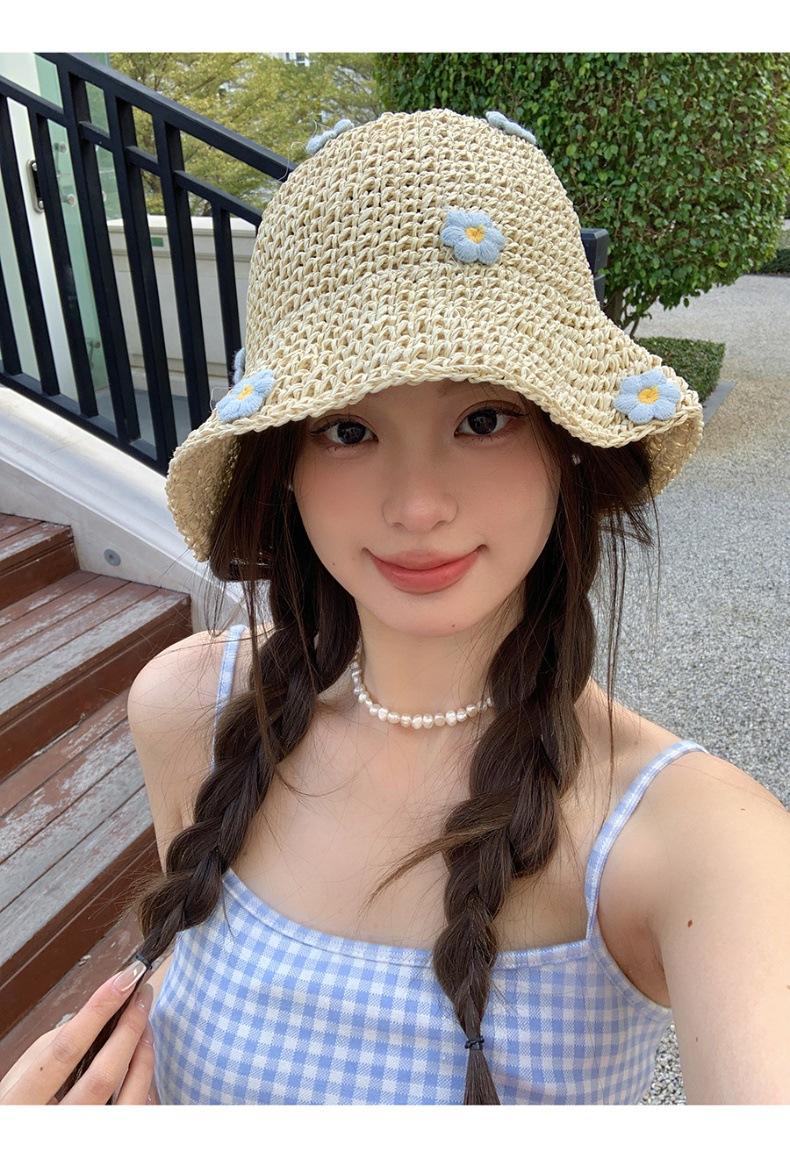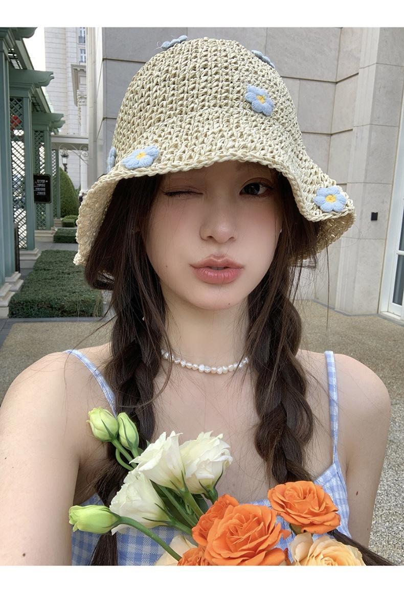 Sombrero de pescador de paja de flores para mujer primavera y verano hueco transpirable protección solar sombrero de paja sombrero de cubo que hace que la cara se vea pequeña sombrero de cuenco